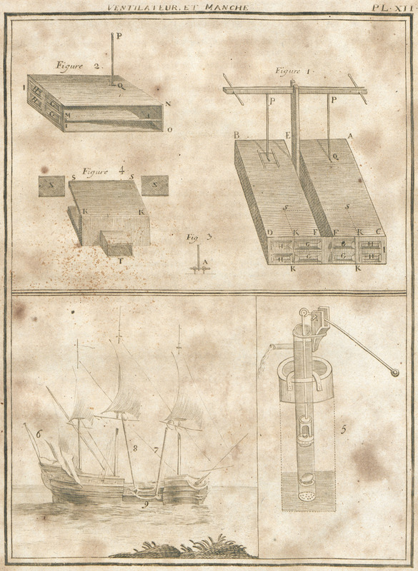 1ere ill. : présentation des éléments du ventilateur introduit dans un navire, 2eme ill. : présentation d'un navire de profil avec les différentes arrivées d'air, 3eme ill. : éléments composant une pompe aspirante