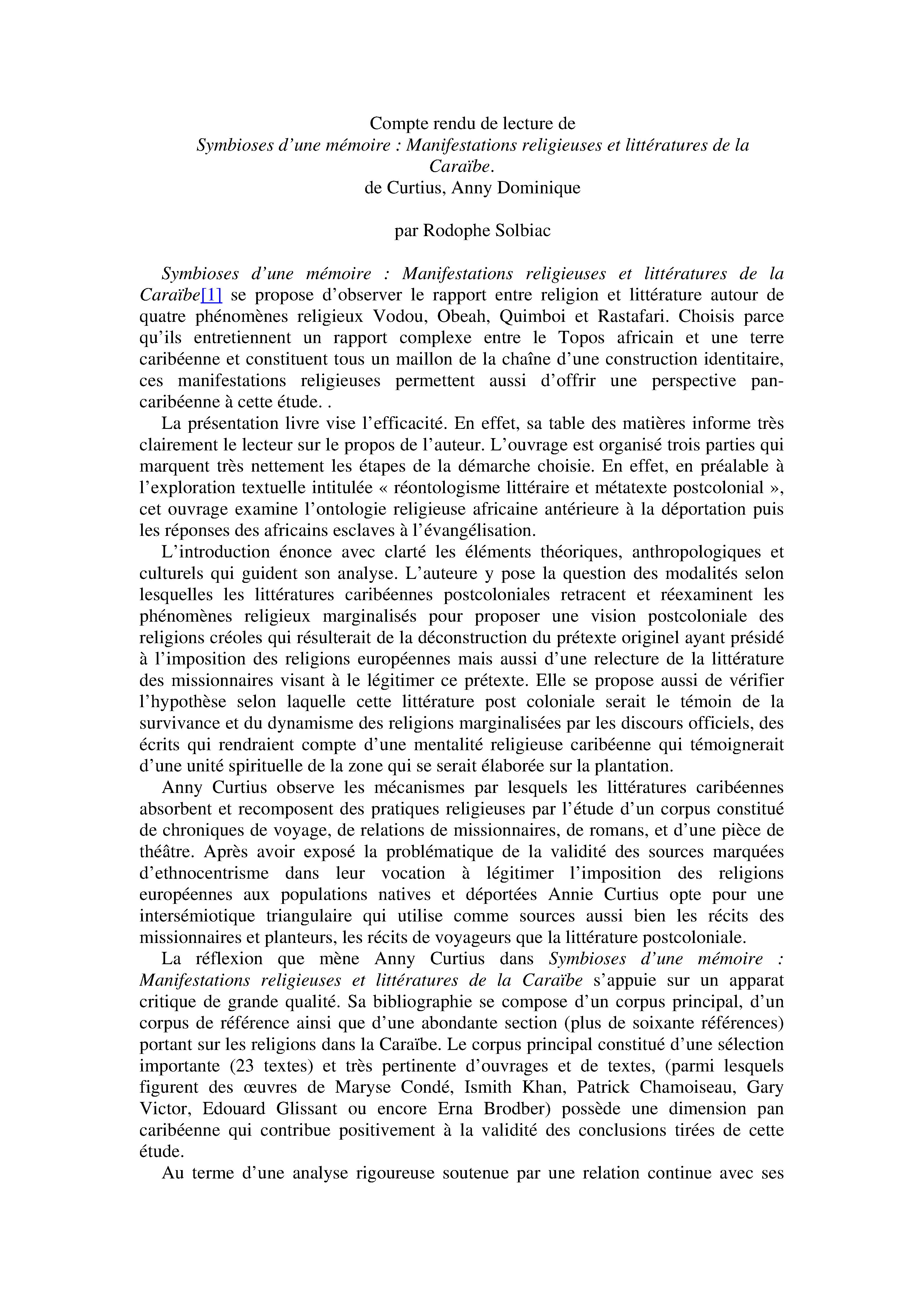 Compte rendu de lecture de Symbioses d'une mémoire : manifestations religieuses et littératures de la Caraïbe de Curtius, Anny Dominique
