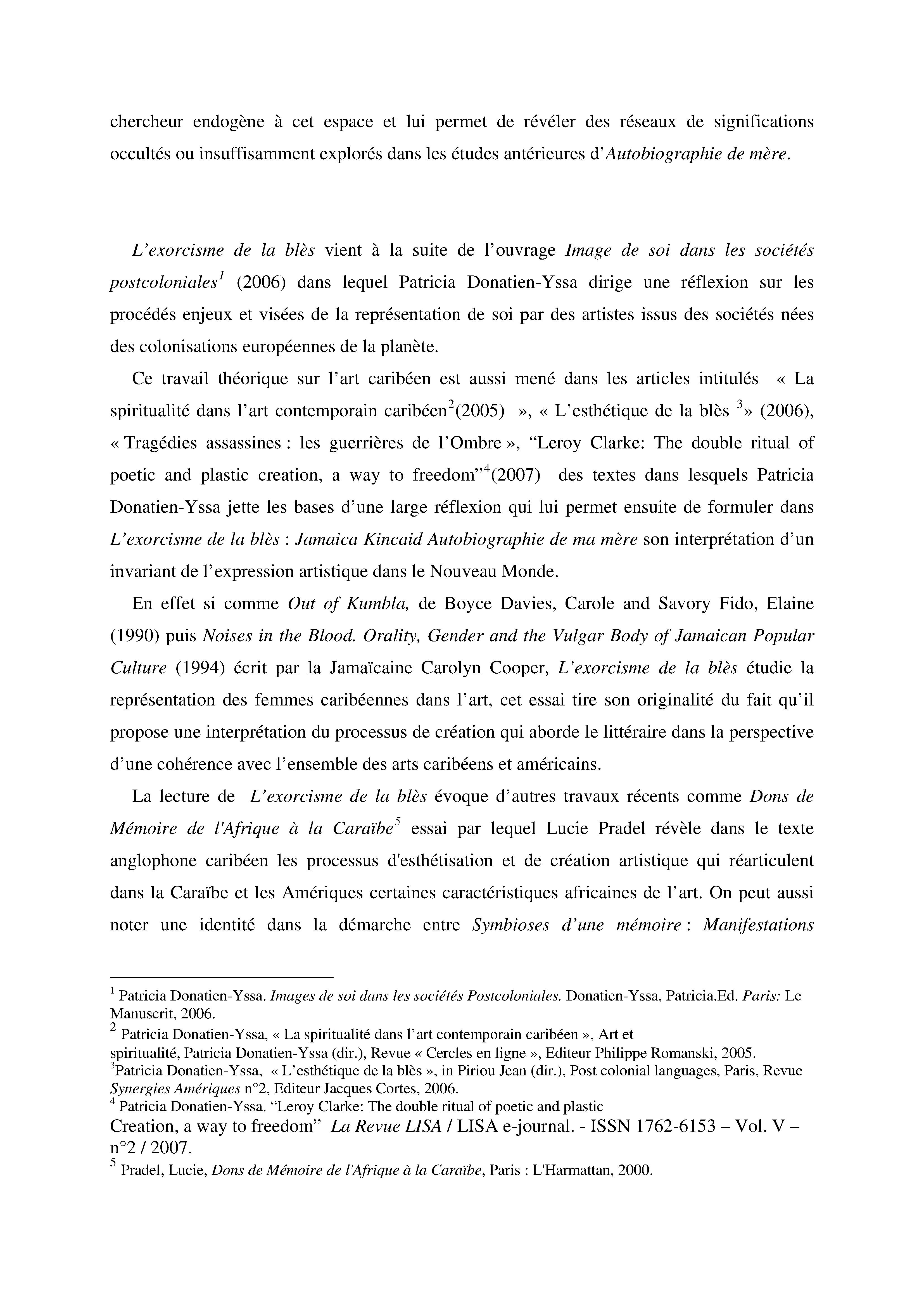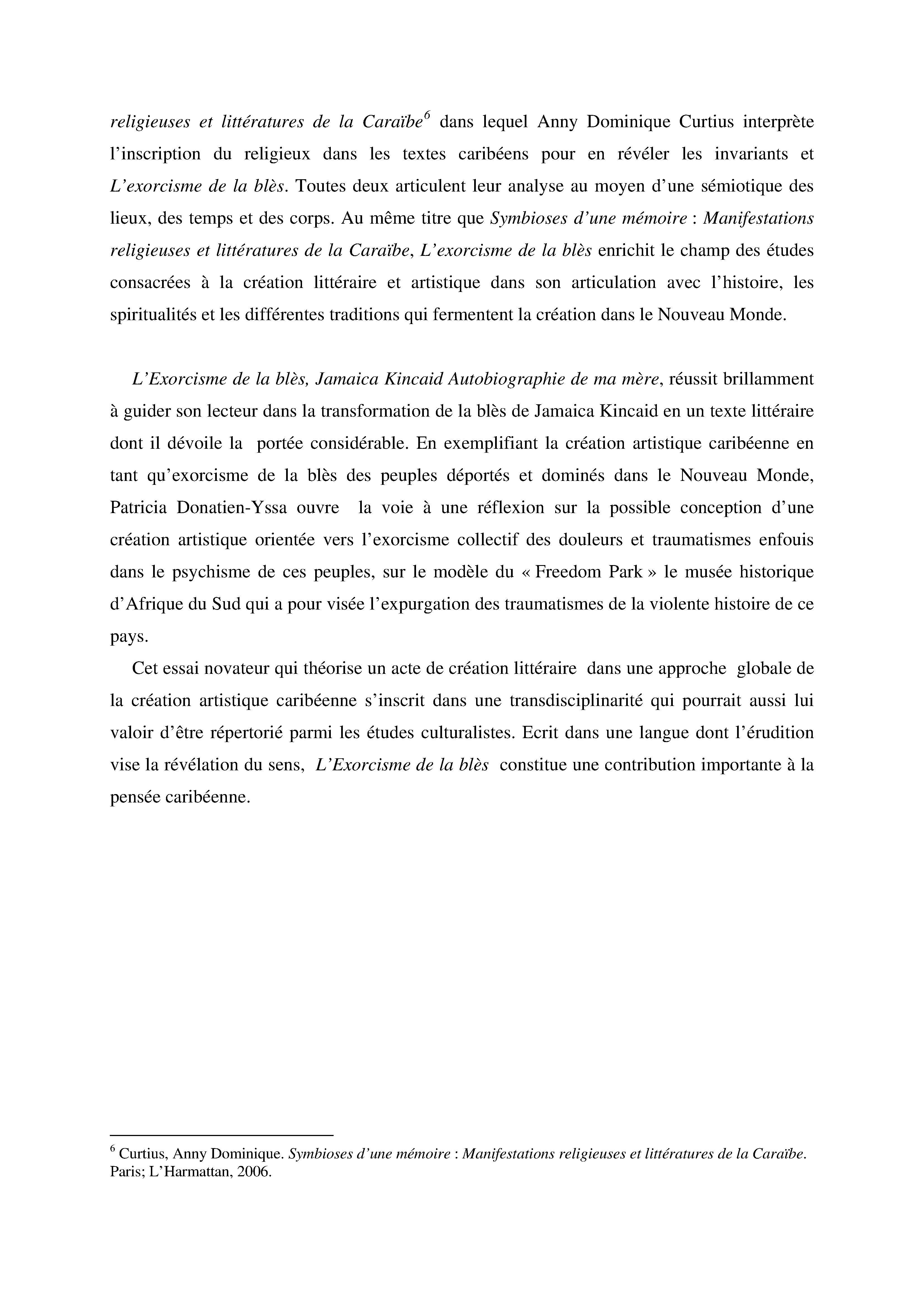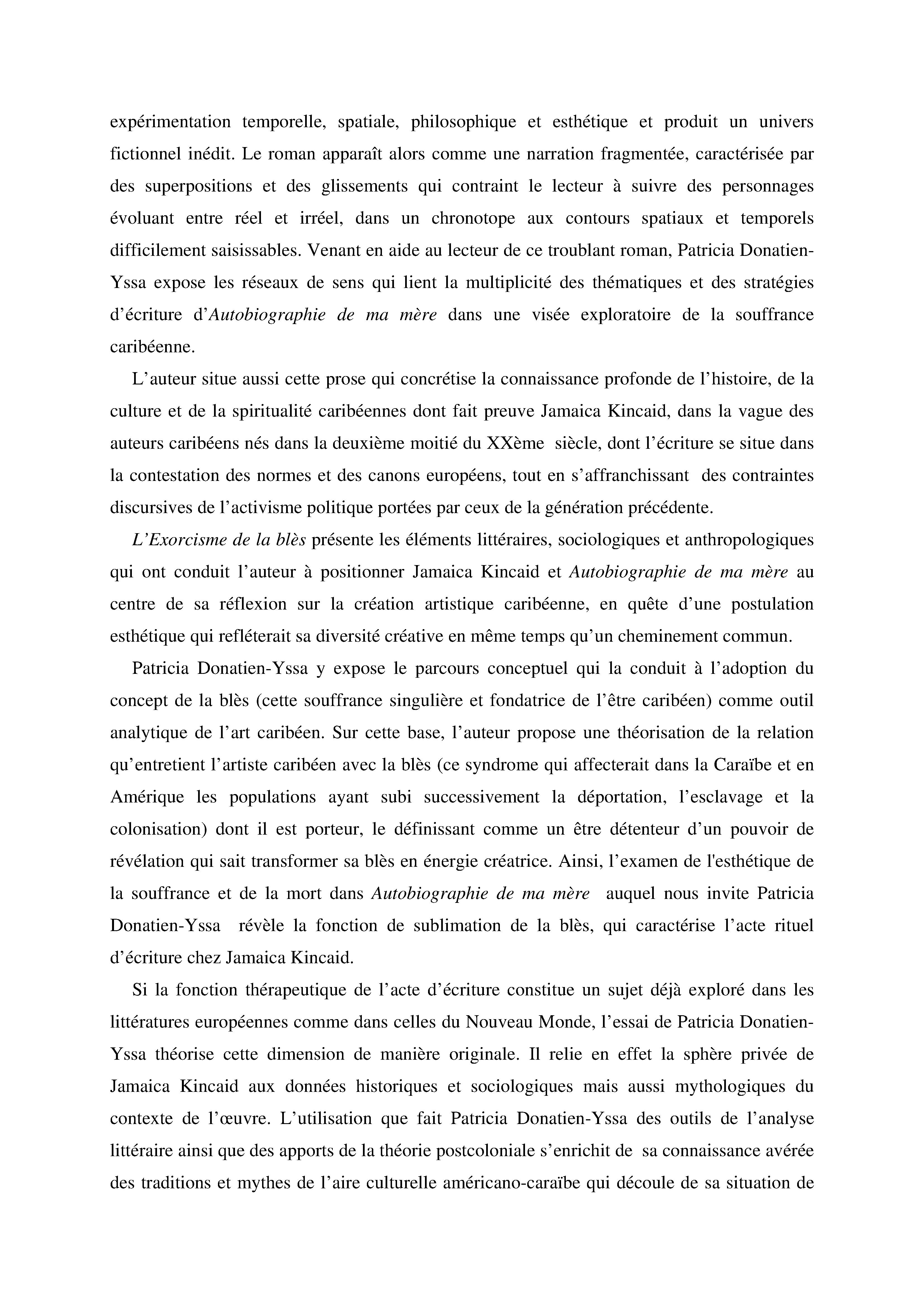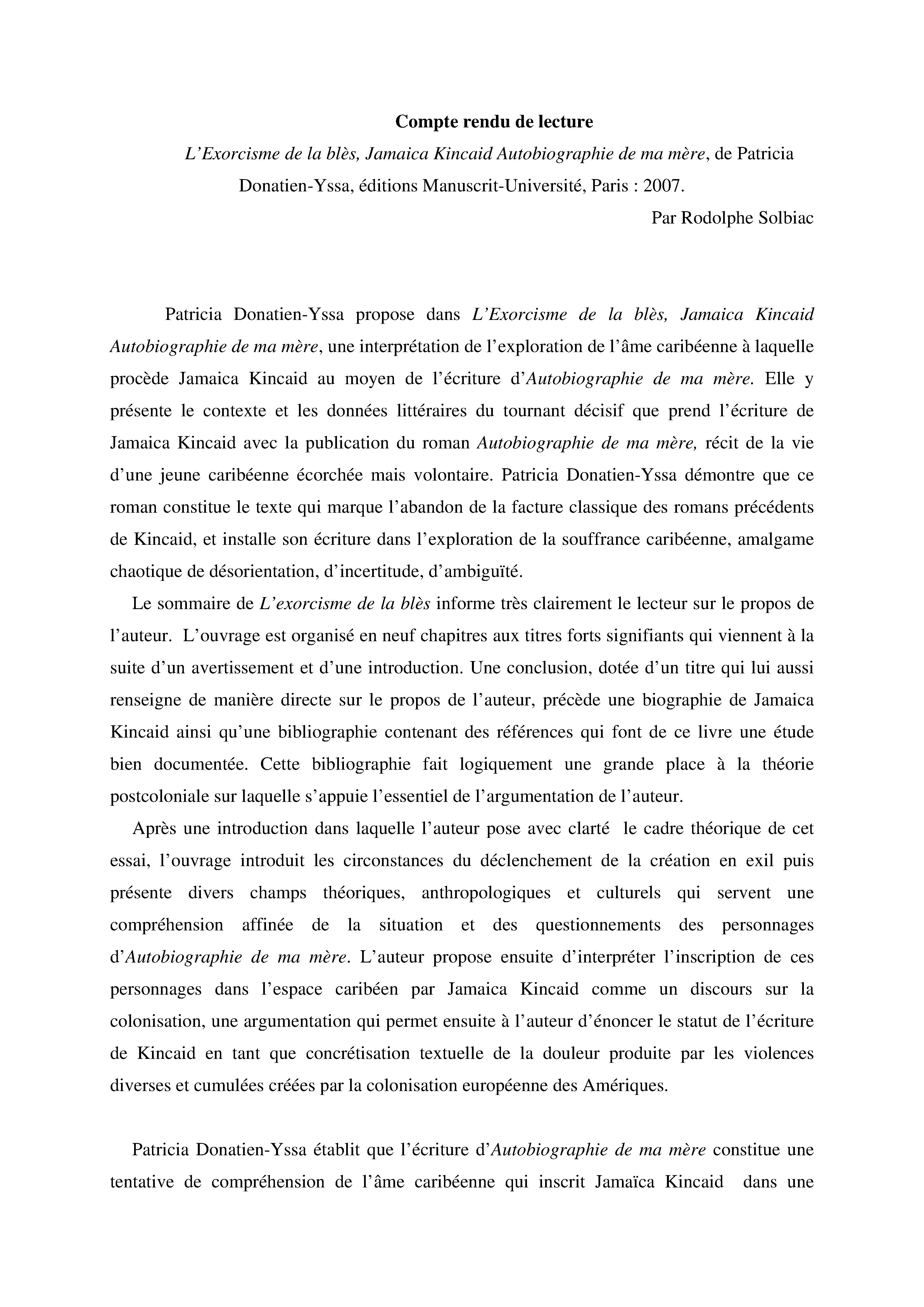 Compte rendu de lecture : l'Exorcisme de la blès, Jamaica Kincaid Autobiographie de ma mère, de Patricia Donatien-Yssa