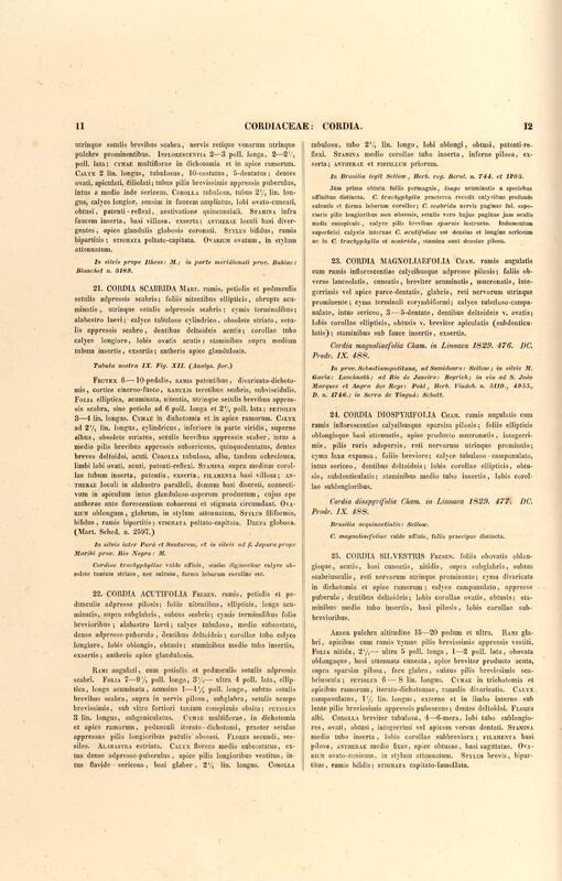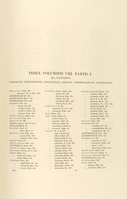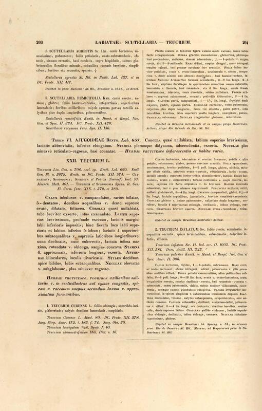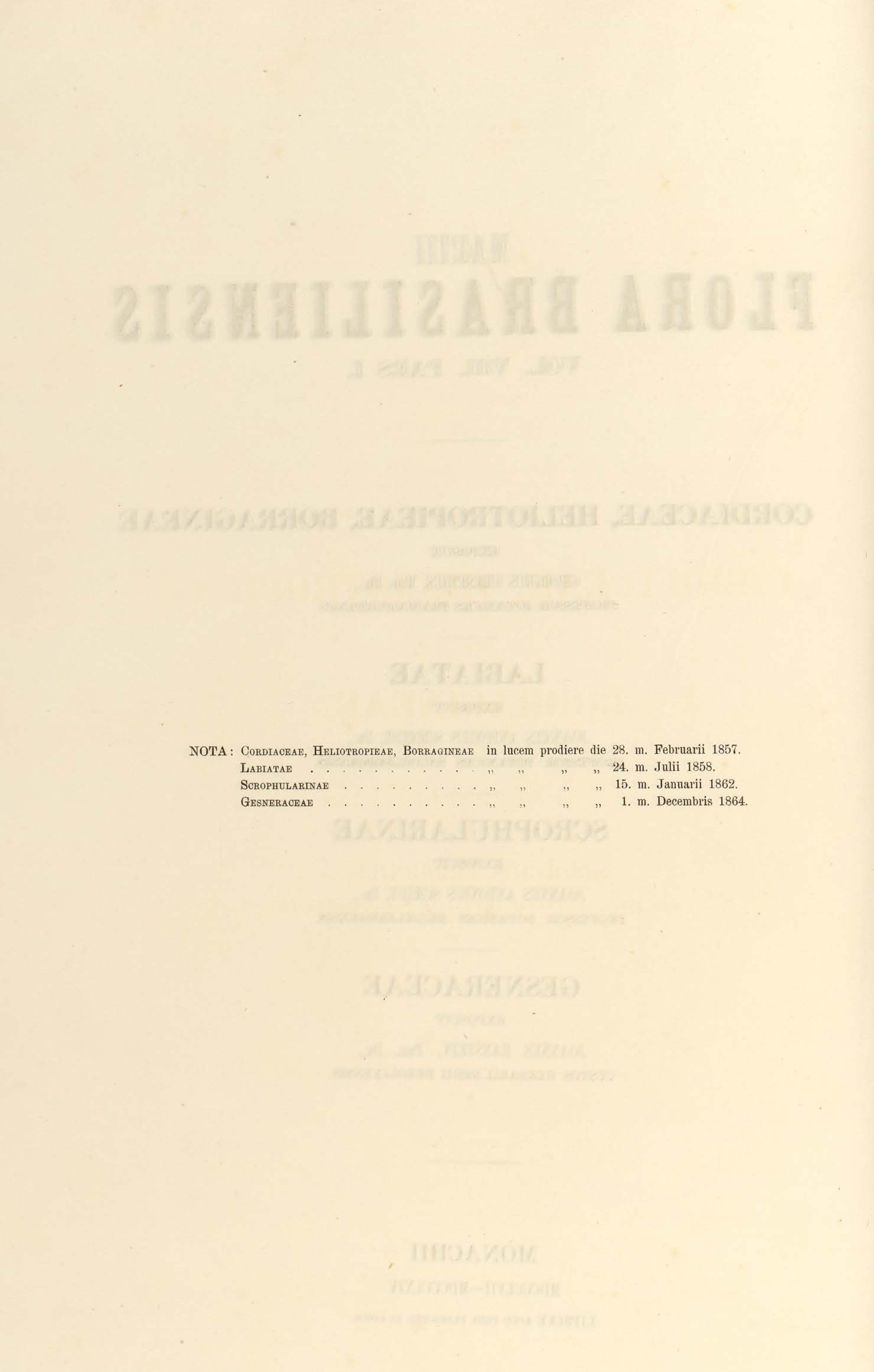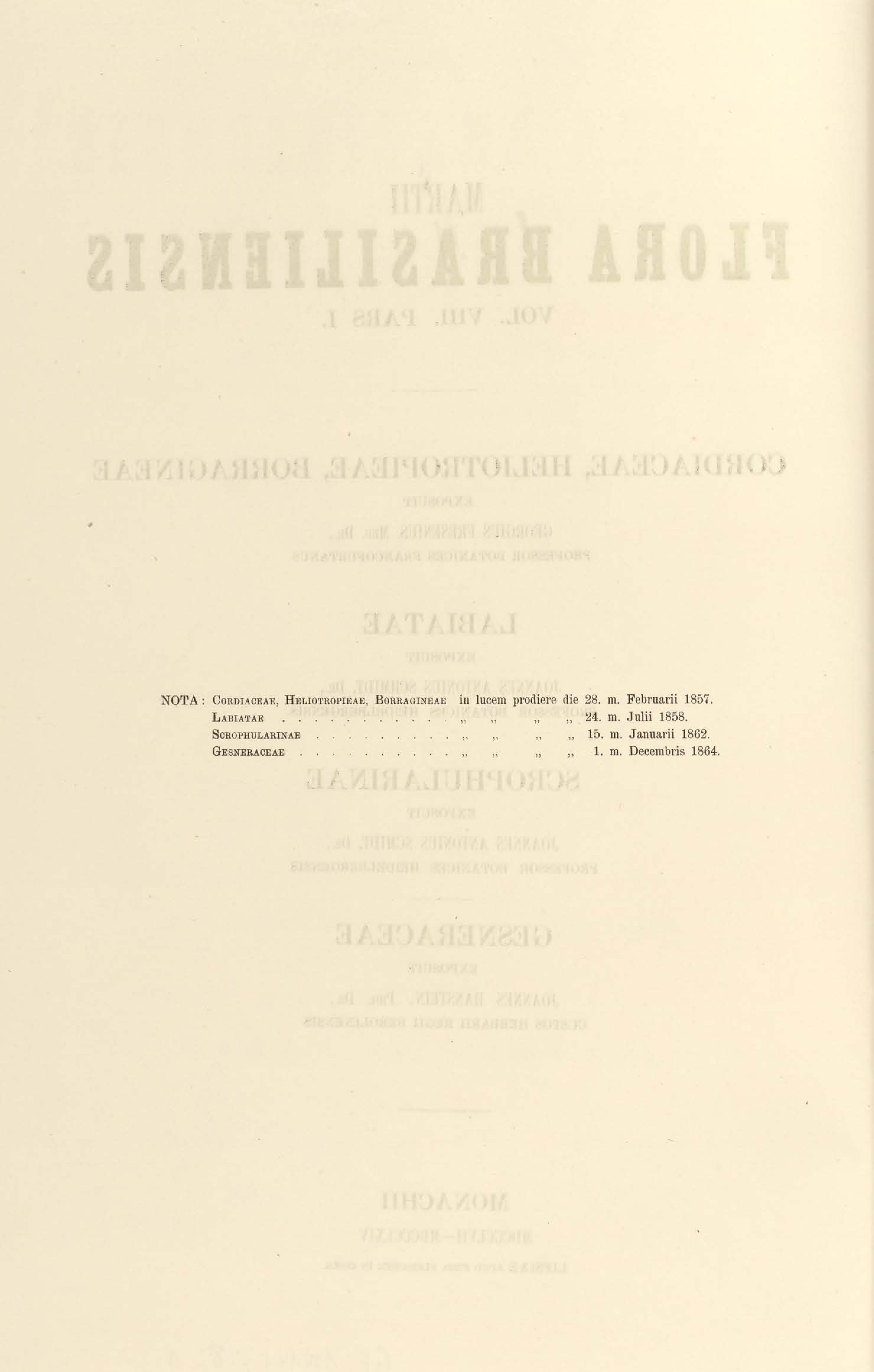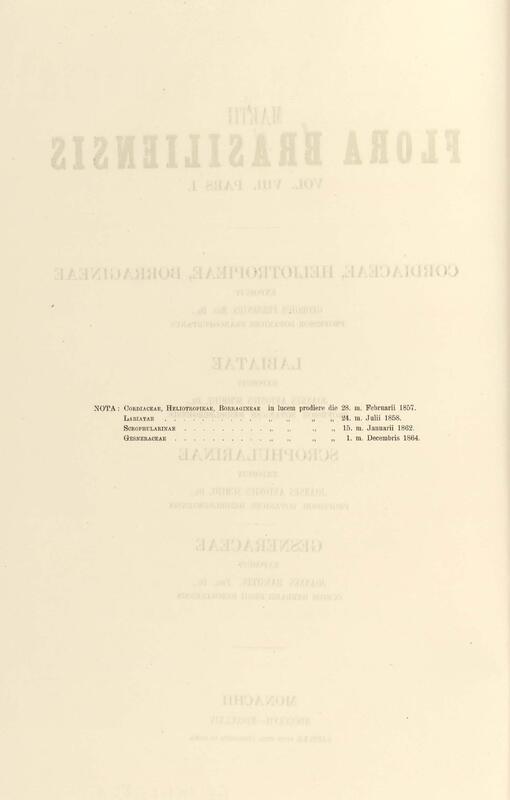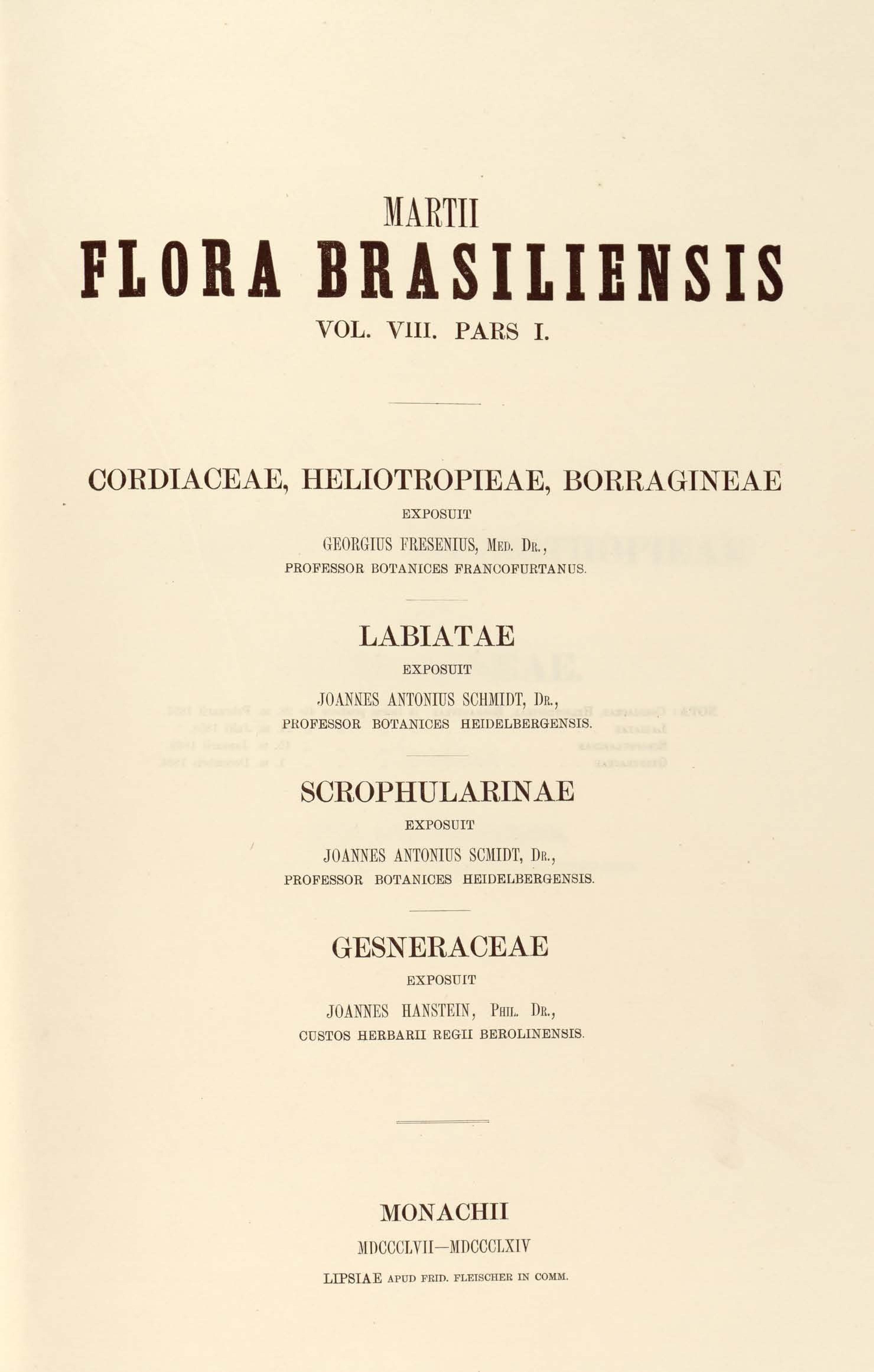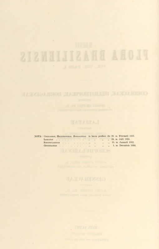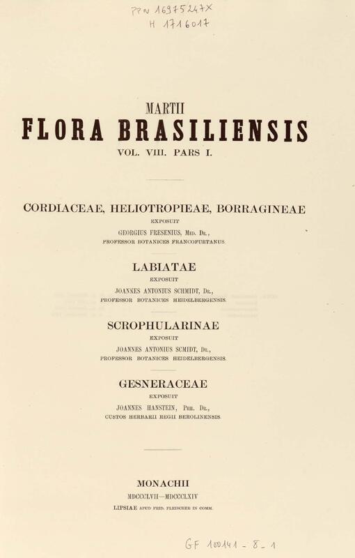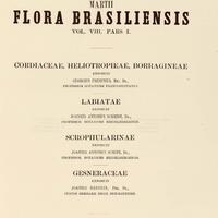 Flora brasiliensis : enumeratio plantarum in Brasilia hactenus detectarum quas suis aliorumque botanicorum studiis descriptas et methodo naturali digestas partim icone illustratas. Volumen VIII, Pars I, Cordiaceae, Heliotropieae, Borragineae, labiatae, Scrophularinae, Gesneraceae