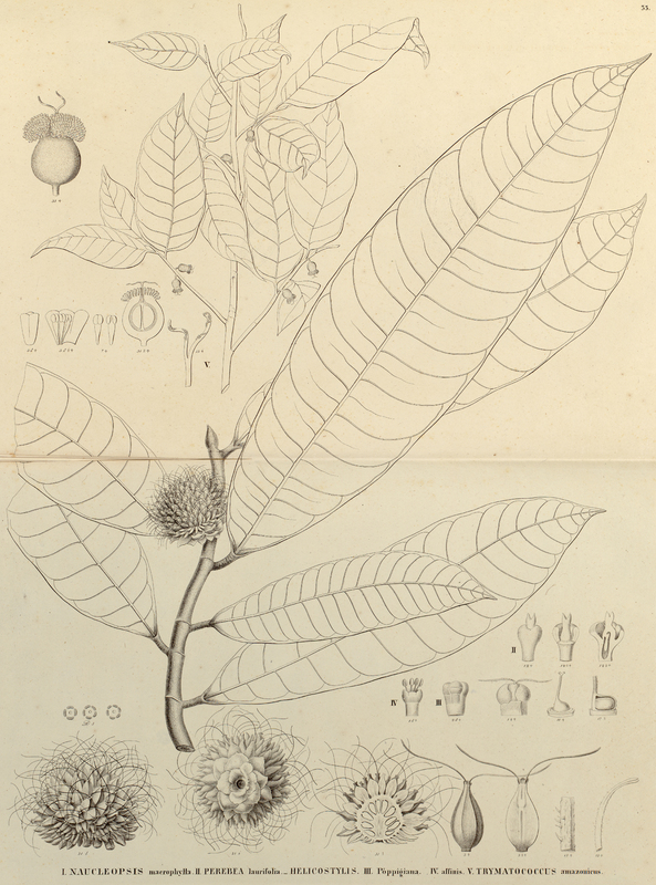 - 35. I. NAUCLEOPSIS macrophylla. II. PEREBEA laurifolia. - HELICOSTYLIS. III. Poppigiana. IV. affinis. V. TRYMATOCOCCUS amazonicus.