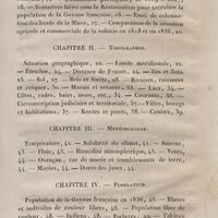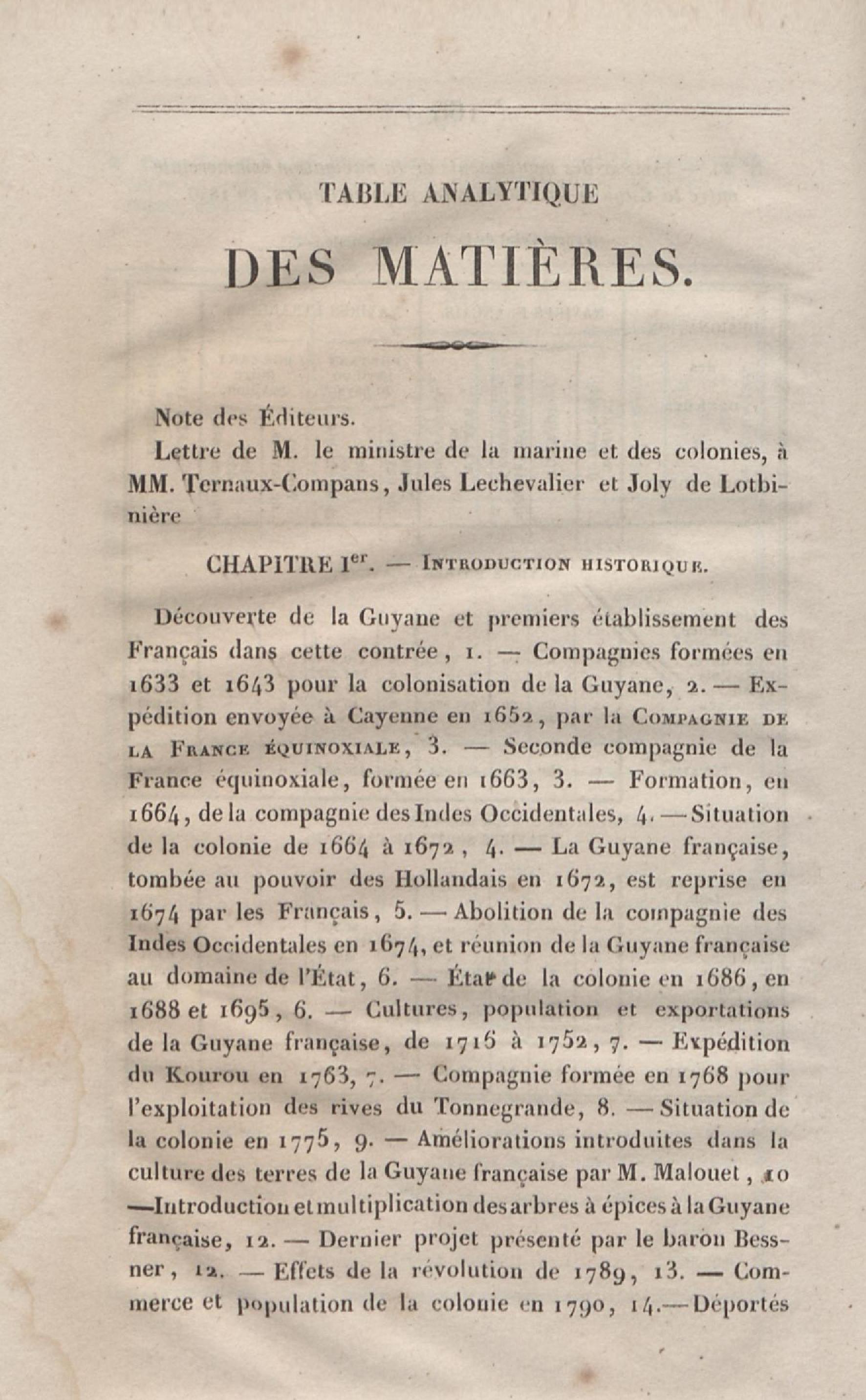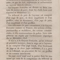 - L'ouvrage présente l'histoire, la topographie, la climatologie, le peuplement, l'organisation politique, le cadre législatif, l'organisation judiciaire et administrative, les forces militaires, les finances, les exploitations agricoles, l'industrie et le commerce de la Guyane française.