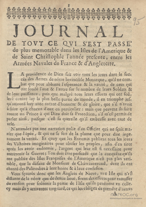 Journal de tout ce qui s'est passé de plus memorable dans les isles de l'Amerique & de Saint Christophe l'année presente, entre les armées navales de France & d'Angleterre