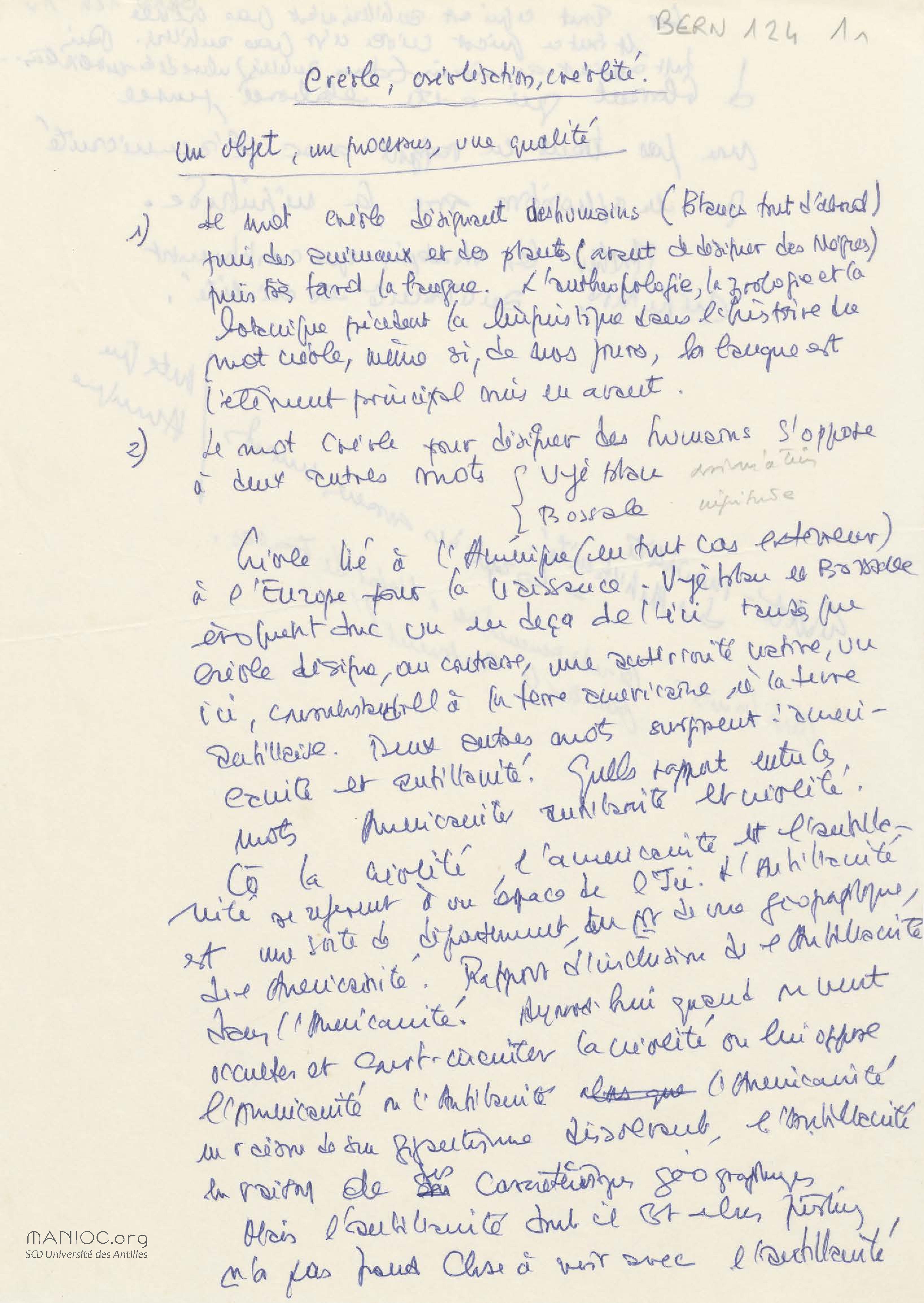 Contenus avec " Est auteur de : Travaux universitaires - Colloques et conférences - Colloque pluridisciplinaire hommage à Guy Hazael-Massieux organisé par le Centre d'études et de recherches caraibéennes (CERC), World Trade Center, 27 mars 1995 - « Créole, créolisation, créolité : un objet, un processus, une qualité », manuscrit de l'intervention - Etat 3 "