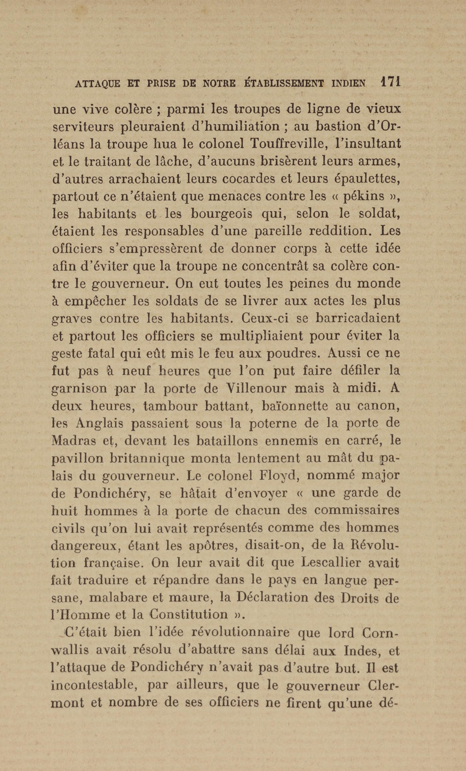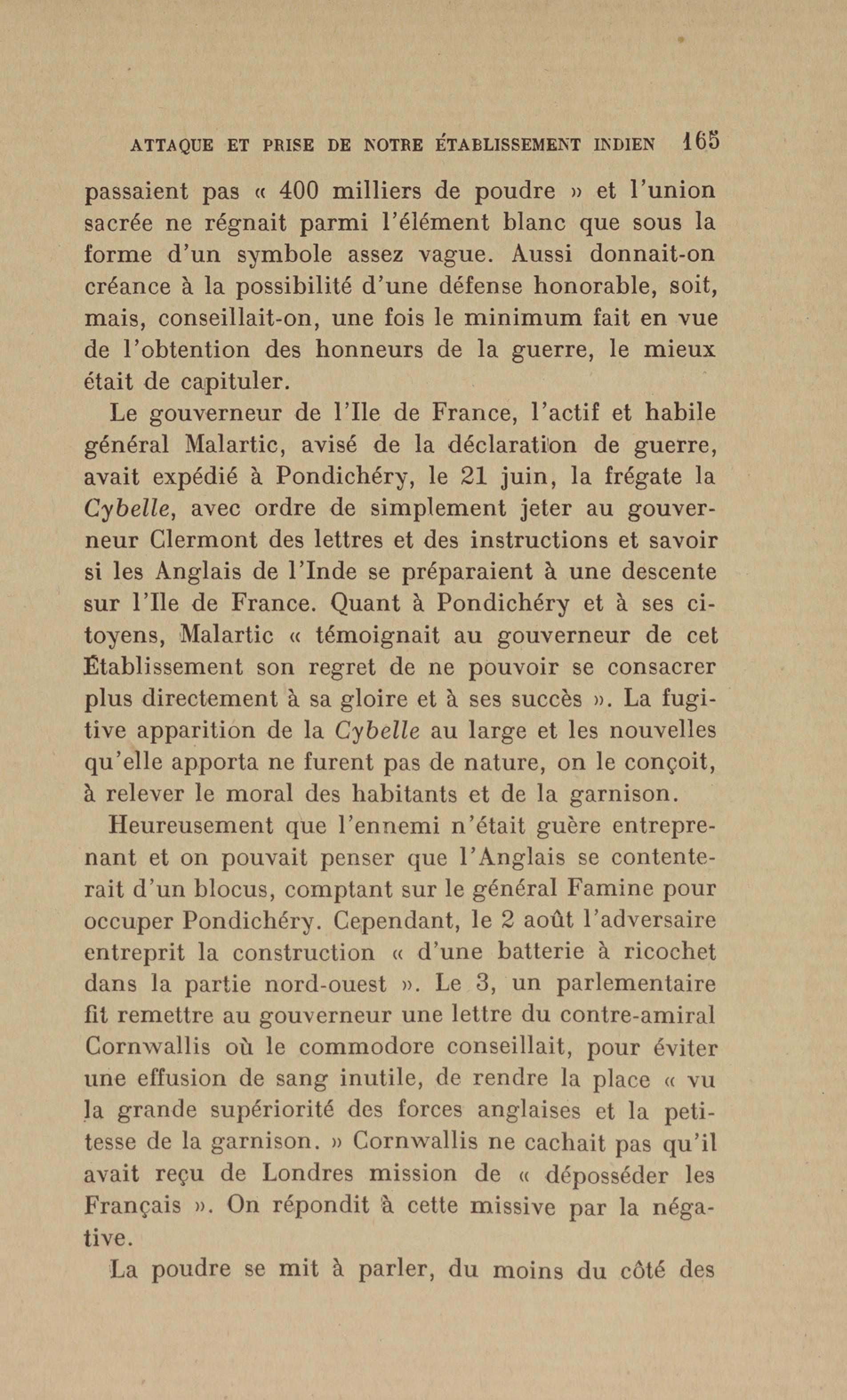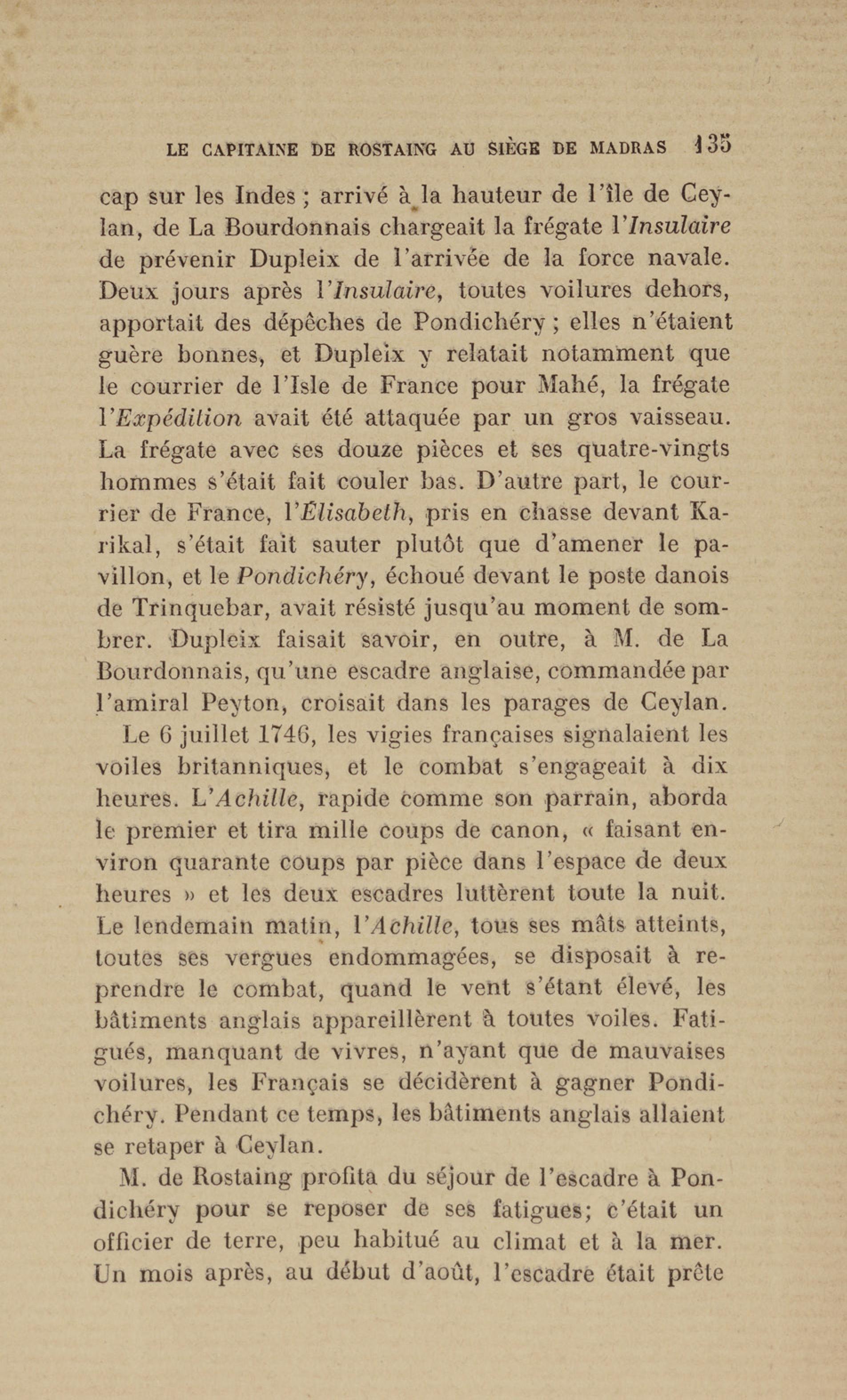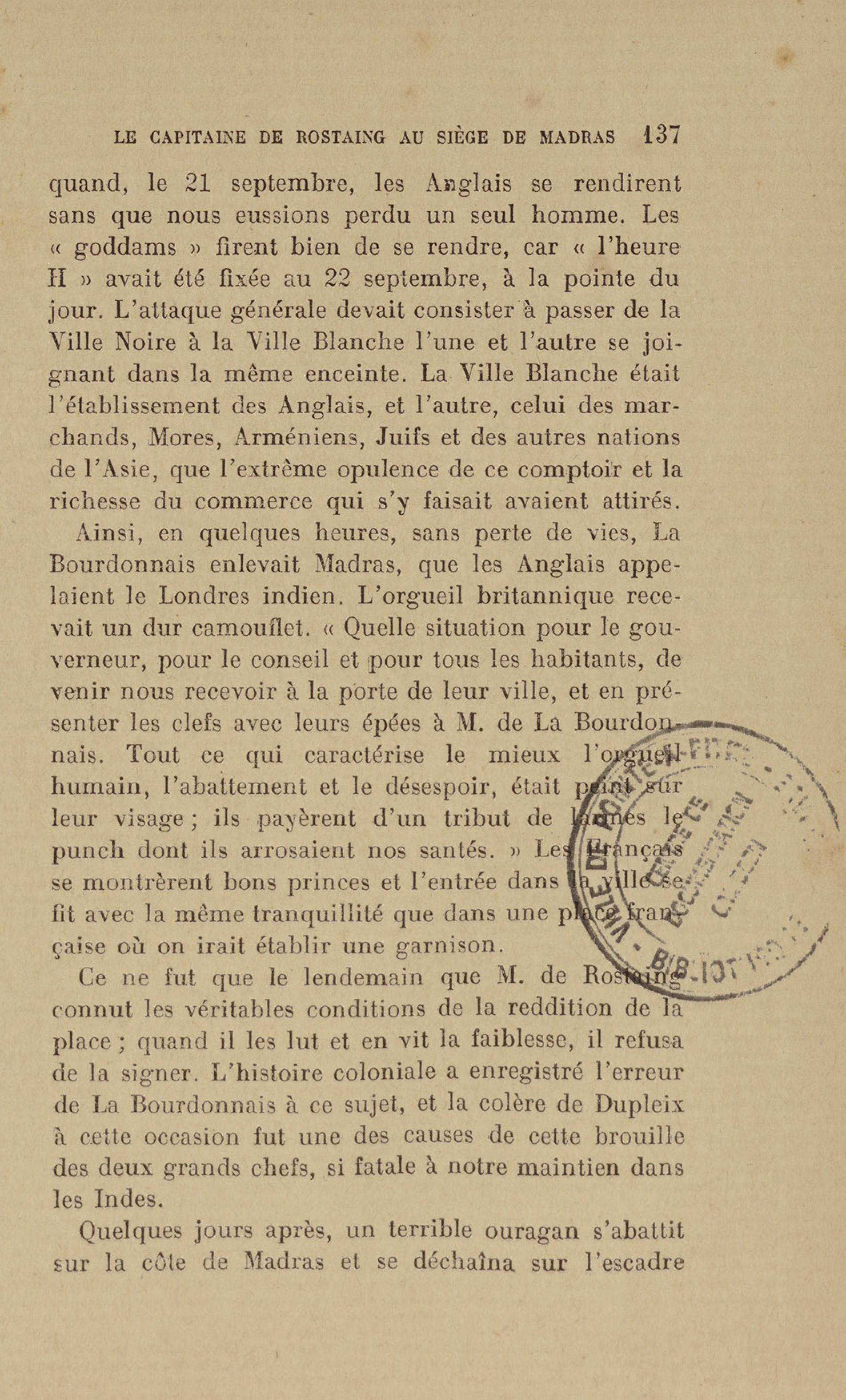 Madras : étang dans lequel les français se précipitèrent pour aller assiéger le fort. Le bruit de l'eau réveilla les sentinelles qui alertèrent les soldats anglais