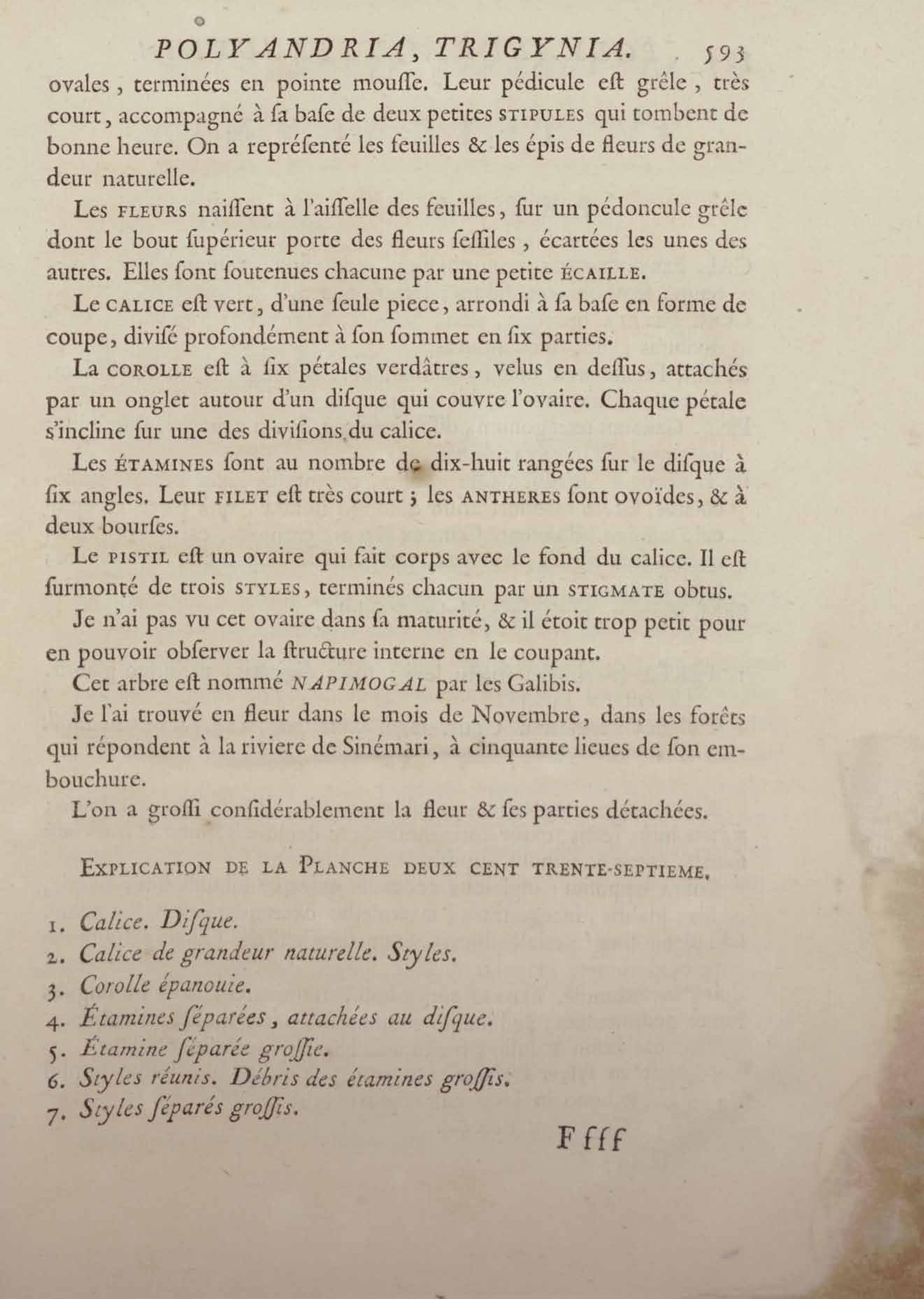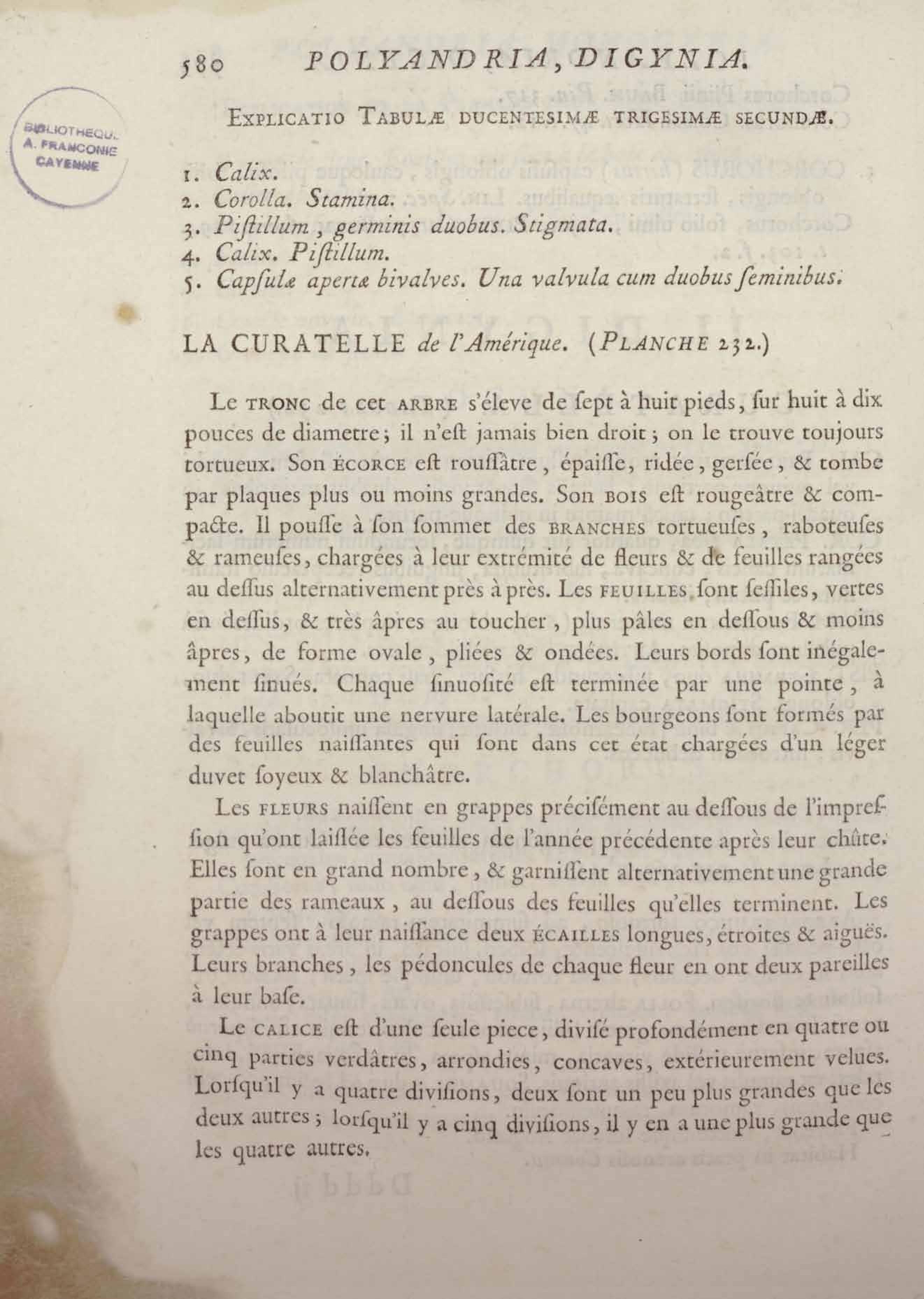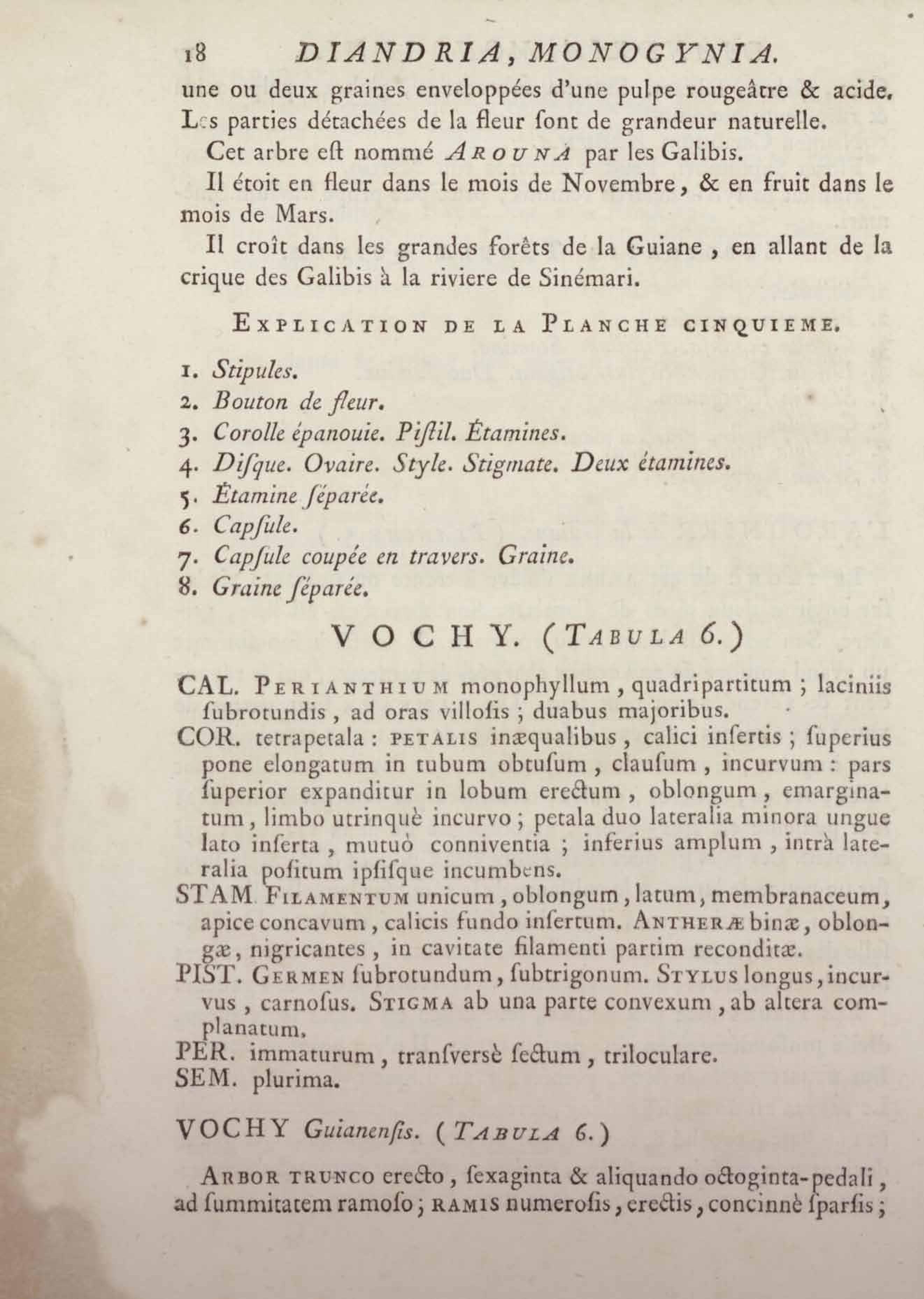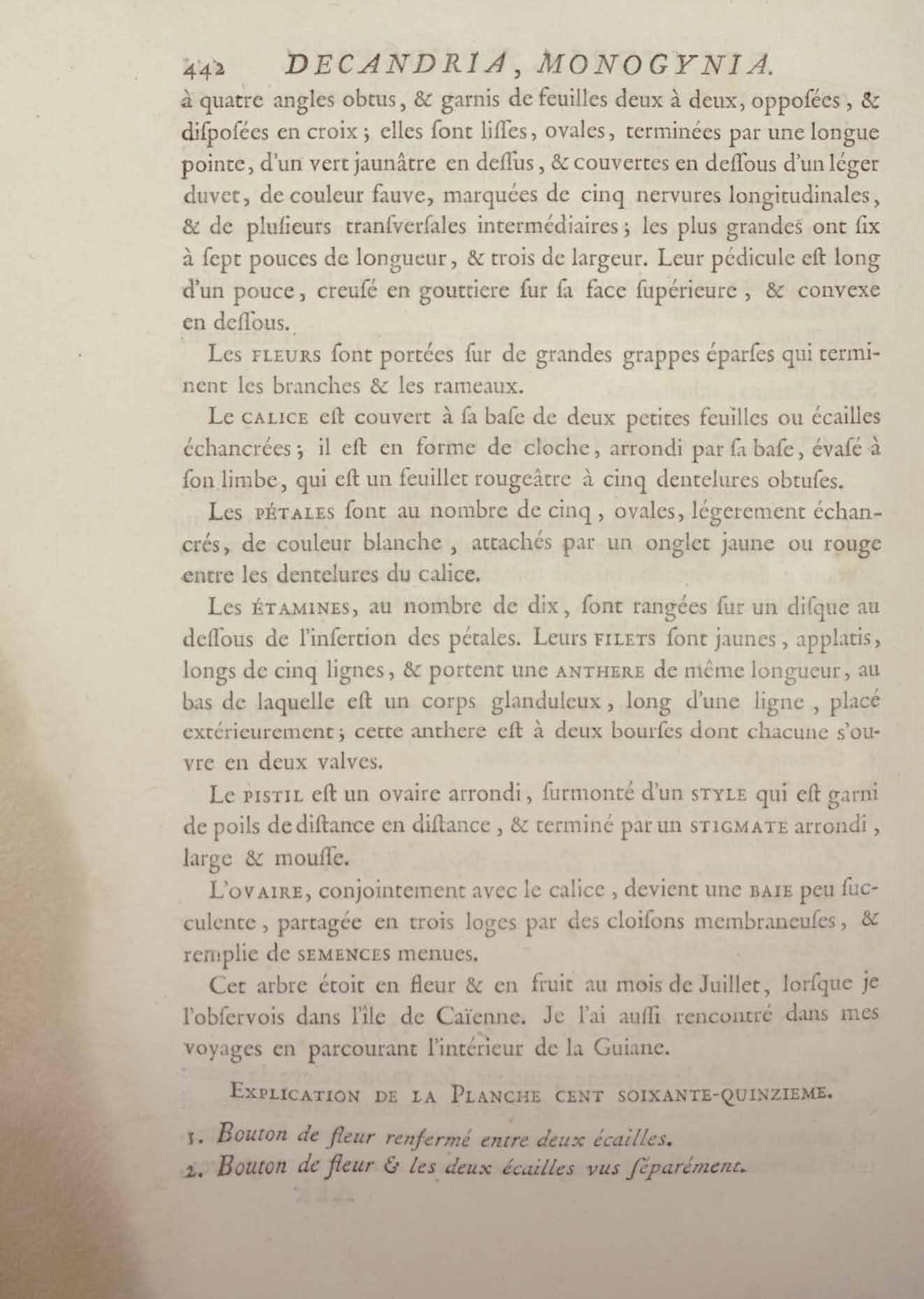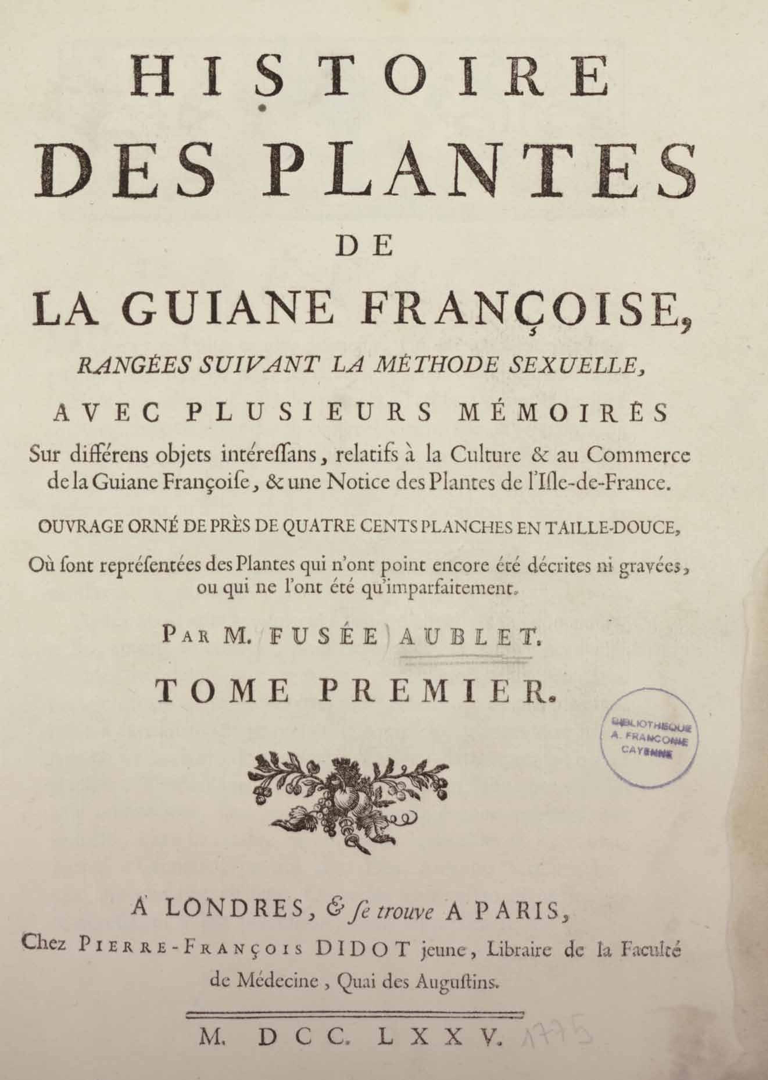 Histoire des plantes de la Guiane françoise, rangées suivant la méthode sexuelle : avec plusieurs mémoires sur différens objets intéressans, relatifs à la culture & au commerce de la Guiane françoise, & une notice des plantes de l'Isle-de-France : ouvrage orné de près de quatre cents planches en taille-douce, où sont représentées des plantes qui n'ont point encore été décrites ni gravées, ou qui ne l'ont été qu'imparfaitement. Tome premier