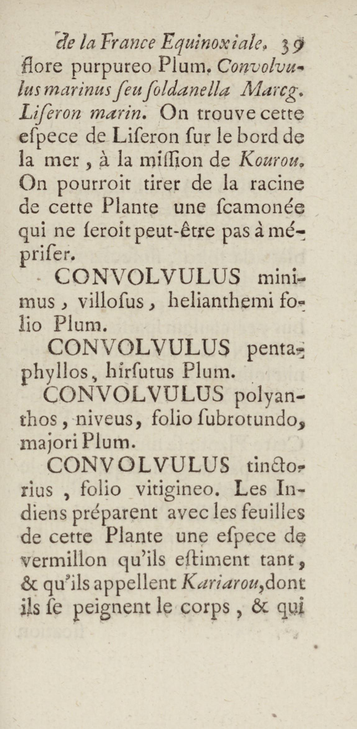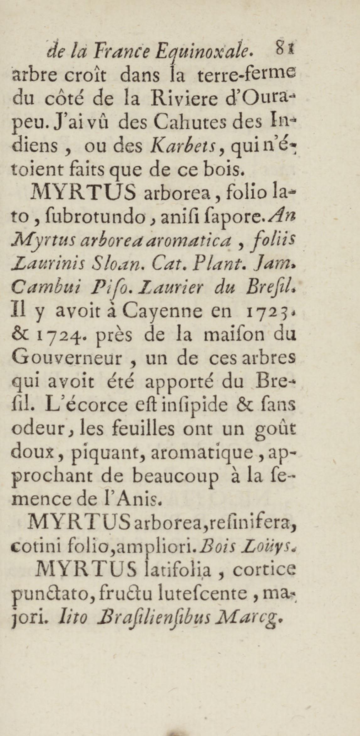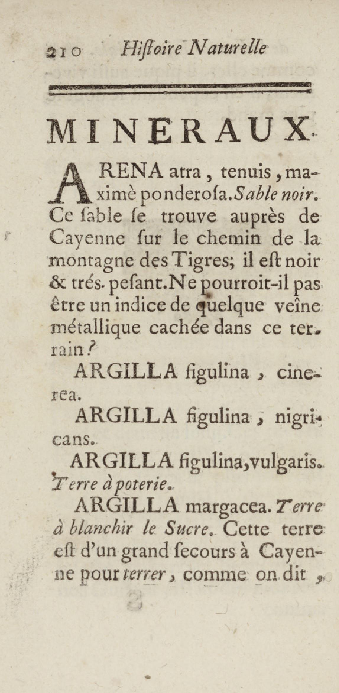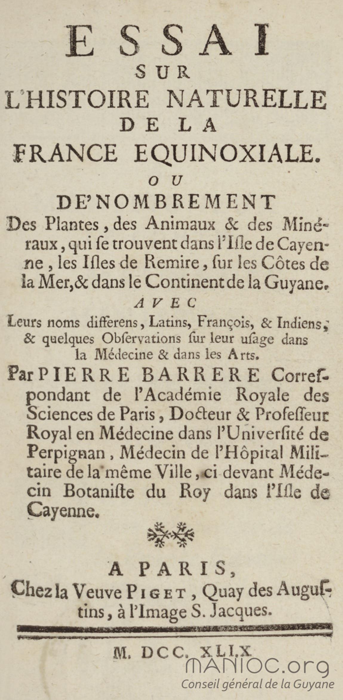 Essai sur l'histoire naturelle de la France équinoxiale, ou Dénombrement des plantes, des animaux, & des minéraux, qui se trouvent dans l'isle de Cayenne, les isles de Remire, sur les côtes de la mer, & dans le continent de la Guyane : avec leurs noms différens, latins, françois, et indiens, et quelques observations sur leur usage dans la médecine & dans les arts