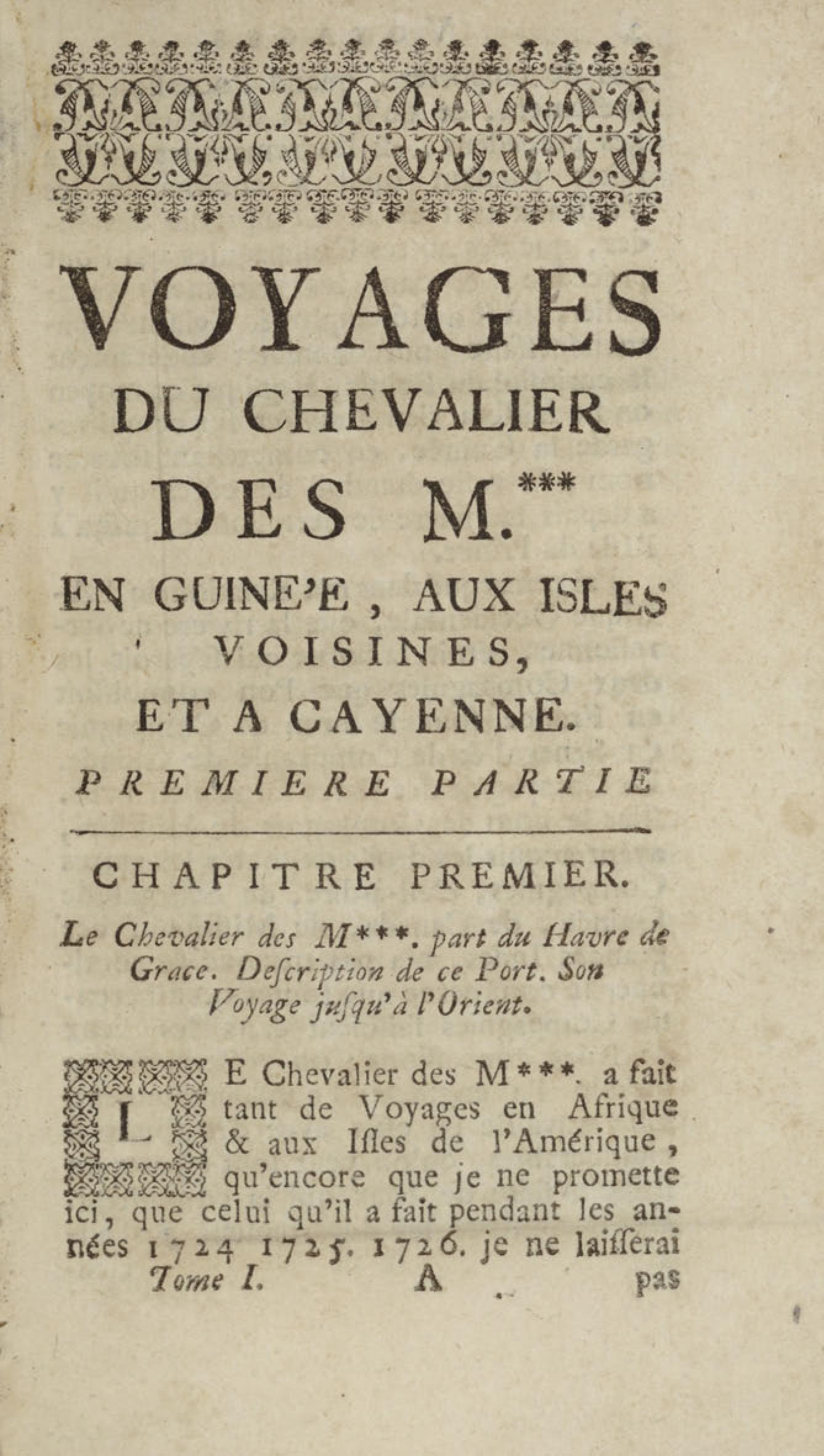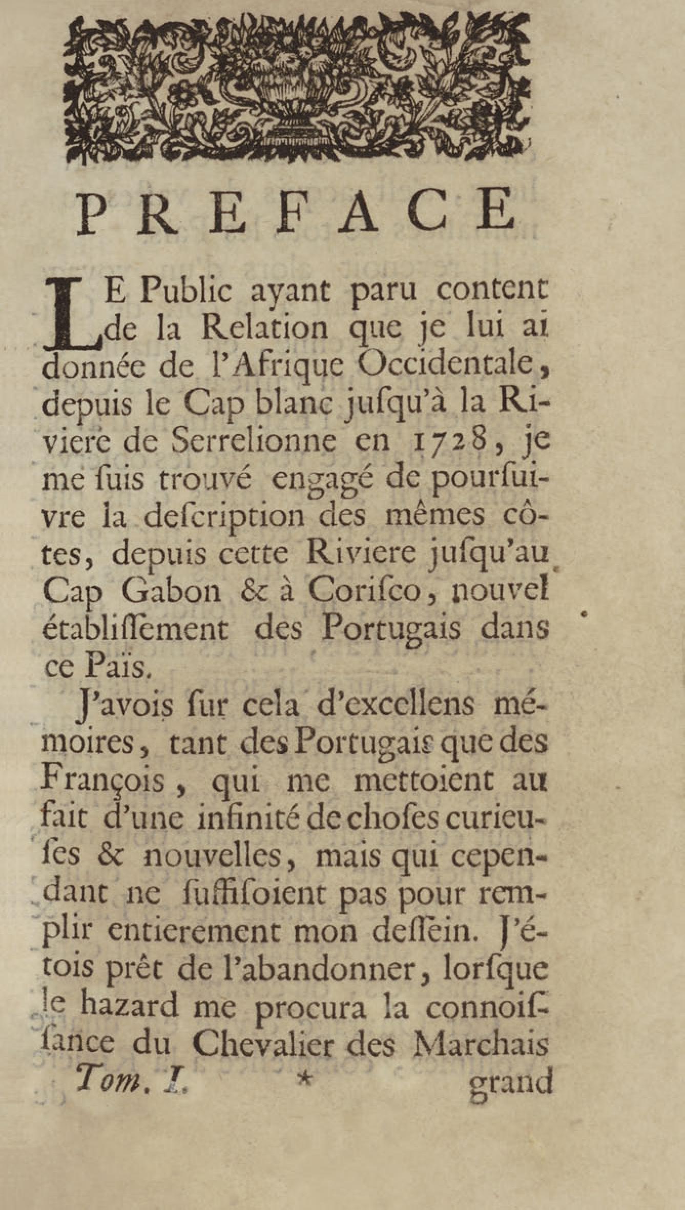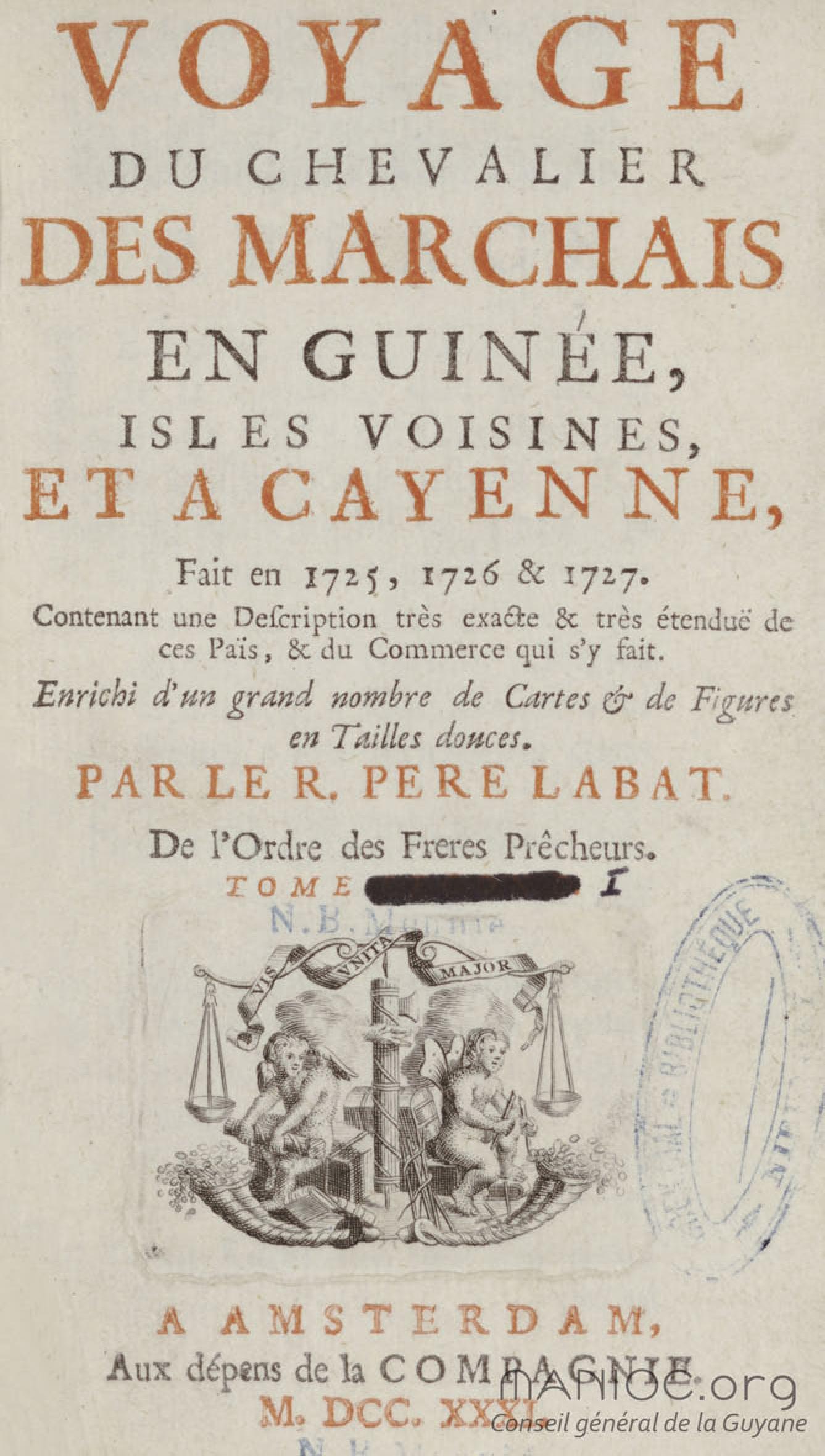 - Voyage du chevalier des Marchais en Guinée, isles voisines, et à Cayenne, fait en 1725, 1726 & 1727 : contenant une description très exacte & très étenduë de ces païs, & du commerce qui s'y fait : enrichi d'un grand nombre de cartes & de figures en tailles douces. Tome premier