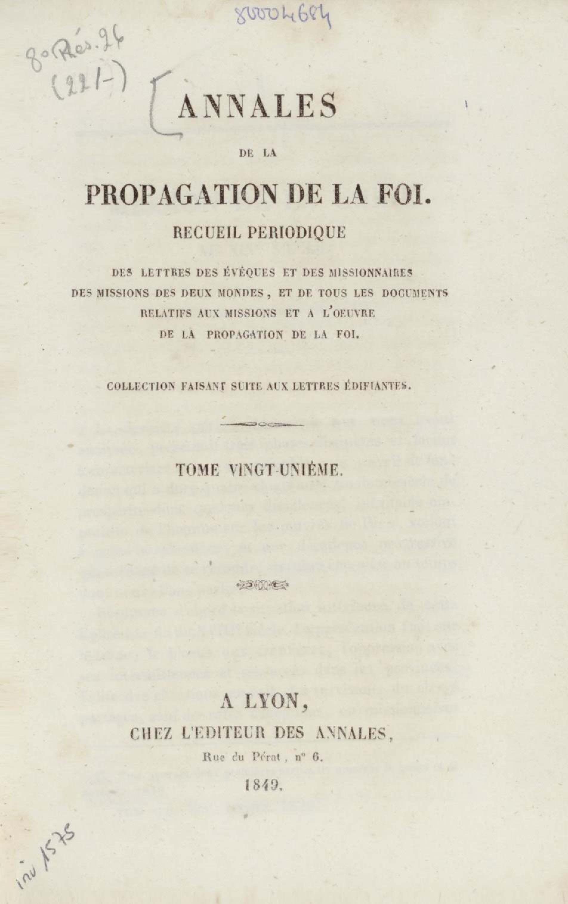 - Annales de la propagation de la foi. recueil périodique. Des lettres des évêques et des missionnaires des missions des deux mondes, et de tous les documents relatifs aux missions et à l'œuvre de la propagation de la foi. Tome vingt-unième