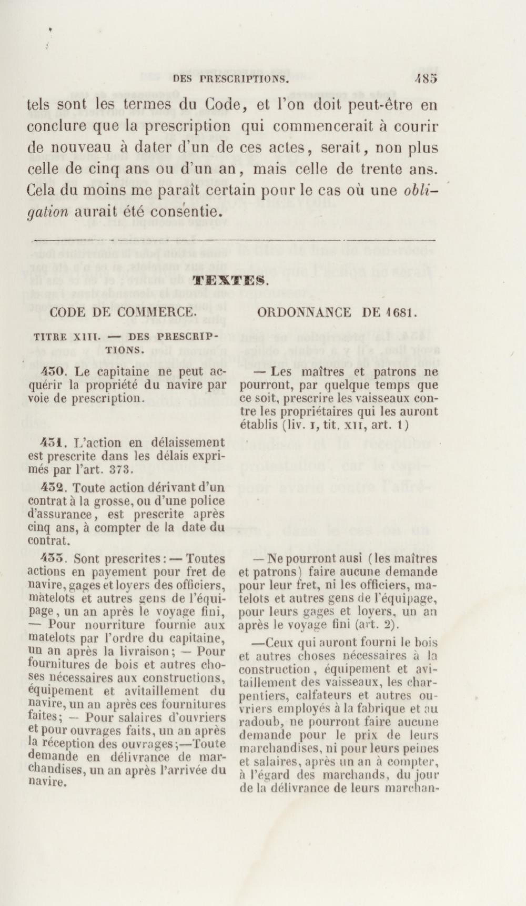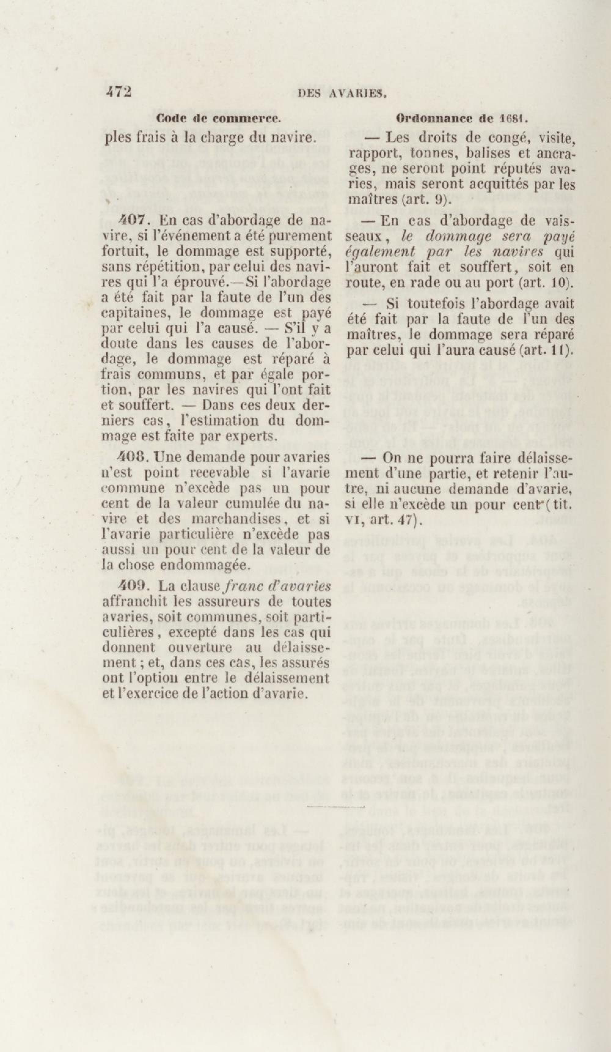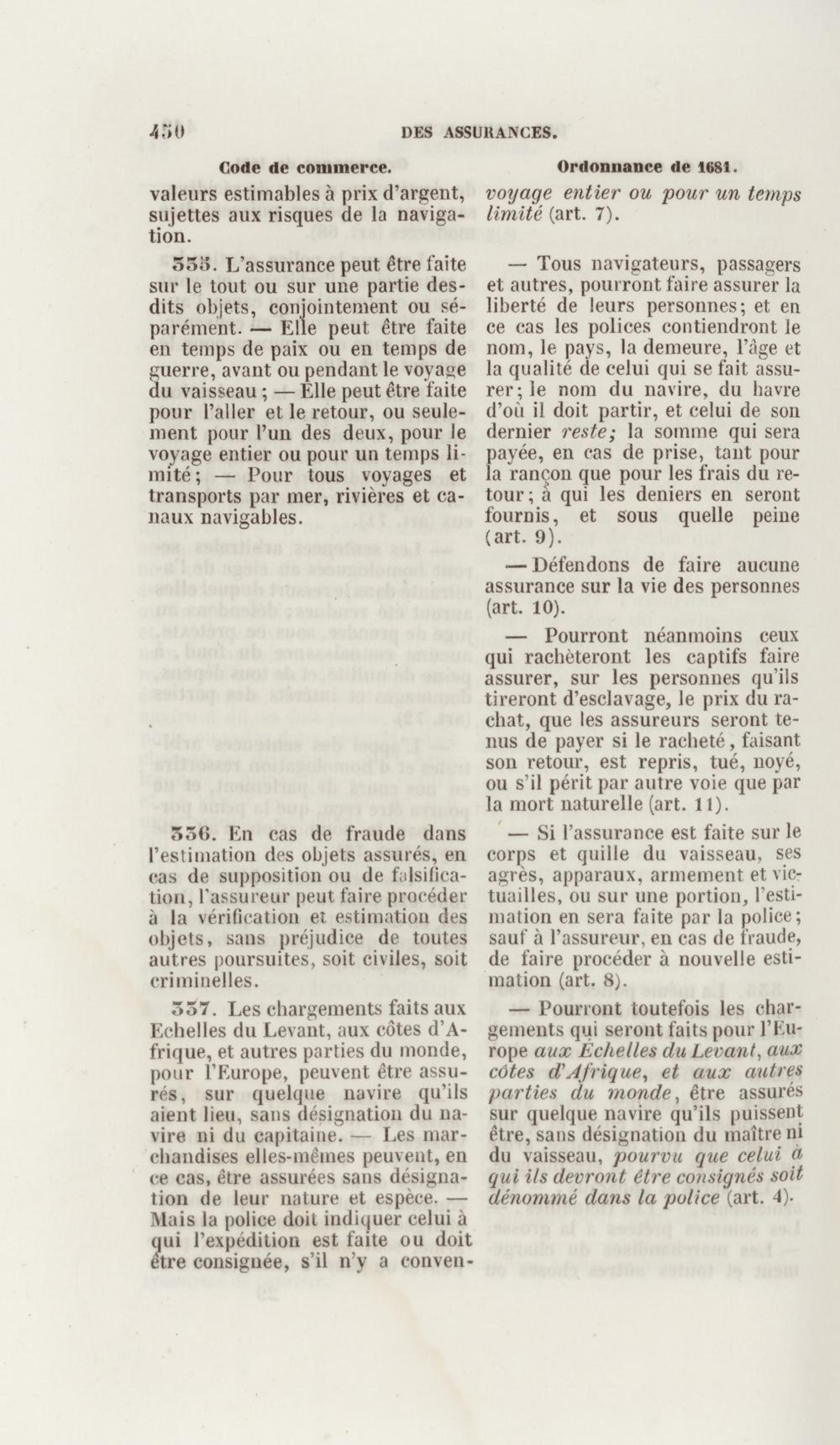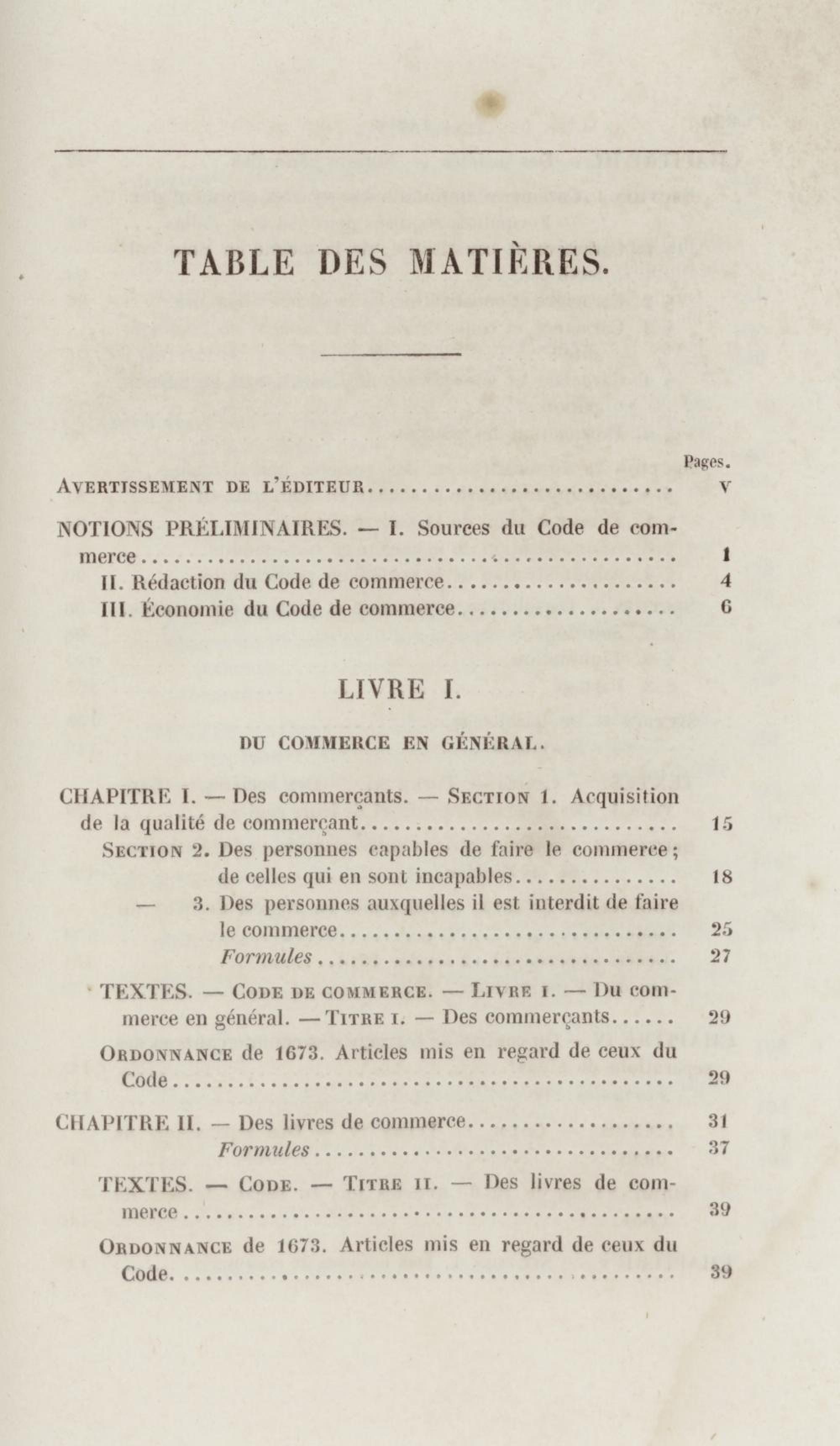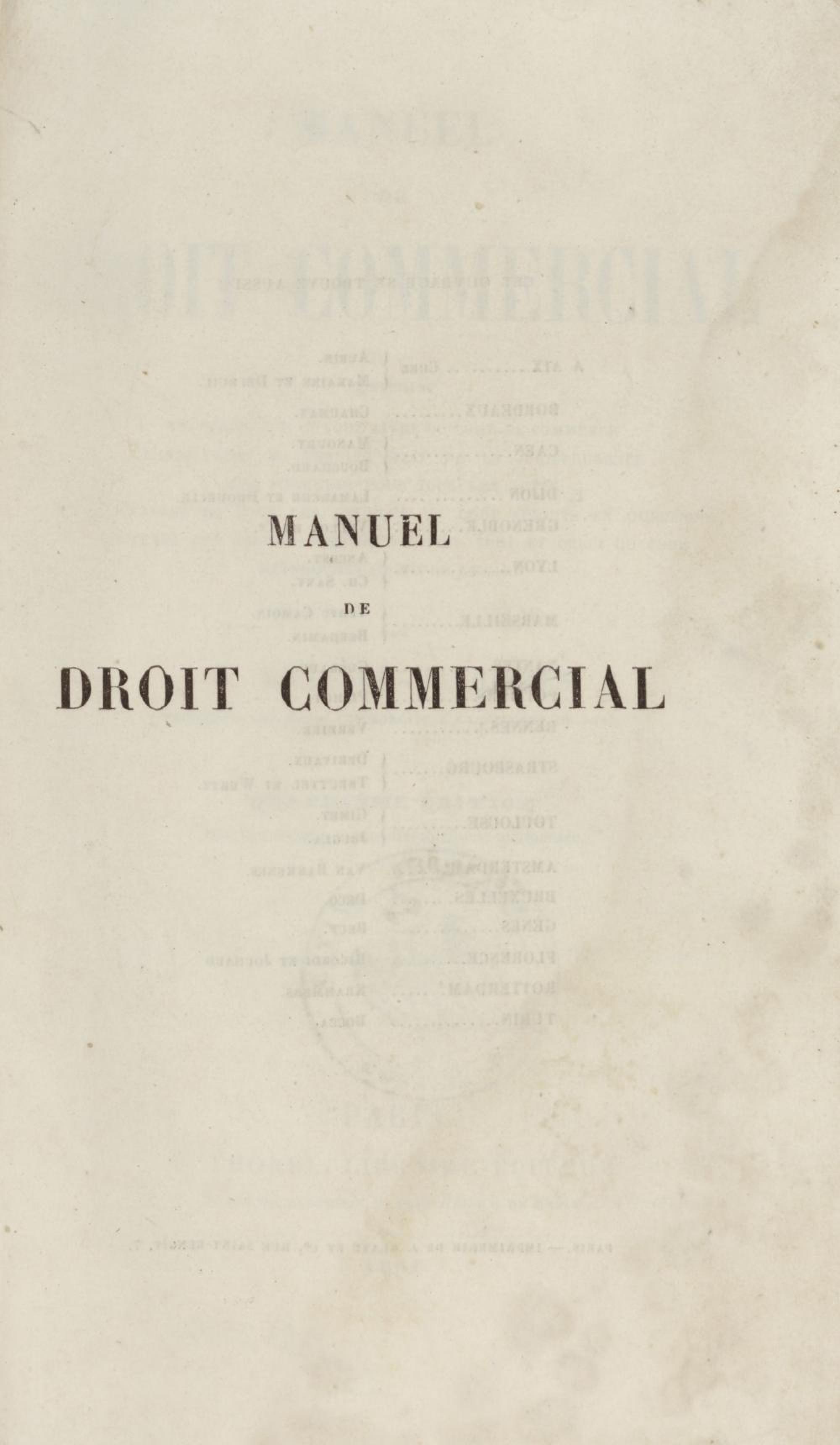 Manuel de droit commercial : contenant un traité sur chaque livre du code de commerce, l'indication du dernier état de la jurisprudence, des formules pour tous les actes, une analyse de tous les articles de code réduits en questions, le texte des ordonnances de 1673 et 1681 et celui du code rapprochés et mis en regard
