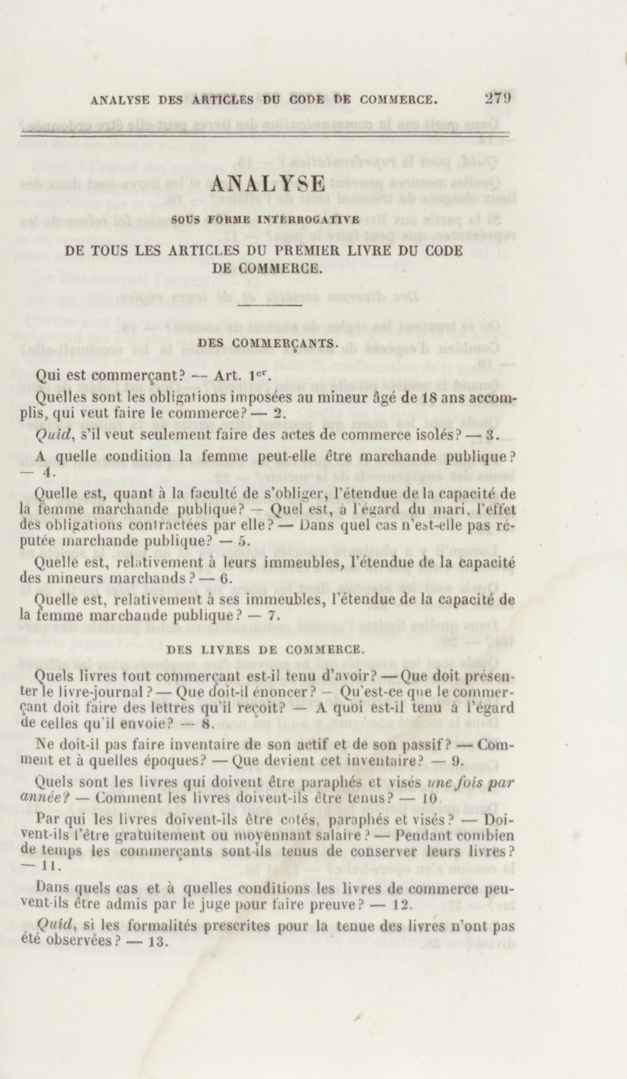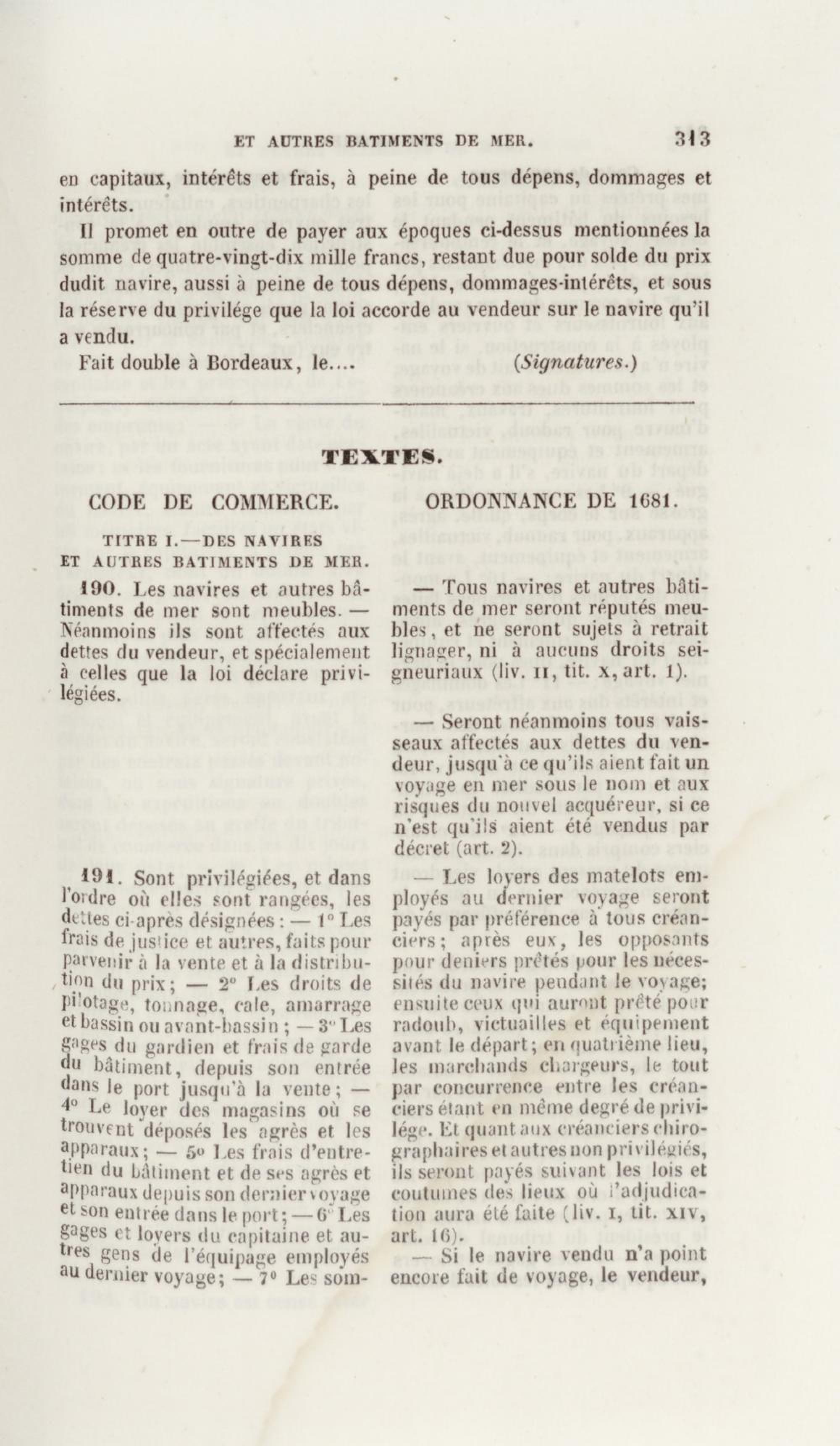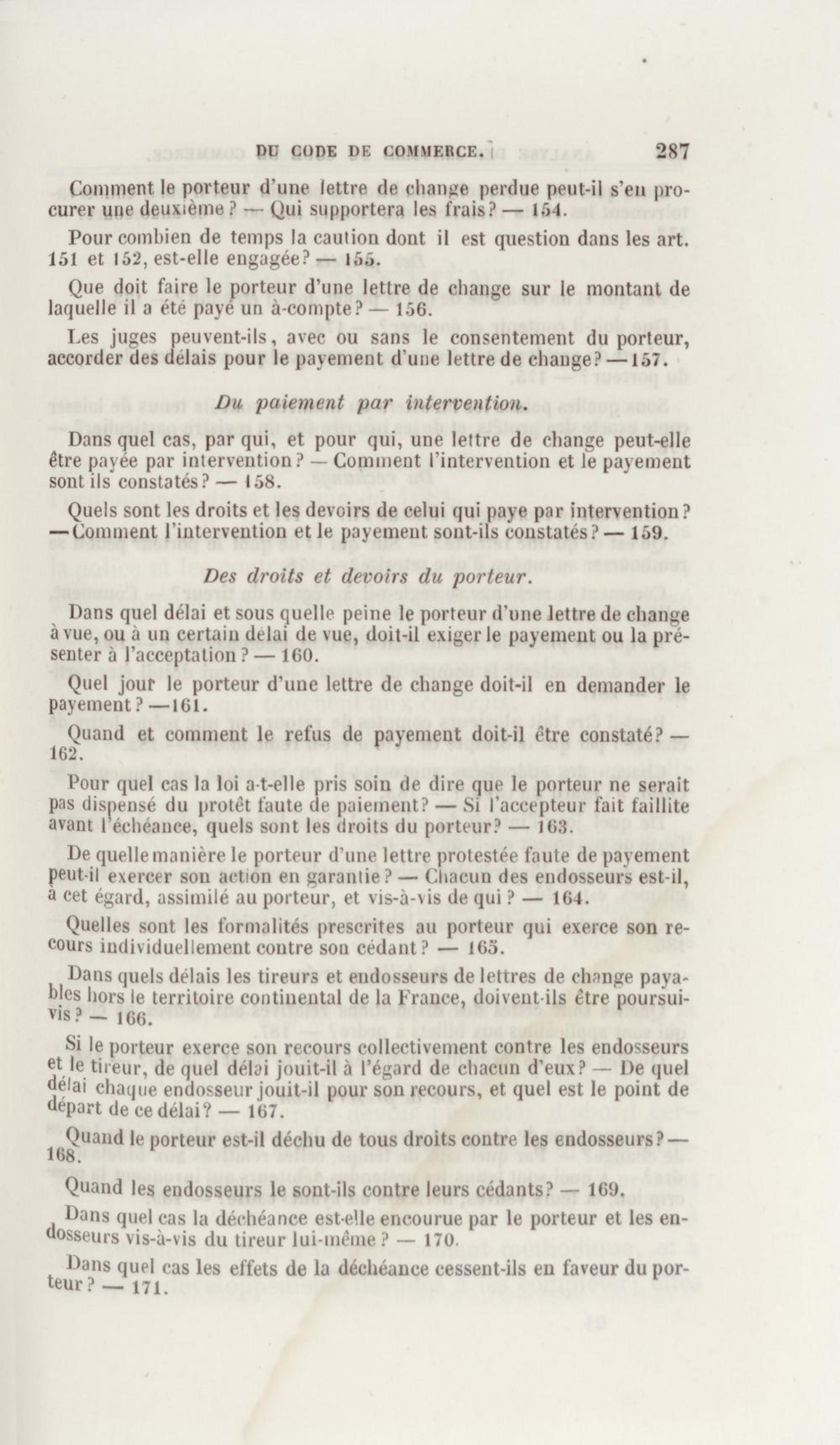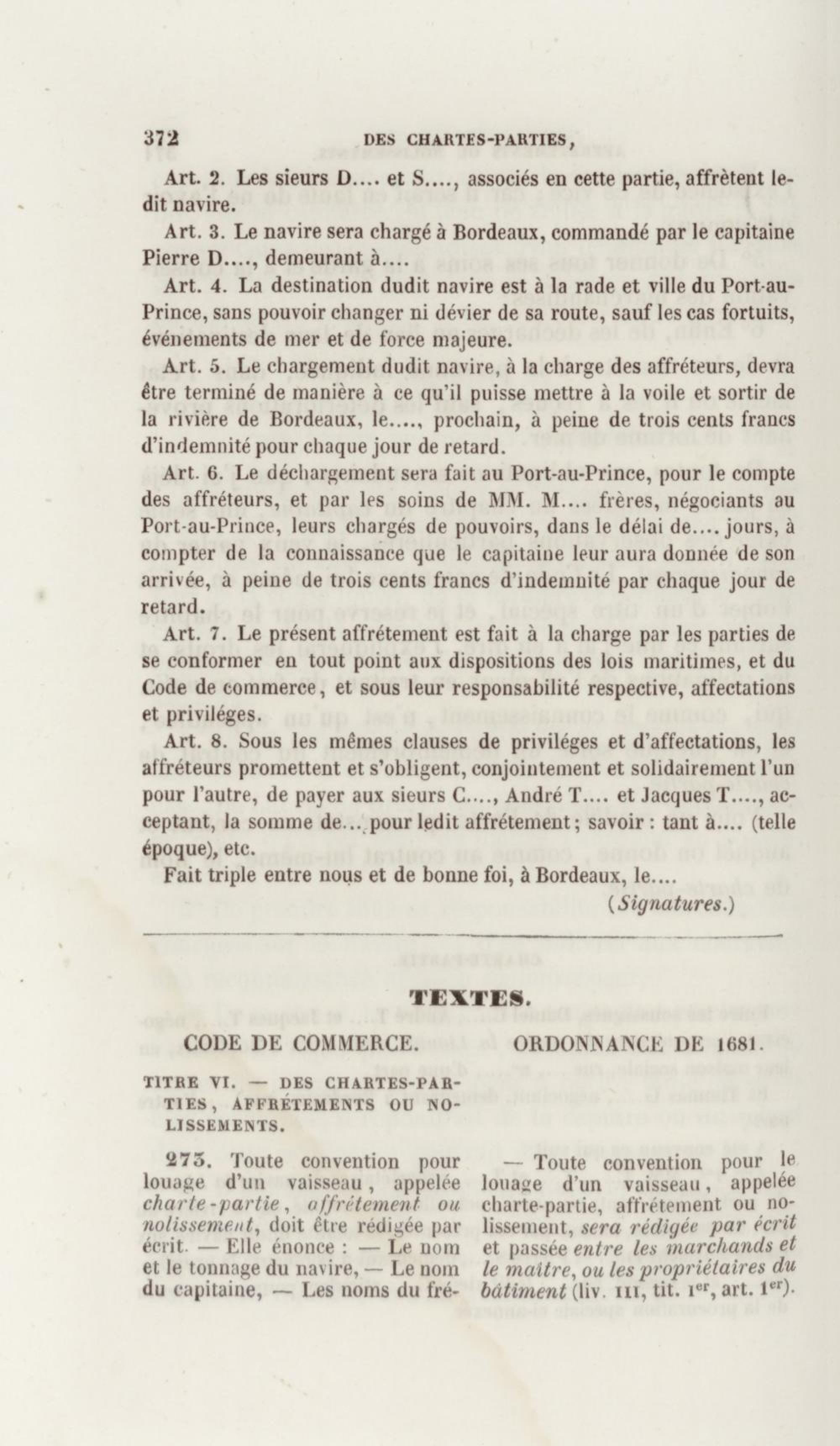 Manuel de droit commercial : contenant un traité sur chaque livre du code de commerce, l'indication du dernier état de la jurisprudence, des formules pour tous les actes, une analyse de tous les articles de code réduits en questions, le texte des ordonnances de 1673 et 1681 et celui du code rapprochés et mis en regard