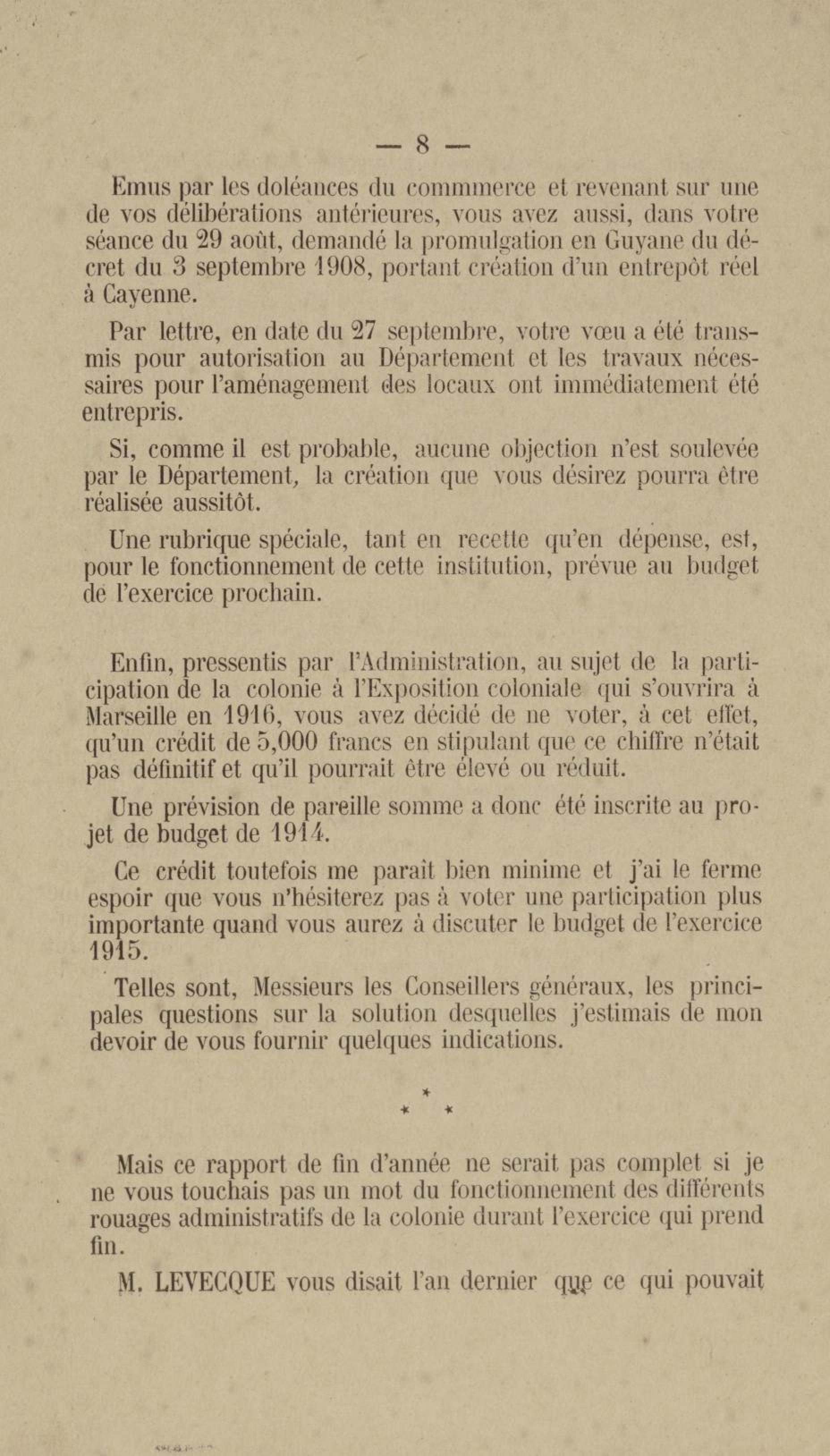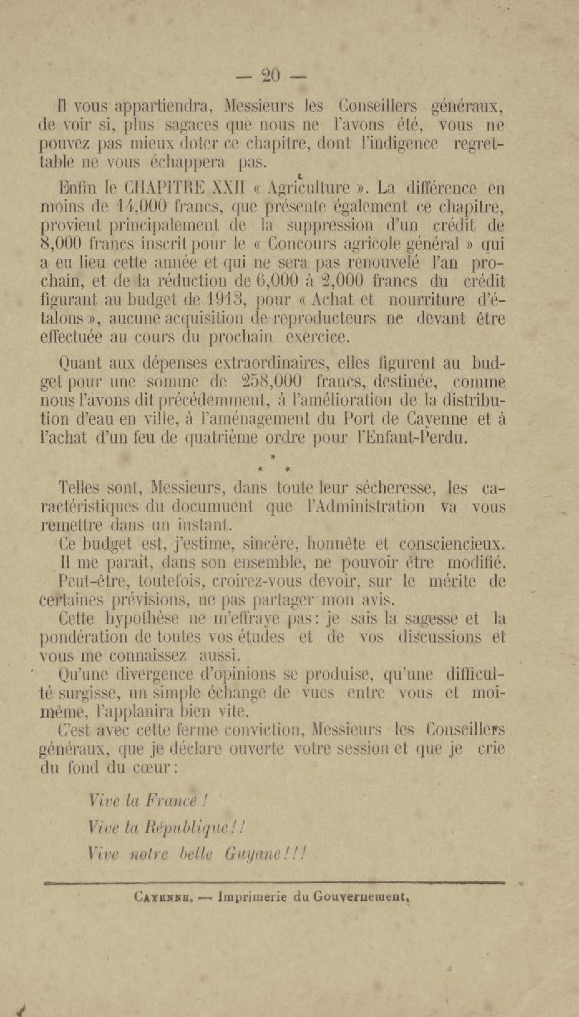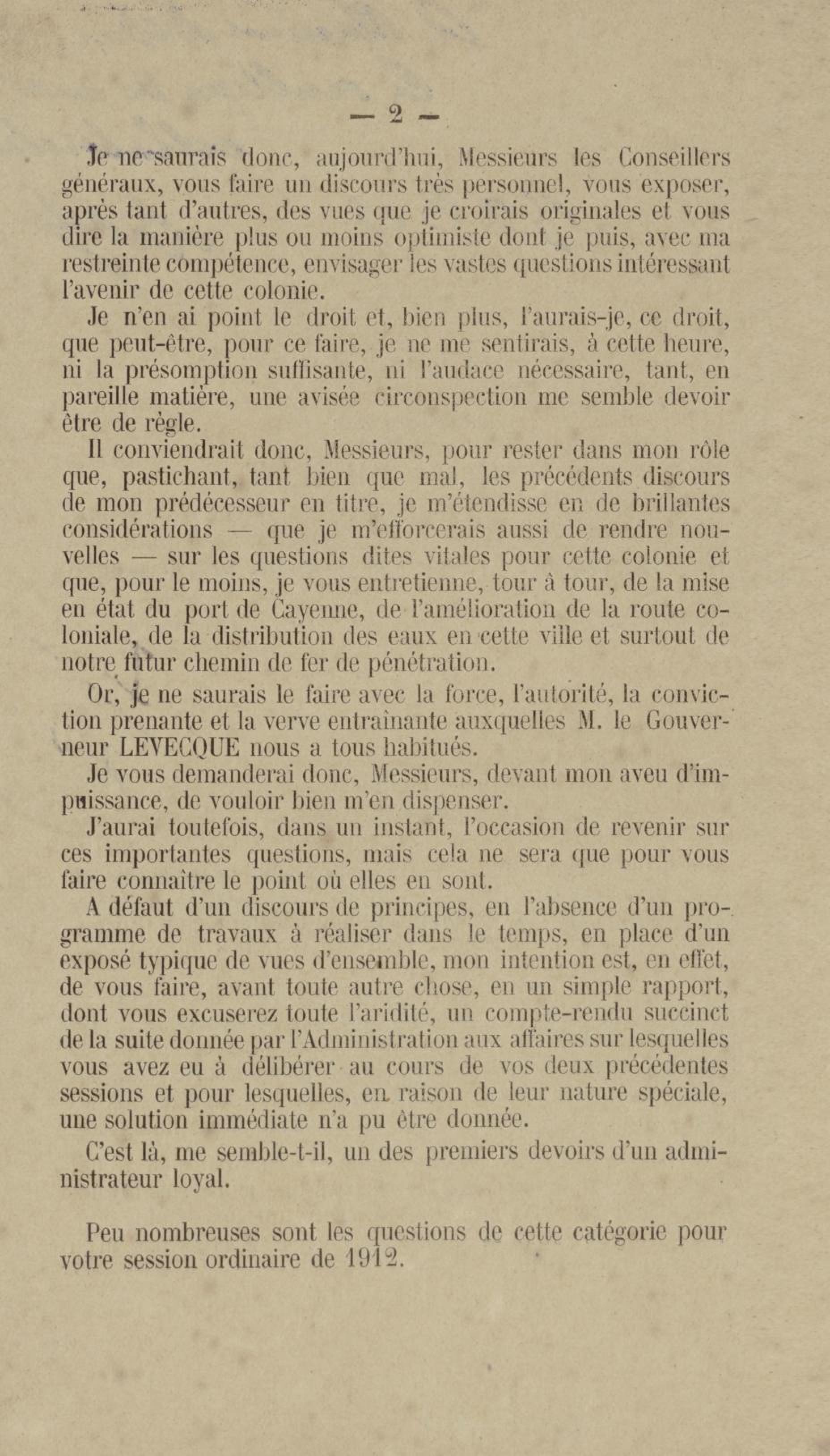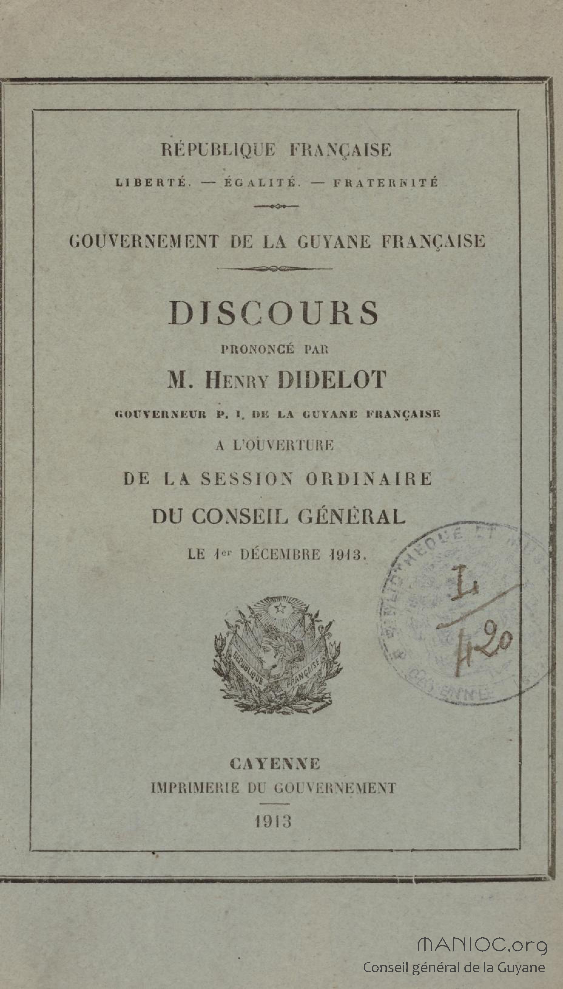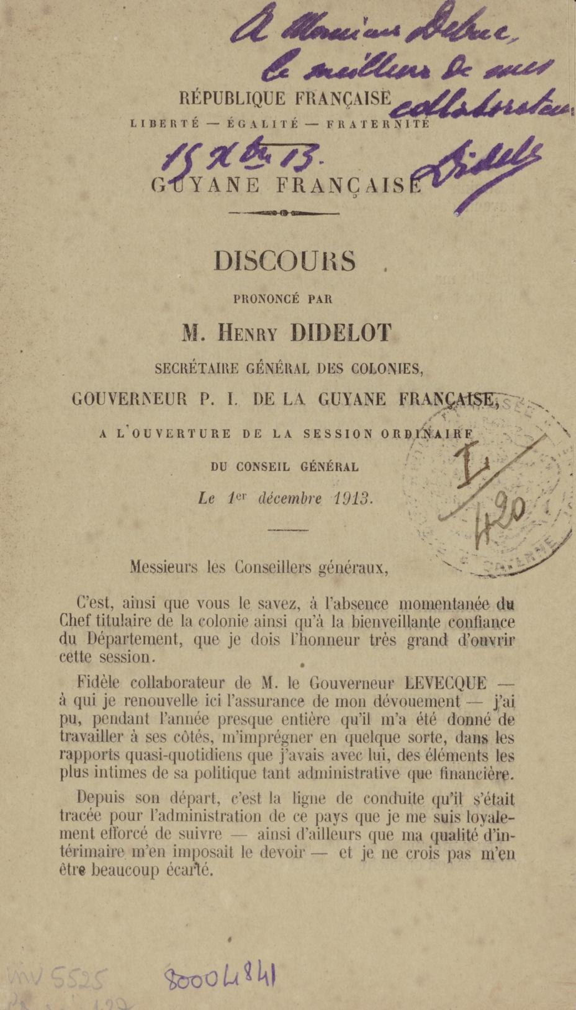 Discours prononcé par M. Henry Didelot, gouverneur p. i. ;[par interim]; de la Guyane française, à l'ouverture de la session ordinaire du conseil général le 1er décembre 1913