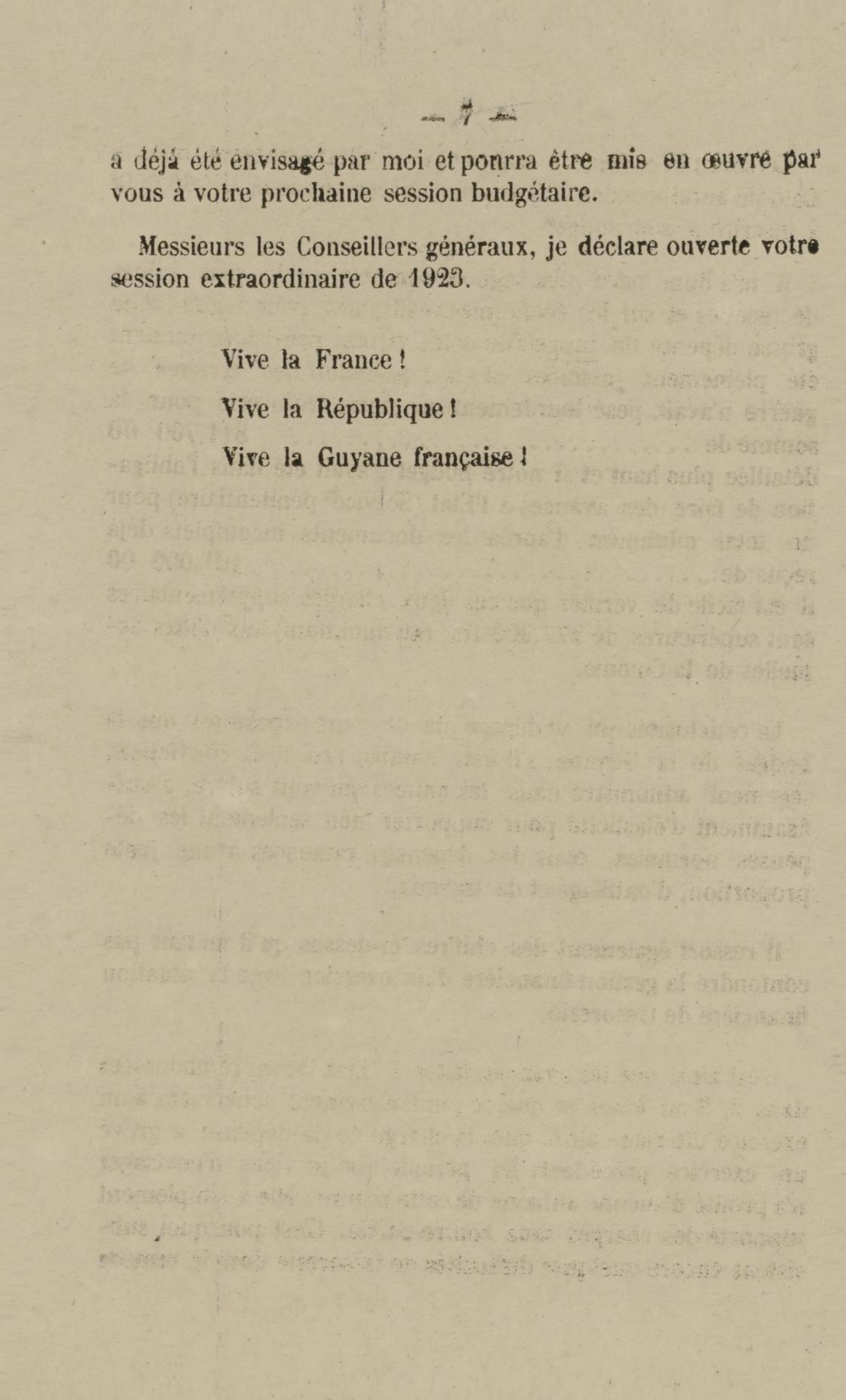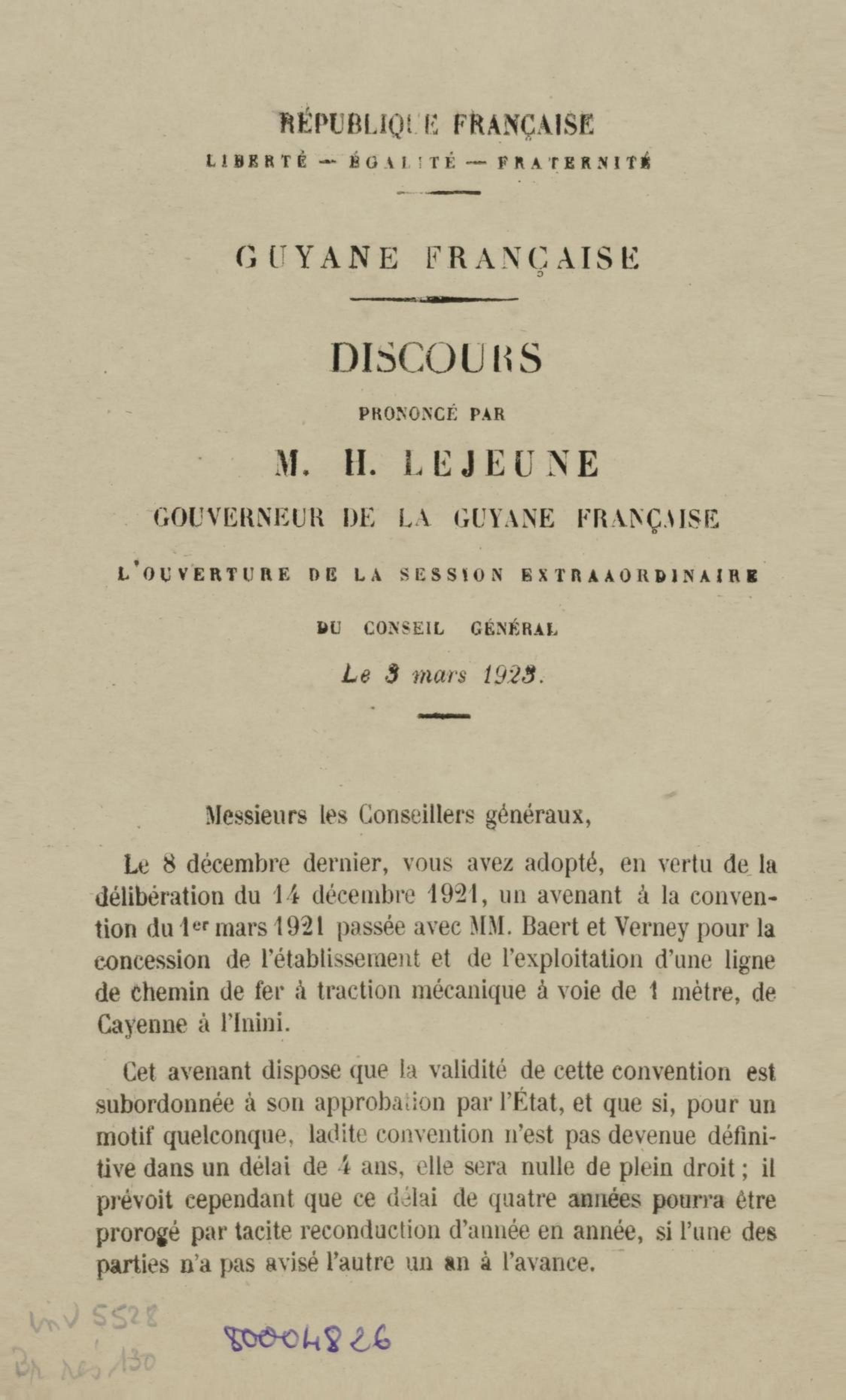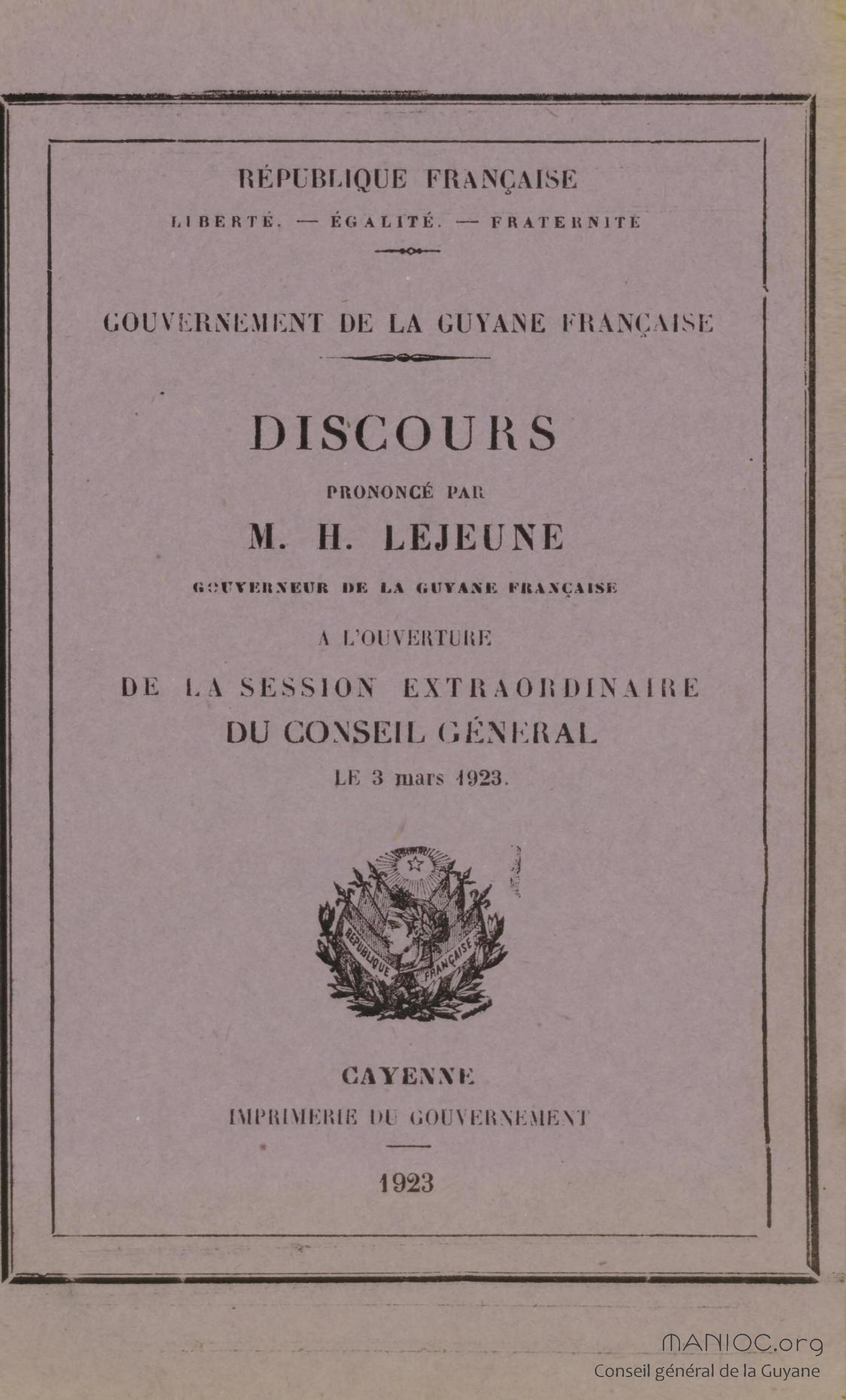 Discours prononcé par M. H. Lejeune, gouverneur de la Guyane française, à l'ouverture de la session extraordinaire du conseil général le 3 mars 1923