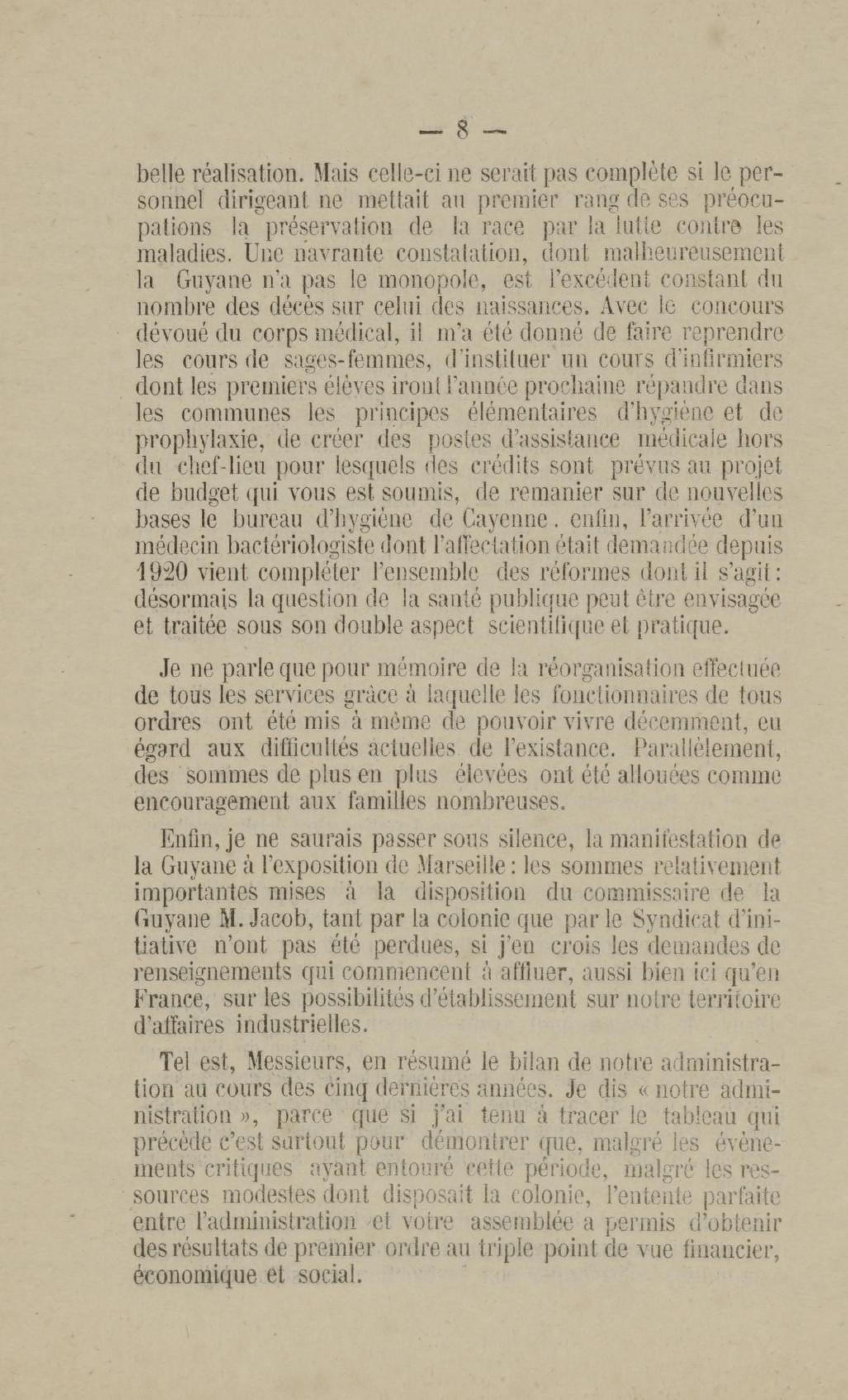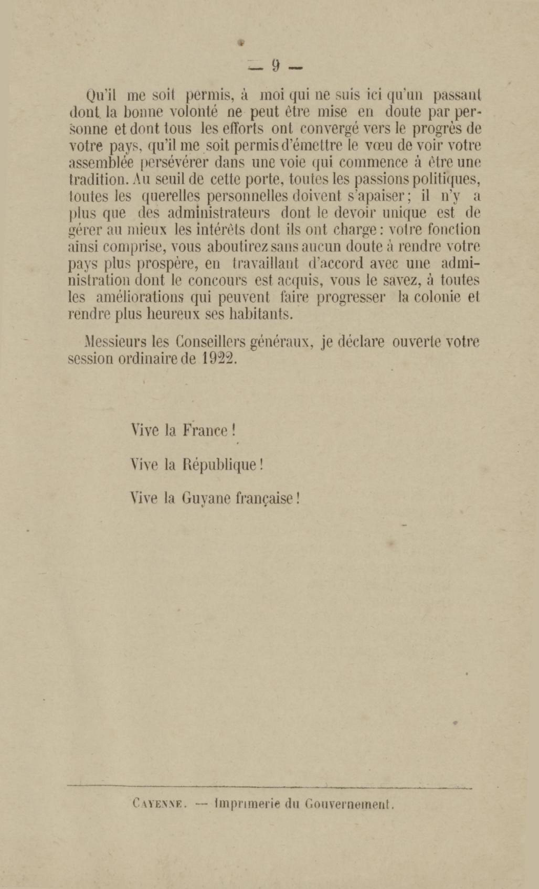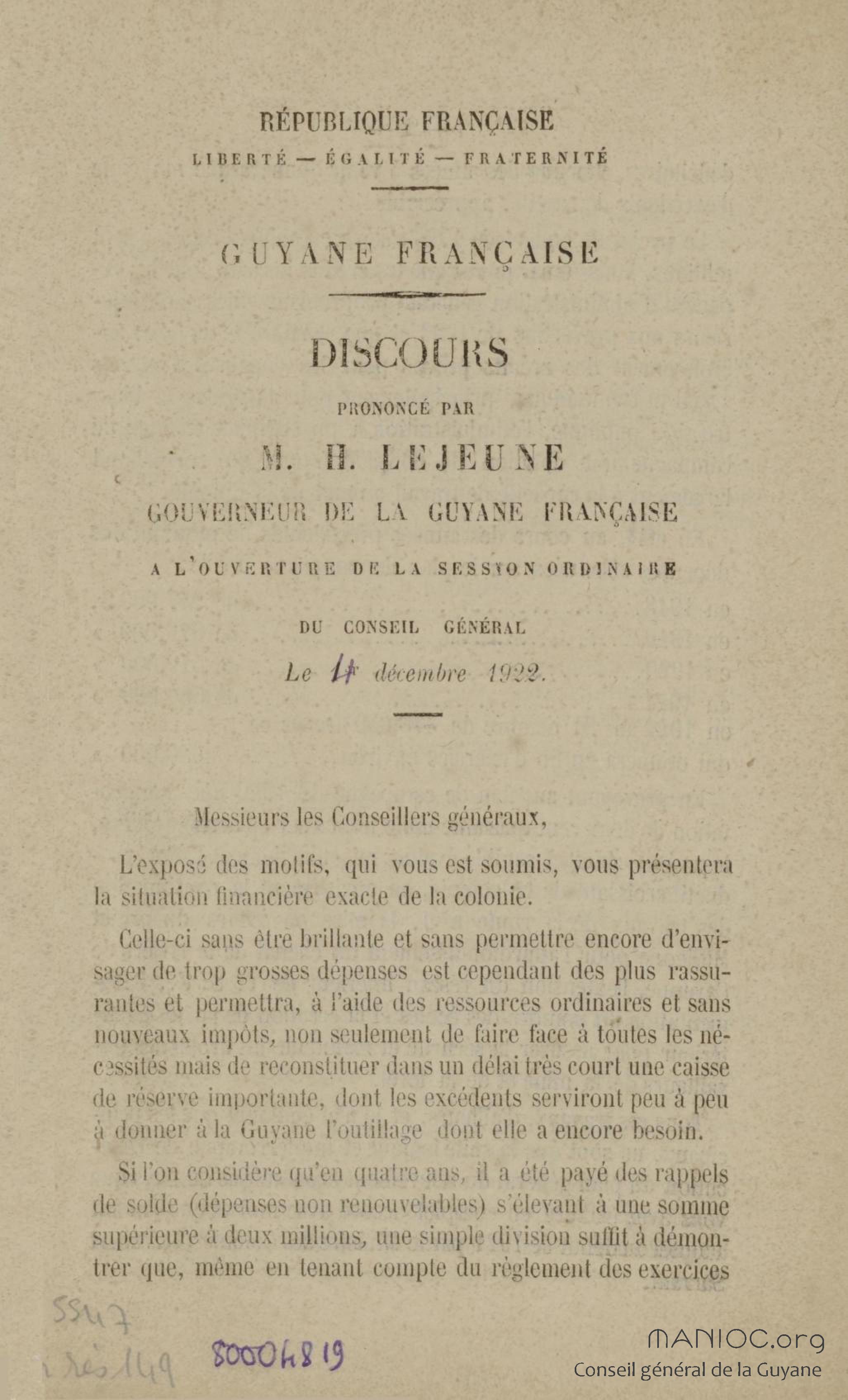 Discours prononcé par M. H. Lejeune, gouverneur de la Guyane française, à l'ouverture de la session ordinaire du conseil général le 4 décembre 1922