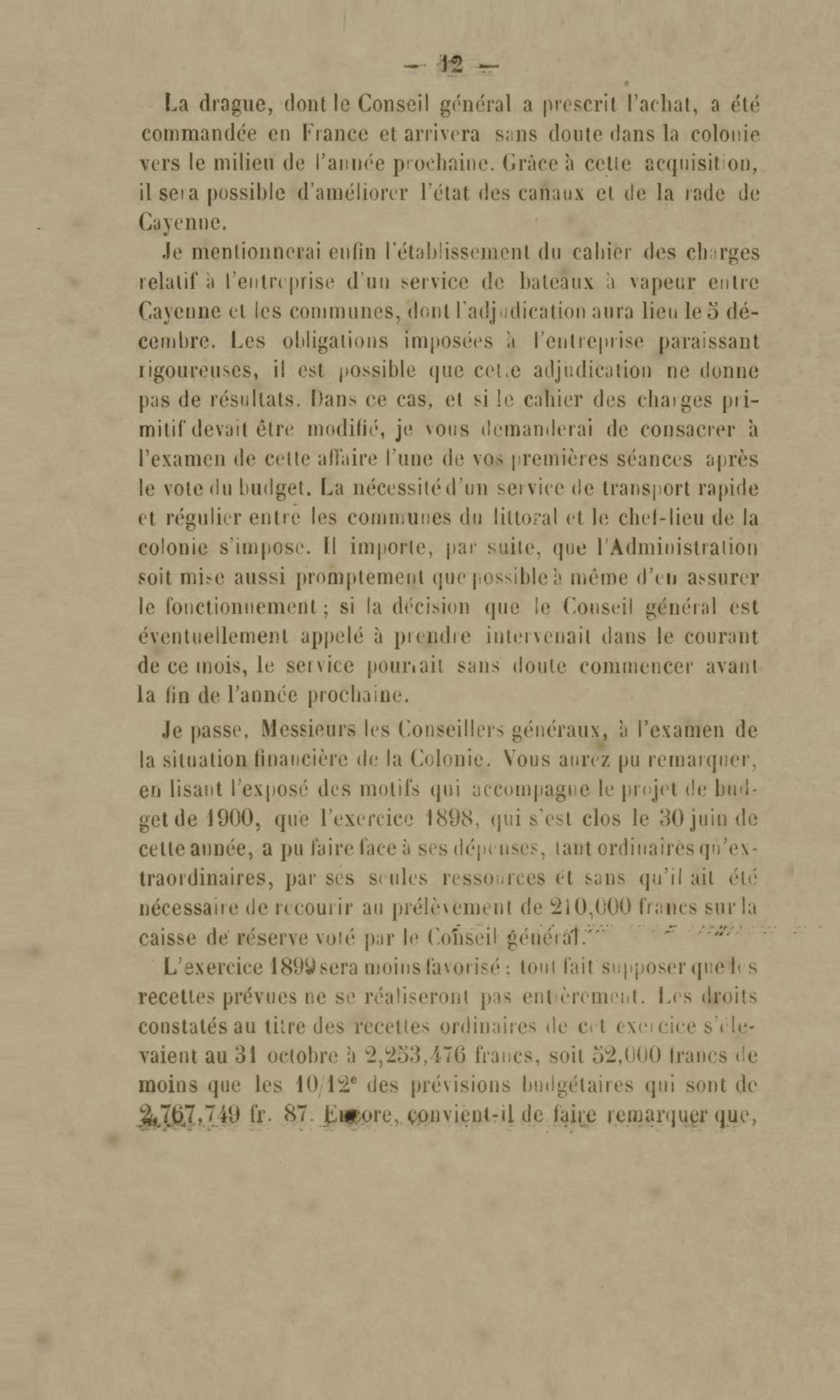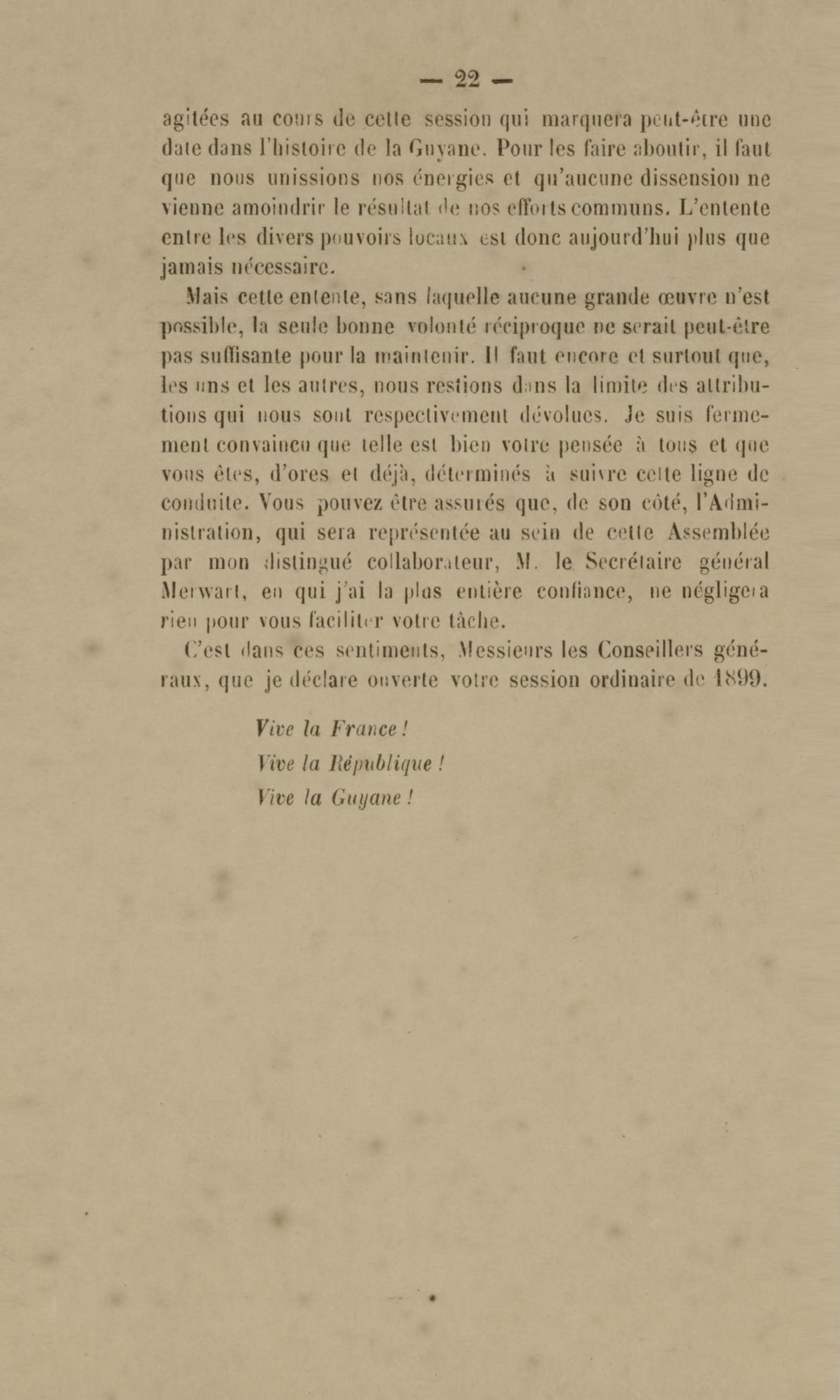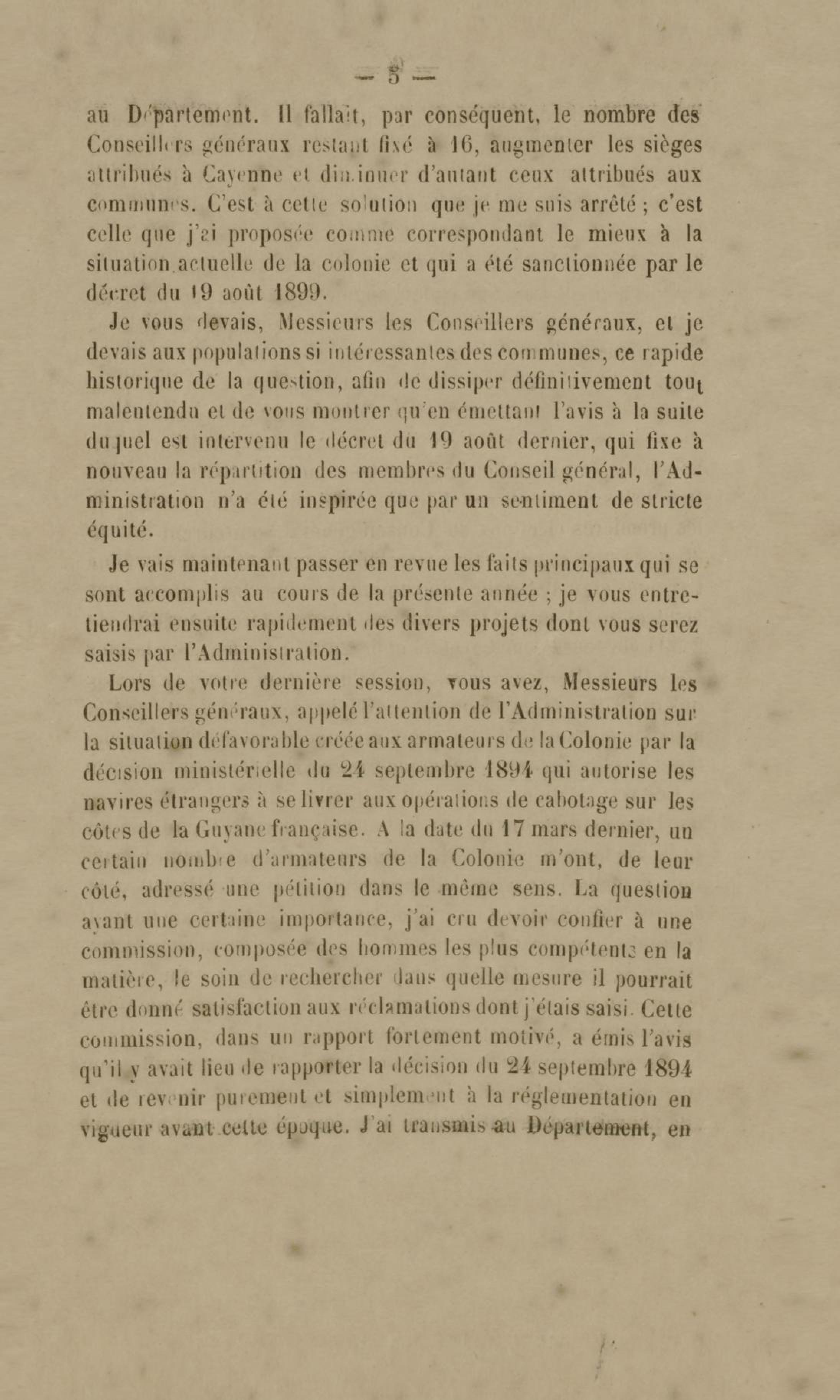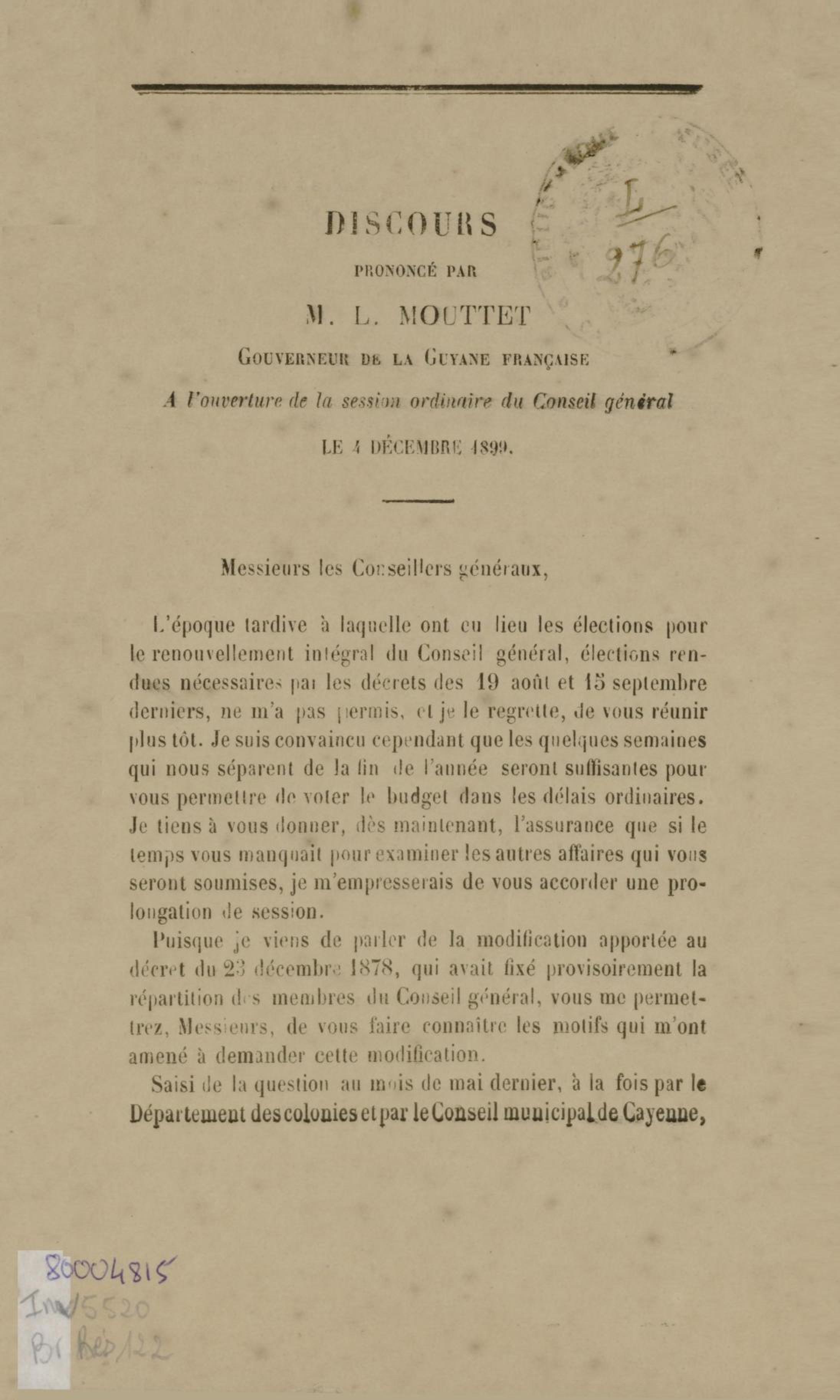 Discours prononcé par M. L. Mouttet, gouverneur de la Guyane française, à l'ouverture de la session ordinaire du conseil général le 4 décembre 1899