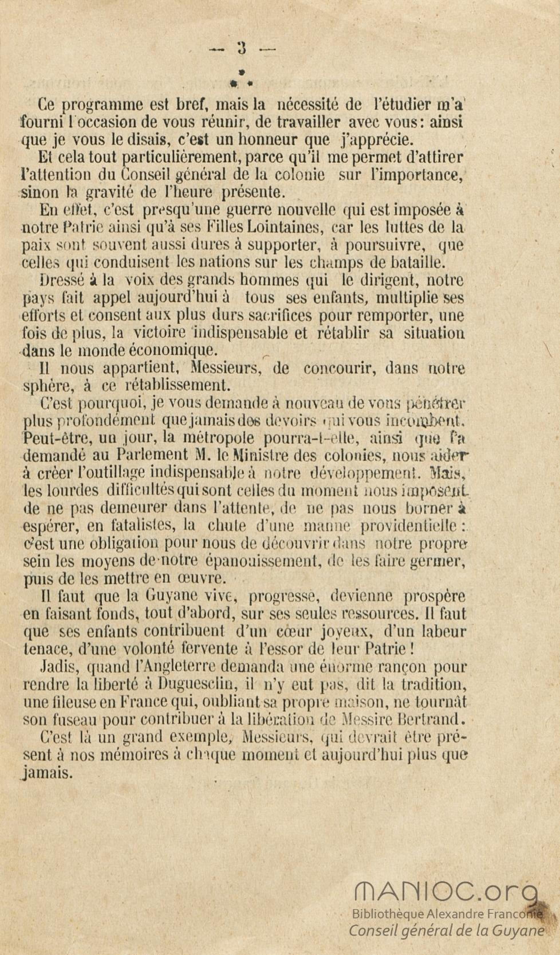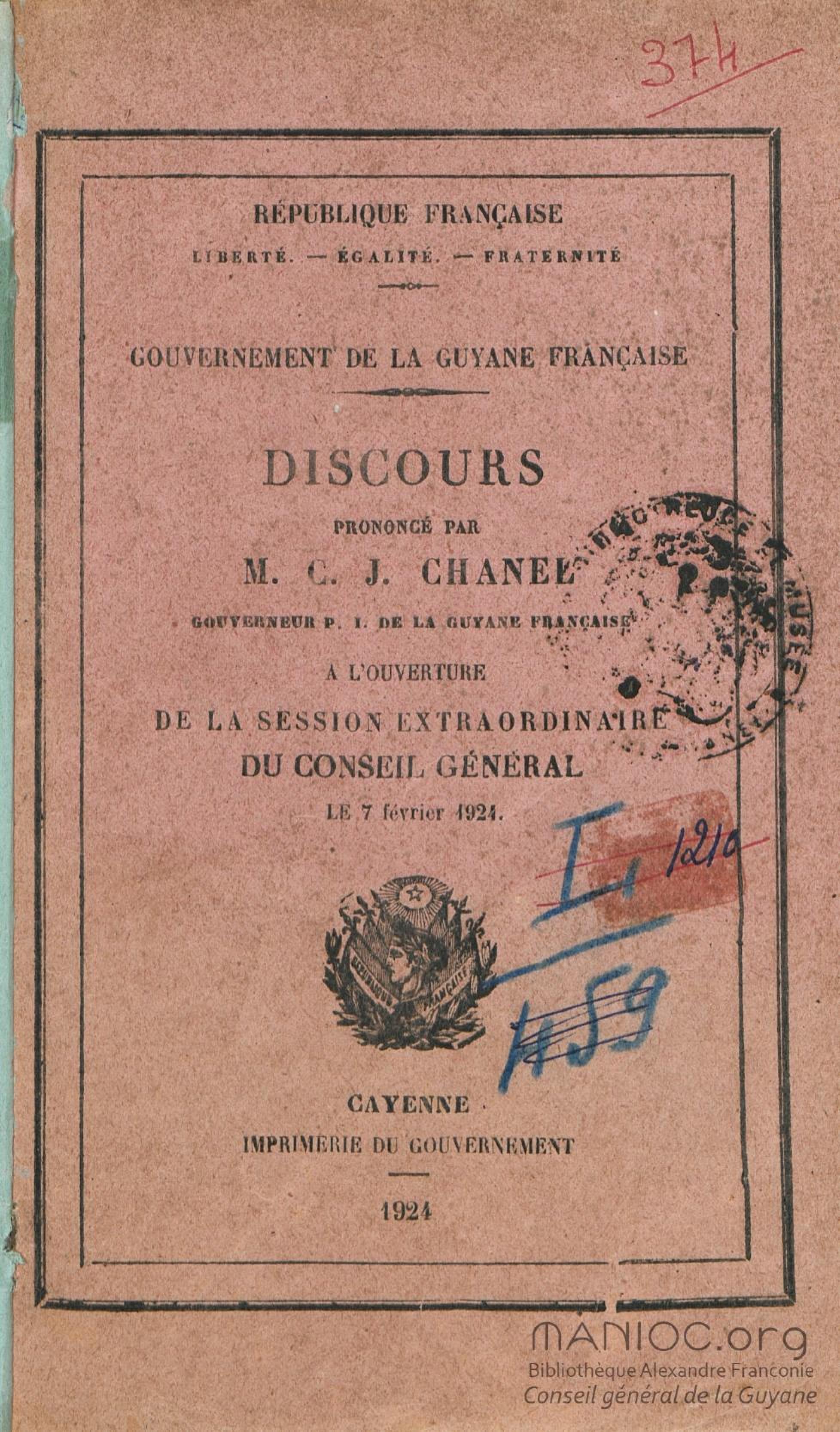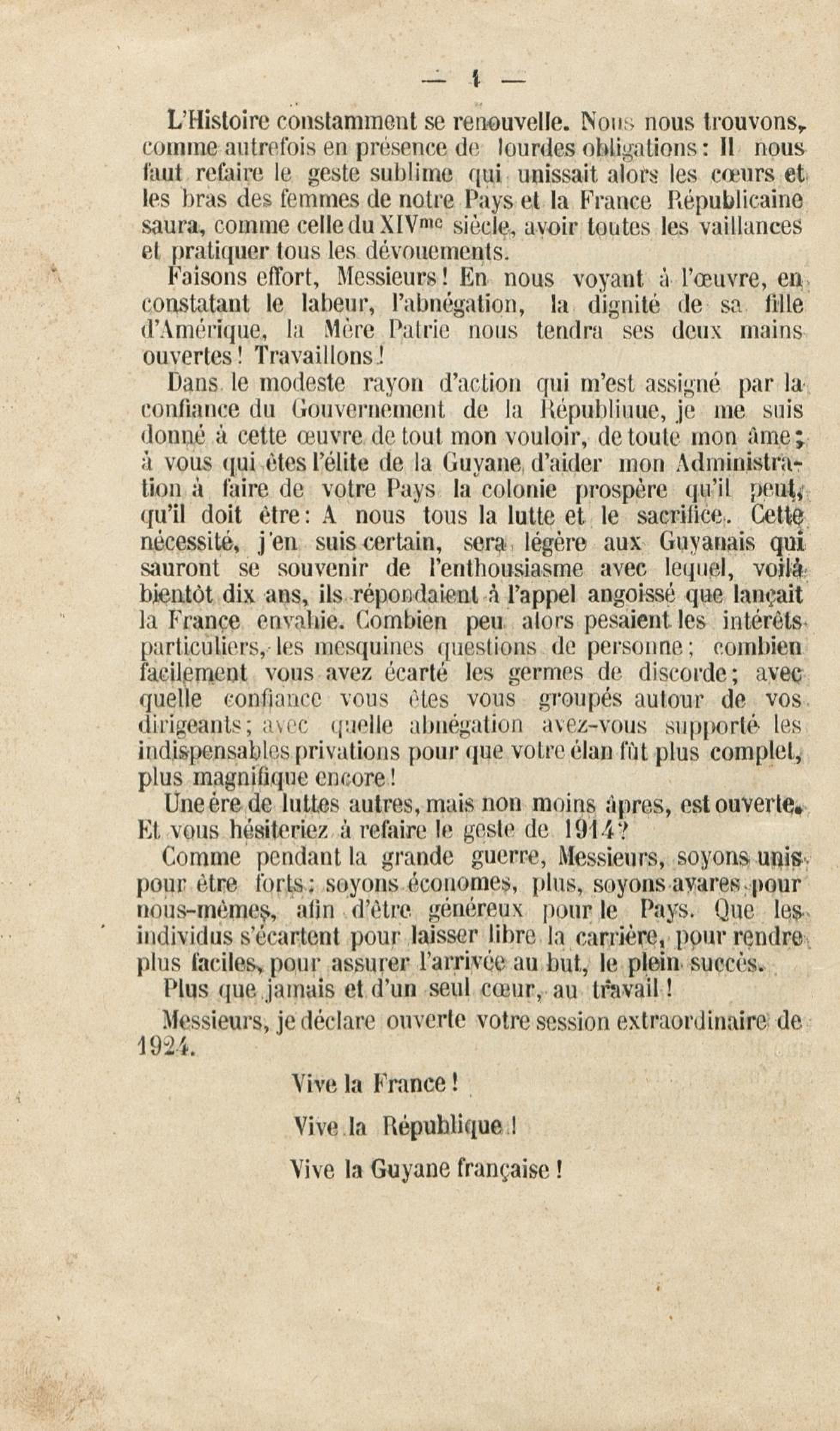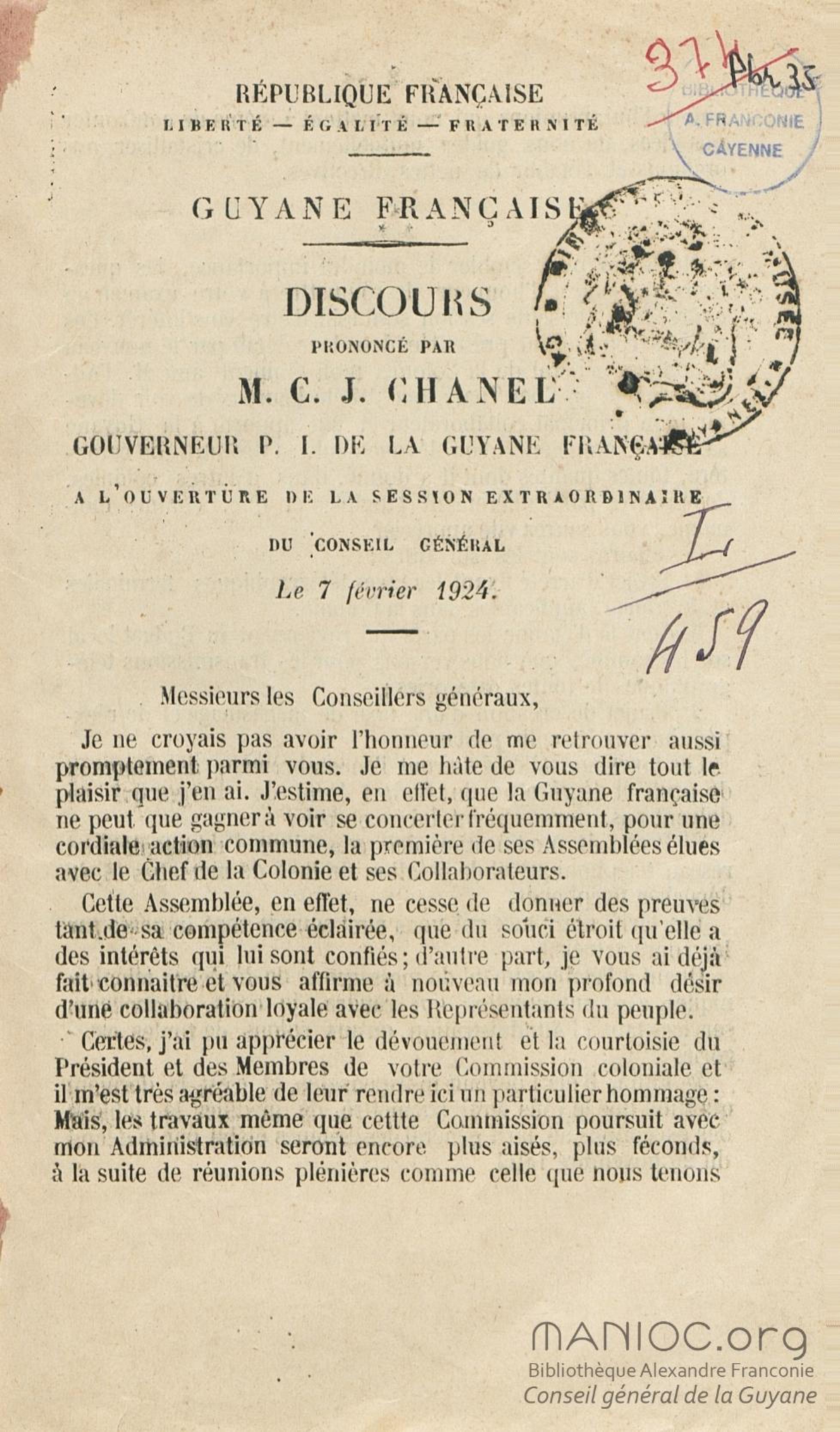 Discours prononcé par M. C. J. Chanel, gouverneur p. i. [par interim] de la Guyane française, à l'ouverture de la session extraordinaire du conseil général le 7 février 1924