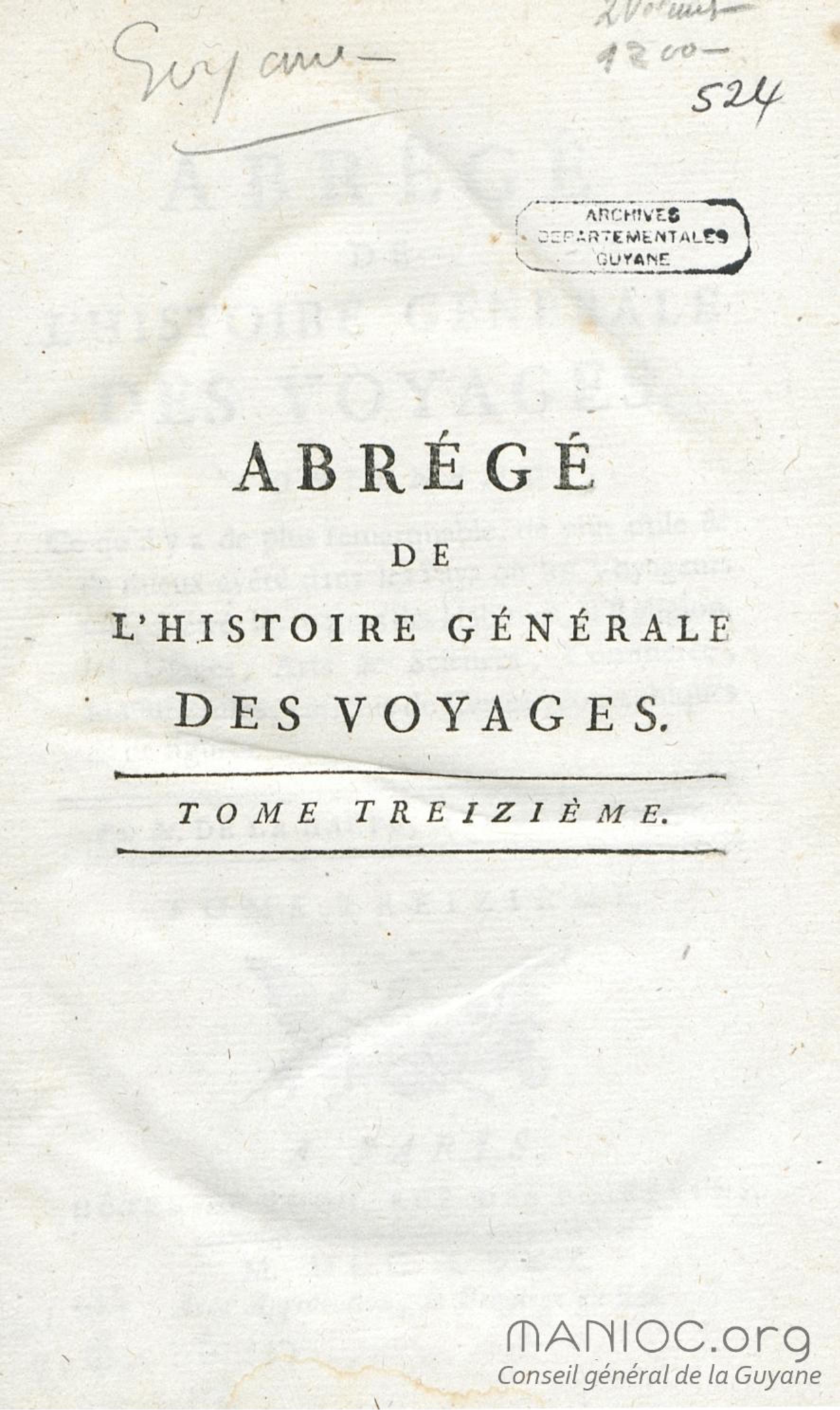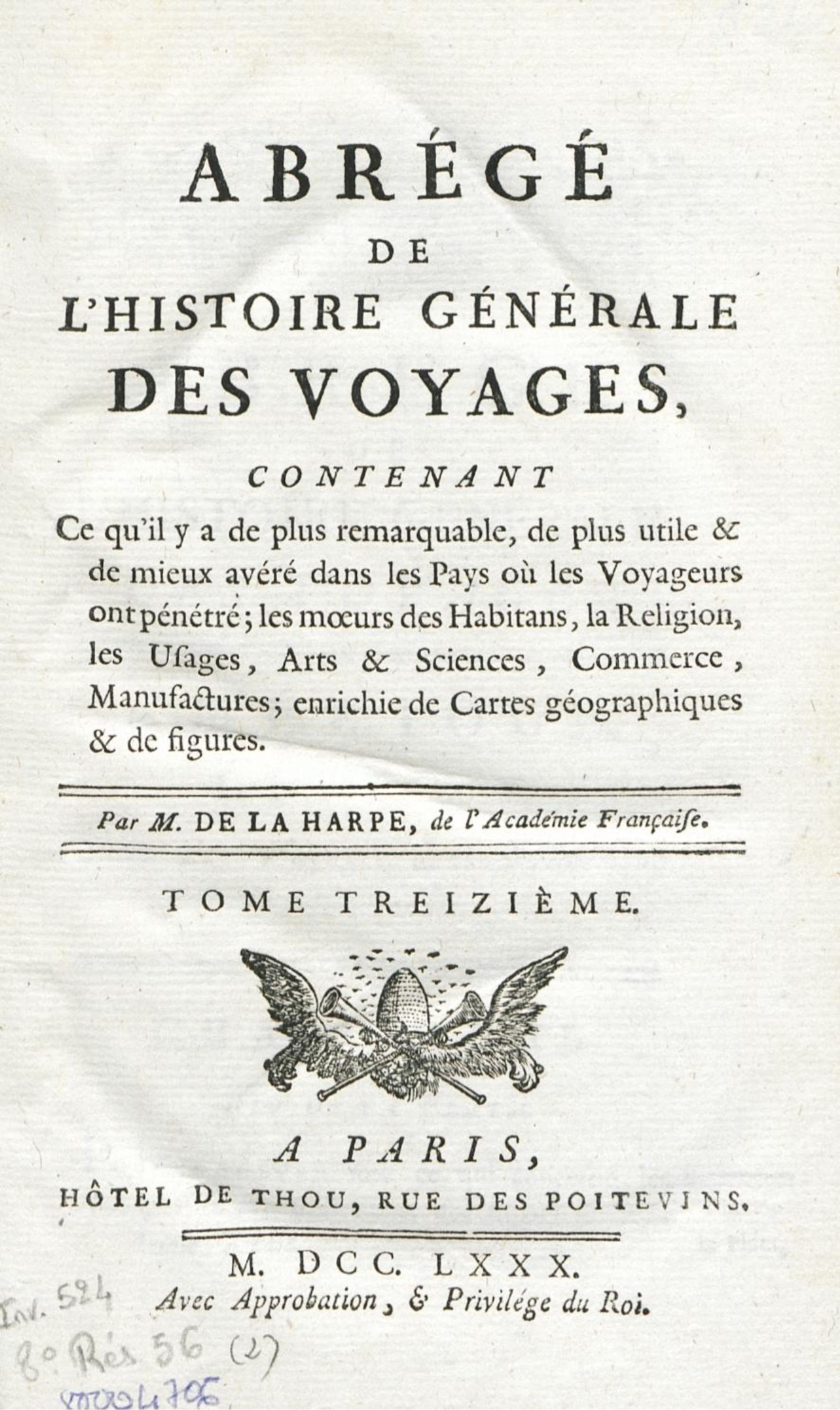 - Abrégé de l'histoire générale des voyages, contenant ce qu'il y a de plus remarquable, de plus utile & de mieux avéré dans les pays où les voyageurs ont pénétré : les moeurs des habitans, la religion, les usages, arts & sciences, commerce, manufactures : enrichie de cartes géographiques & de figures. Tome treizième, [Amérique]