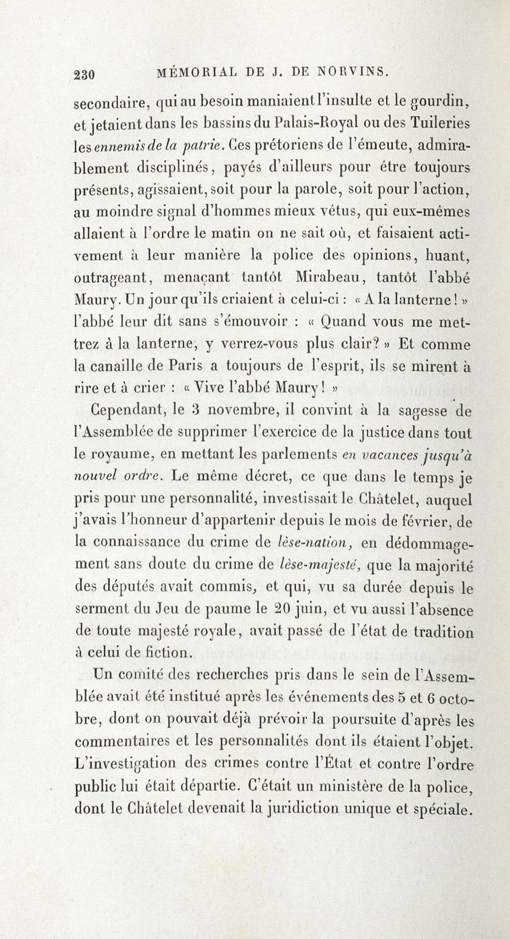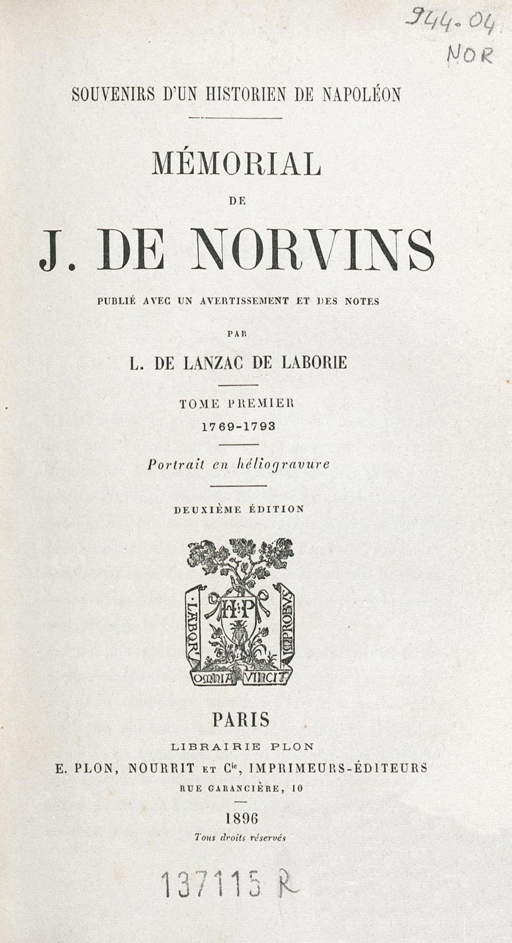 - Mémorial de J. de Norvins : souvenirs d'un historien de Napoléon. Tome premier, 1769-1793