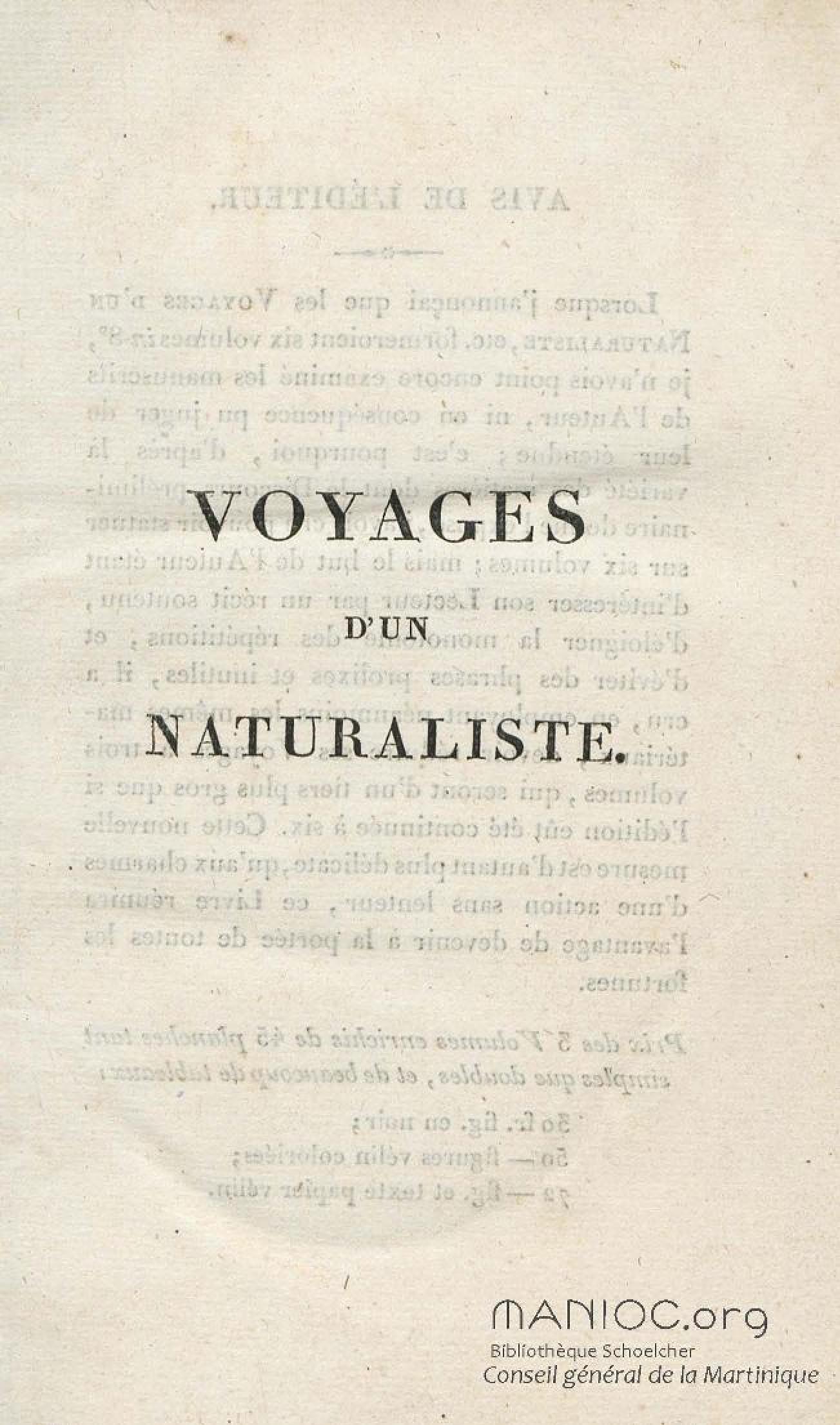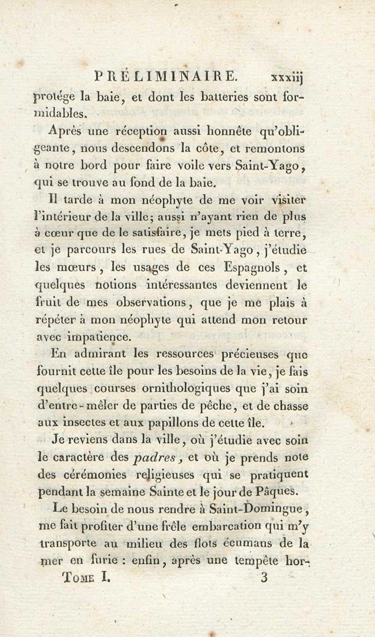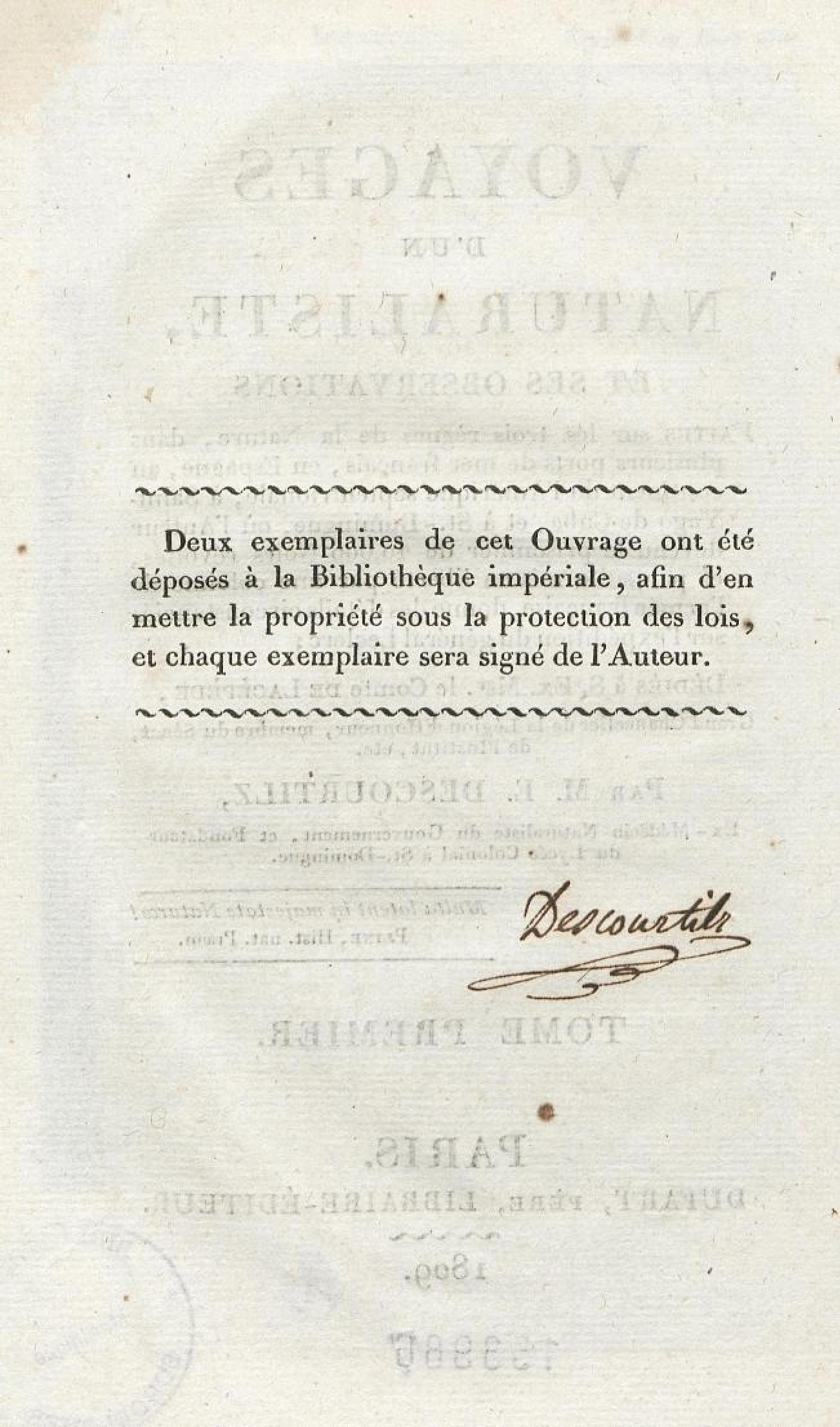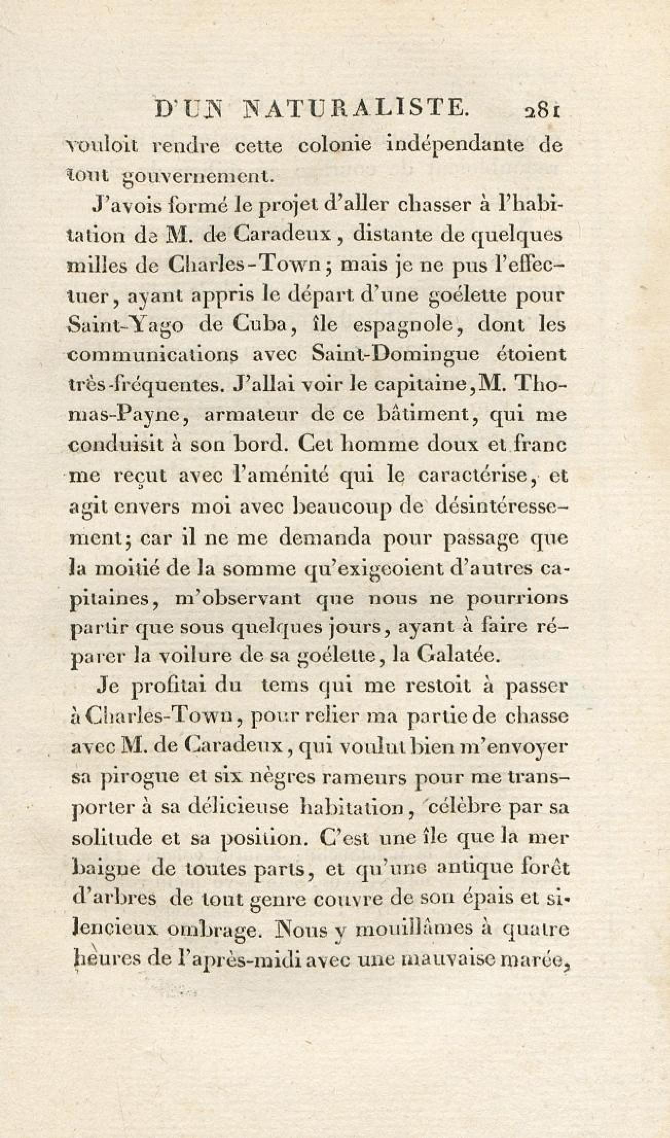 - Voyages d'un naturaliste et ses observations faites sur les trois règnes de la nature : dans plusieurs ports de mer français, en Espagne, au continent de l'Amérique septentrionale, à Saint-Yago de Cuba et à St-Domingue, où l'auteur devenu le prisonnier de 40000 Noirs révoltés, et par suite mis en liberté par une colonne de l'armée française, donne des détails circonstanciés sur l'expédition du général Leclerc. Tome 1