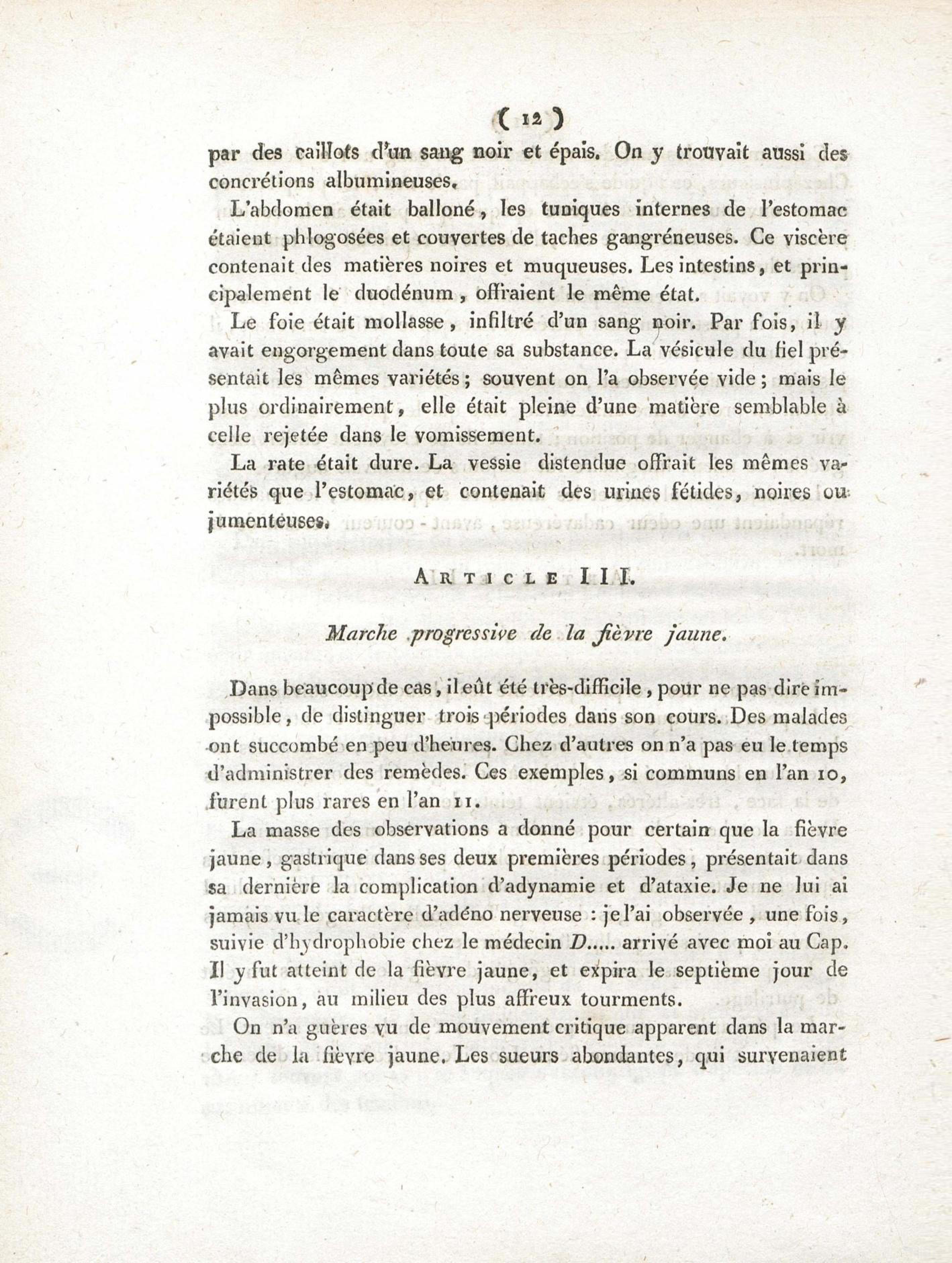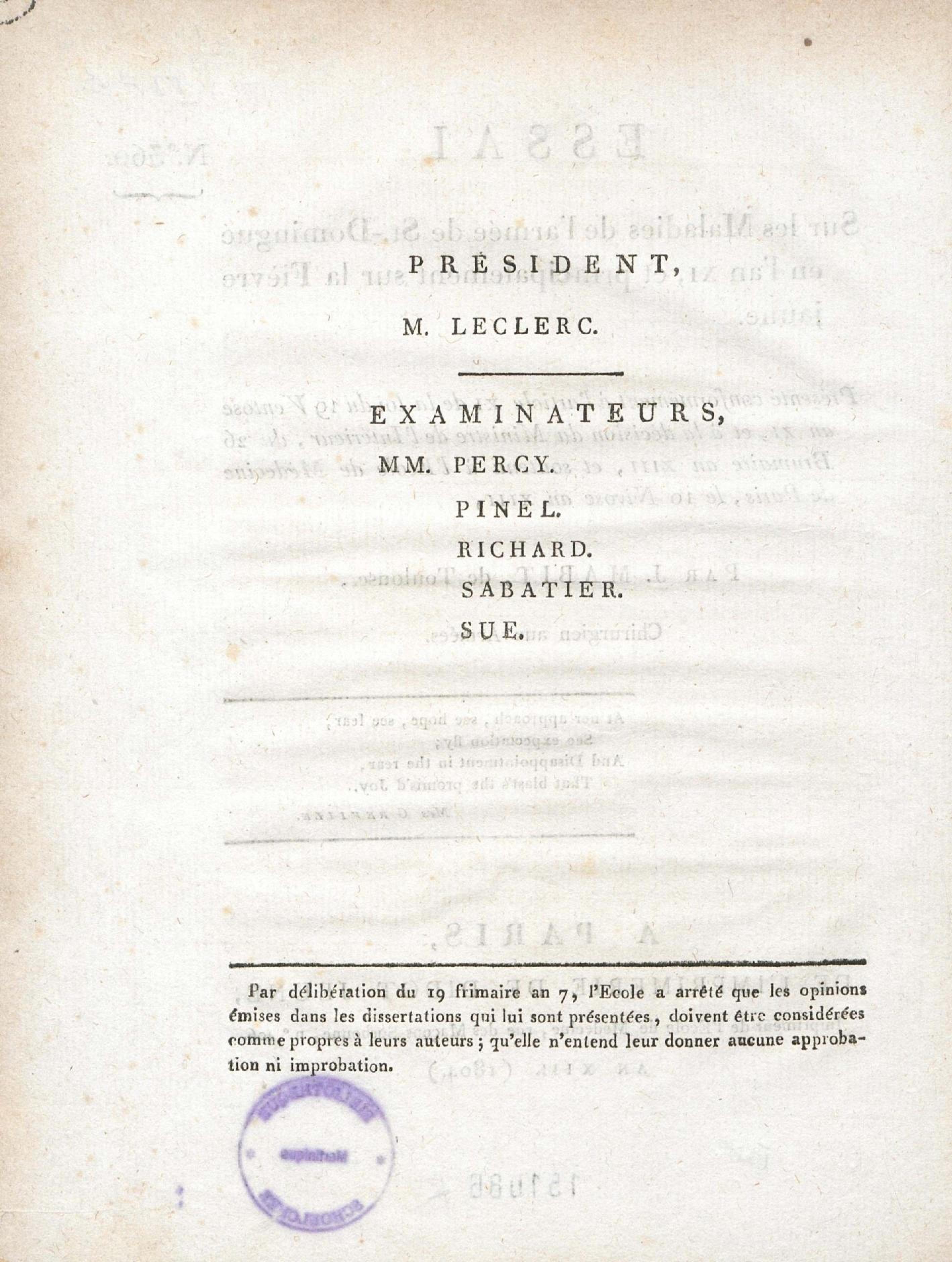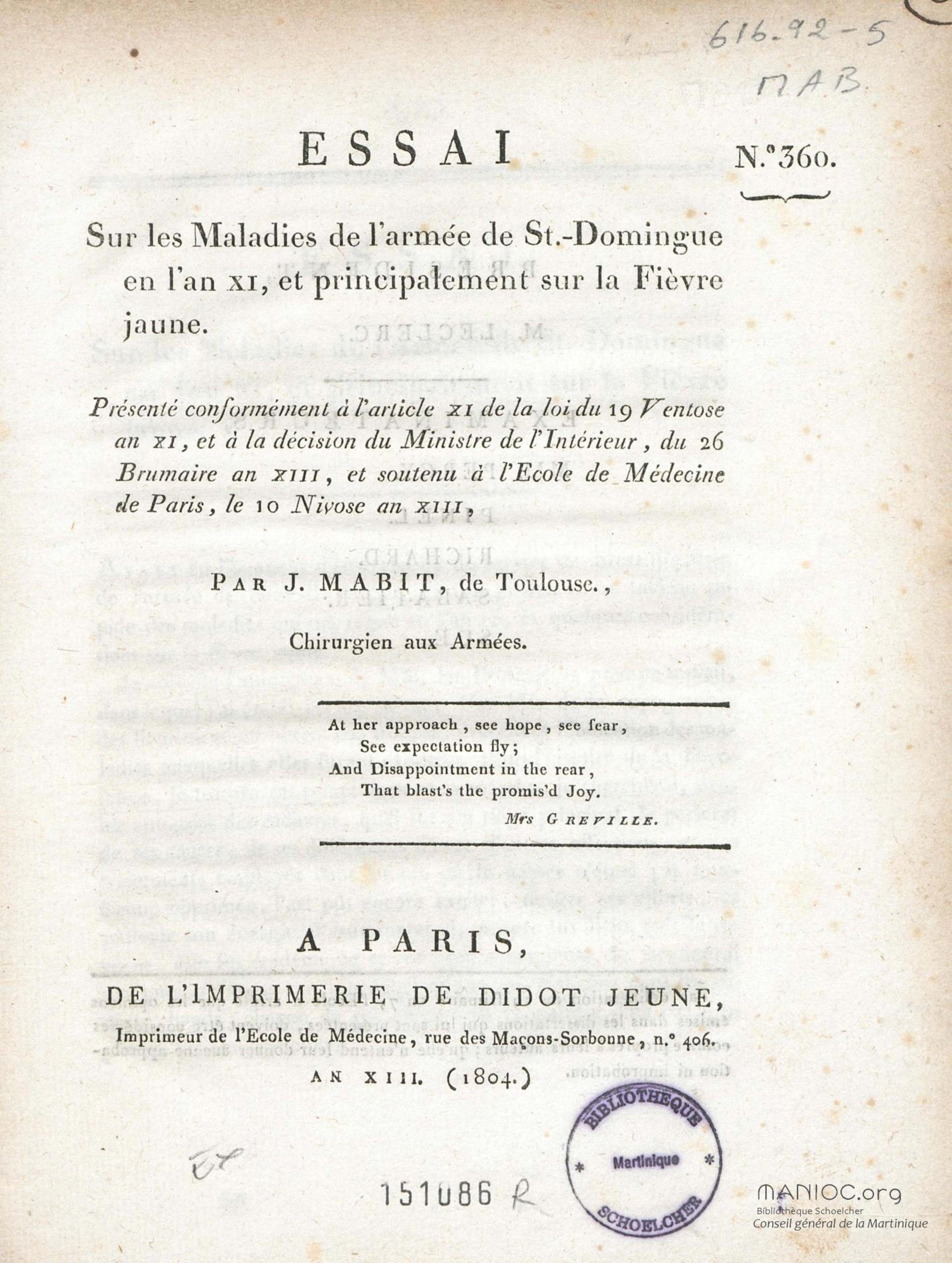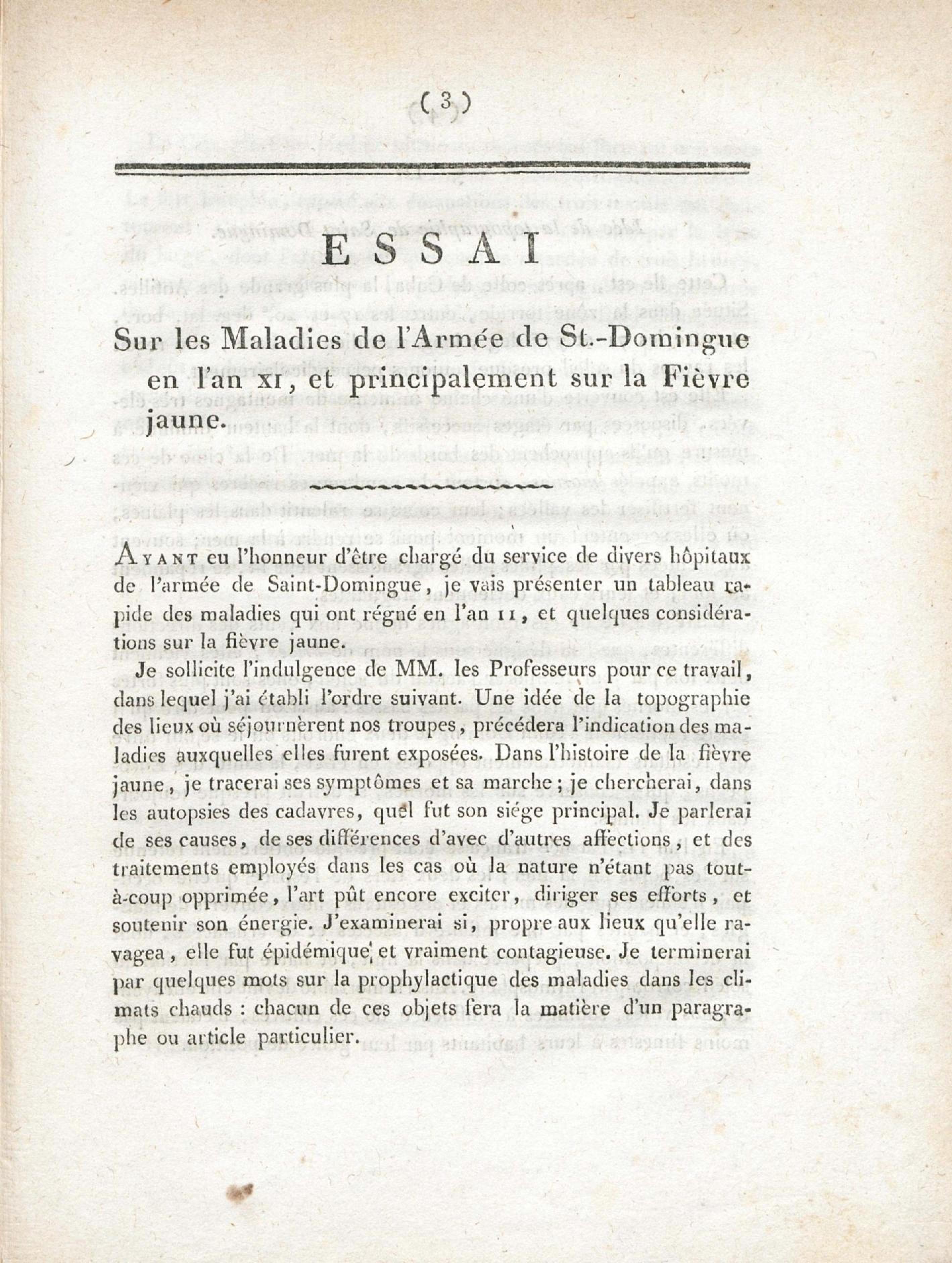 Essai sur les maladies de l'armée de St.-Domingue en l'an XI, et principalement sur la fièvre jaune : présenté conformément à l'article XI de la loi du 19 ventose an XI, et à la décision du Ministre de l'Intérieur, du 26 brumaire an XIII, et soutenu à l'Ecole de médecine de Paris, le 10 nivose an XIII