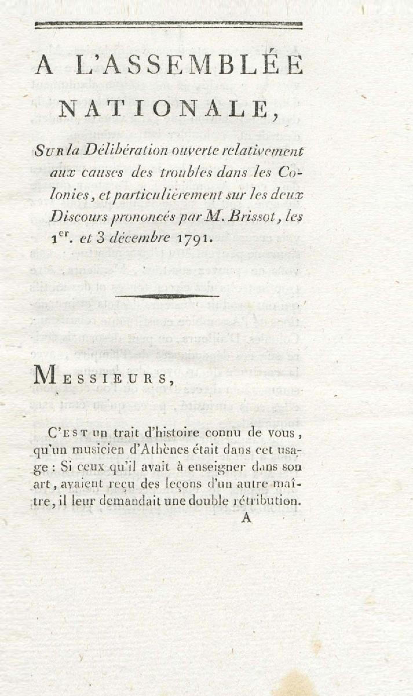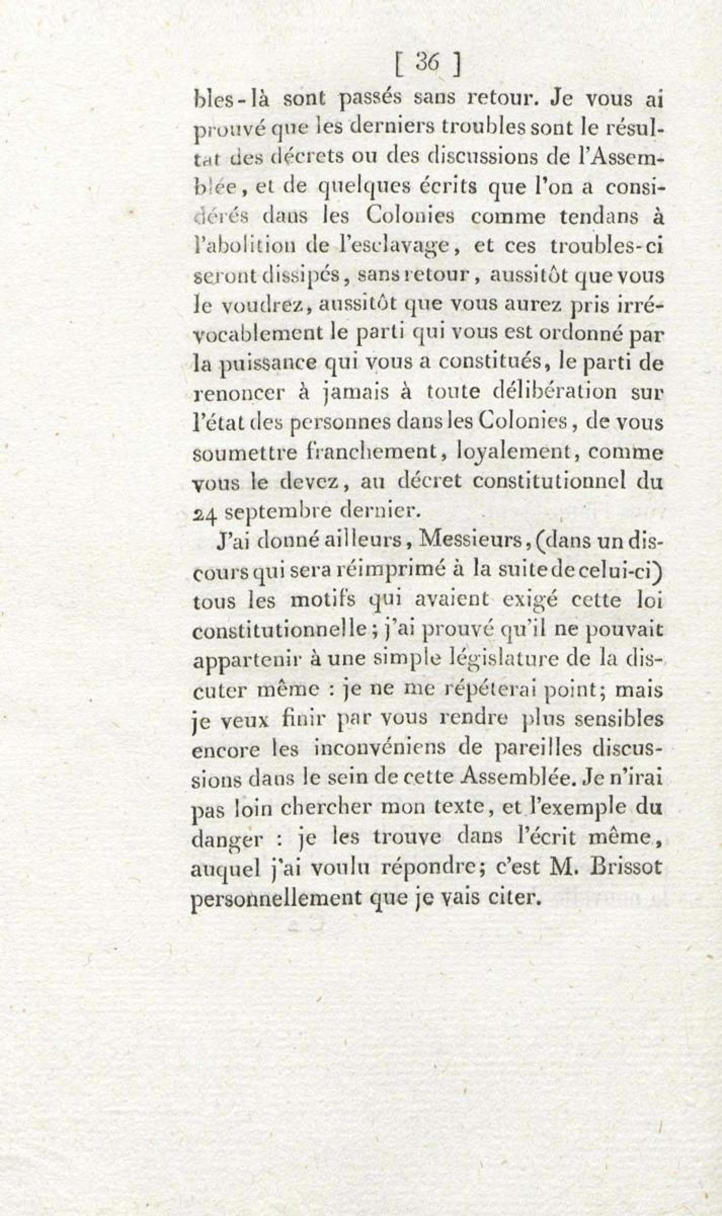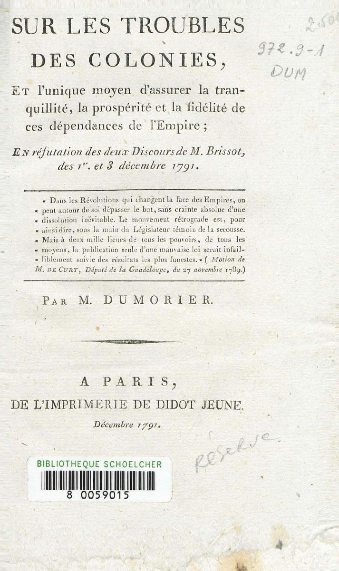 - Sur les troubles des colonies, et l'unique moyen d'assurer la tranquillité, la prospérité et la fidélité de ces dépendances de l'Empire : en réfutation des deux discours de M. Brissot, des 1er et 3 décembre 1791