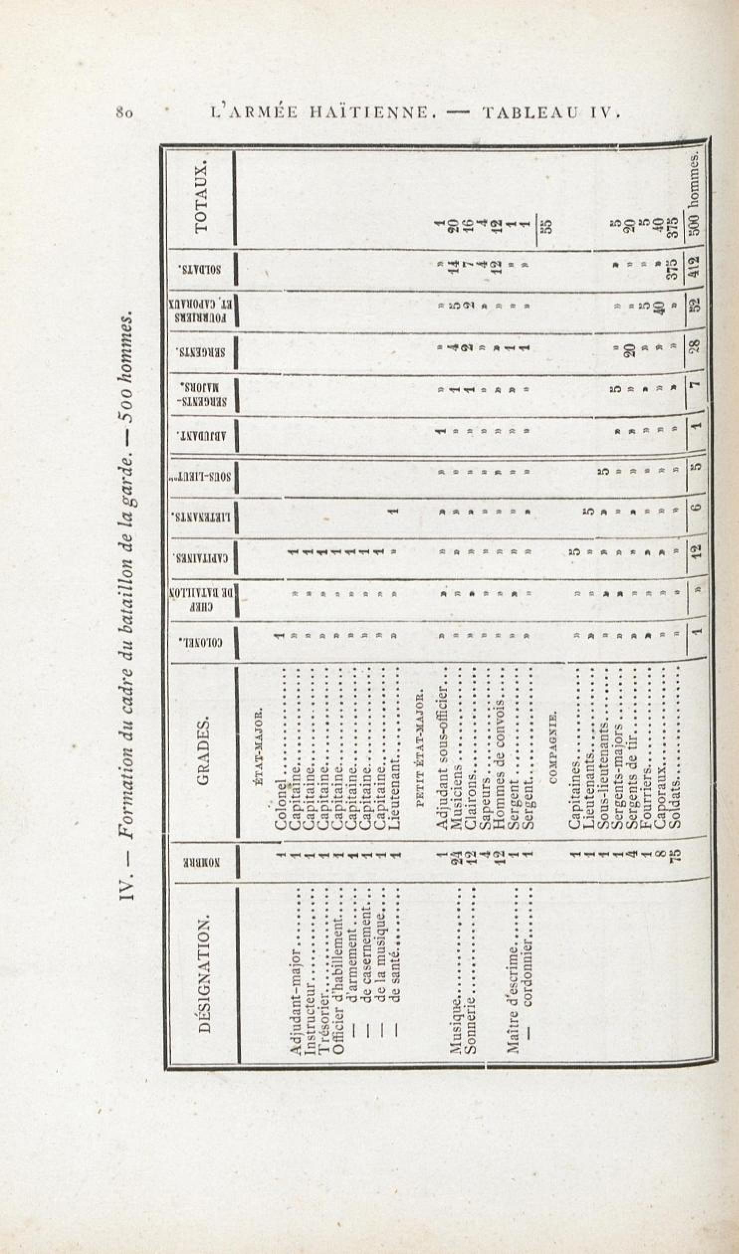 L'armée haïtienne. Tableau IV. - Formation du cadre du bataillon de la garde. - 500 hommes. |