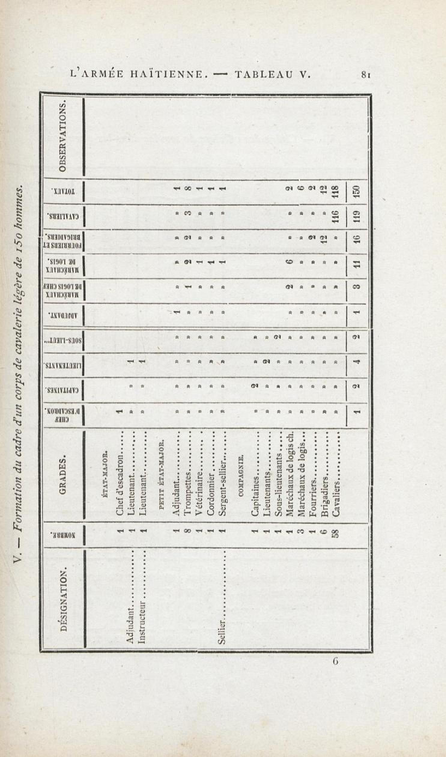 L'armée haïtienne. Tableau V. - Formation du cadre d'un corps de cavalerie légère de 150 hommes.