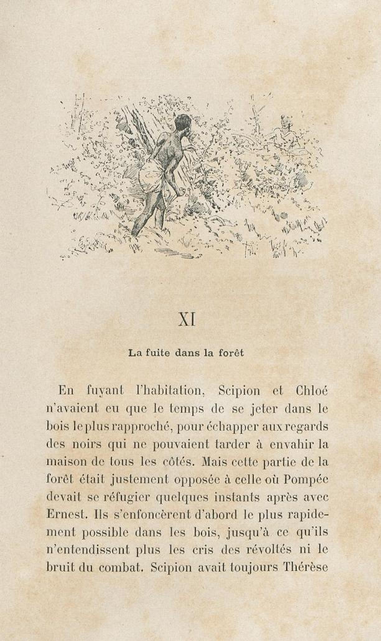 Scène de fuite dans la forêt.