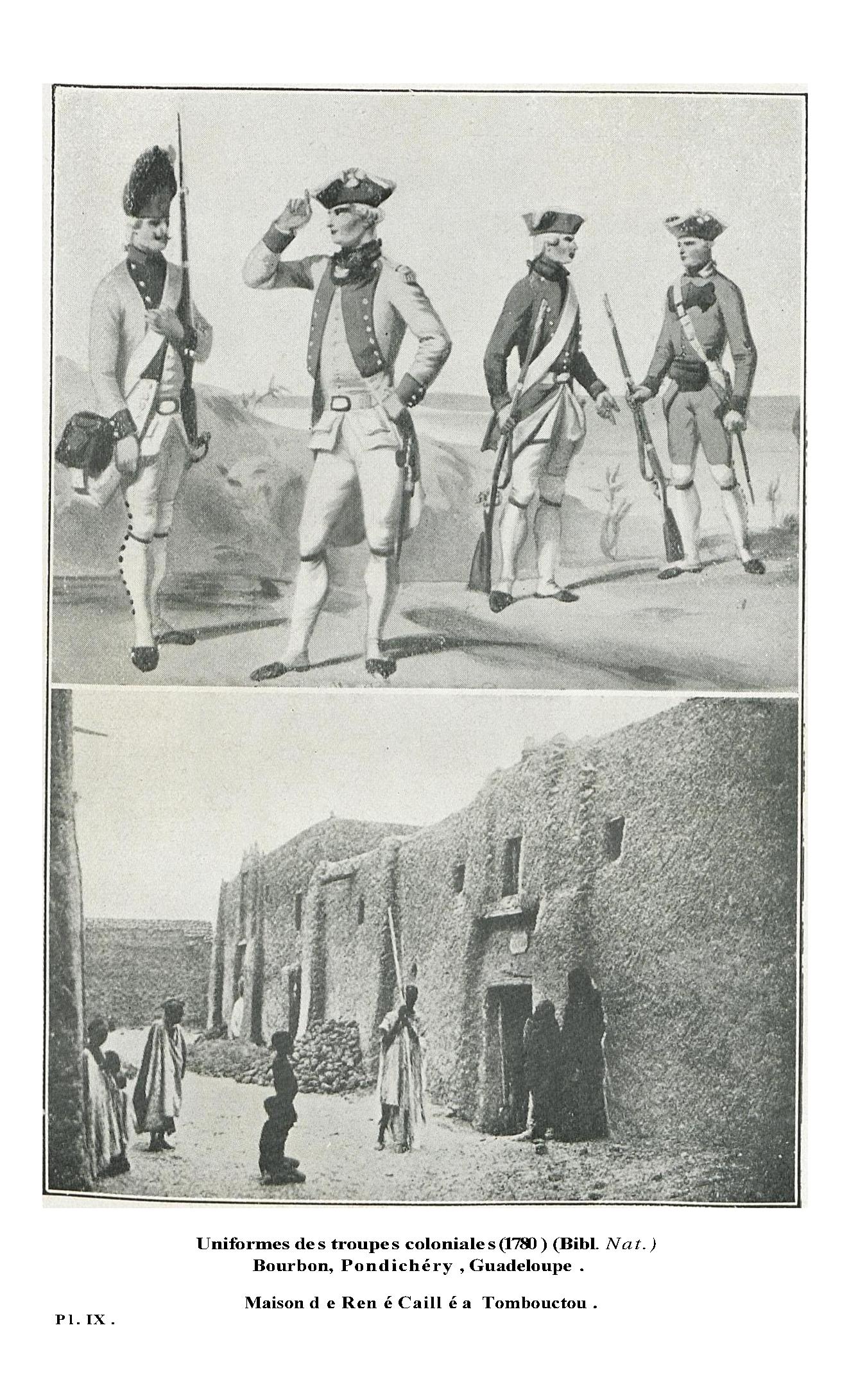 [Uniformes des troupes coloniales ( 1780 ). ( Bibliothèque Nationale ). Bourbon, Pondichery, Guadeloupe. Maison de René Caillé à Tombouctou]
