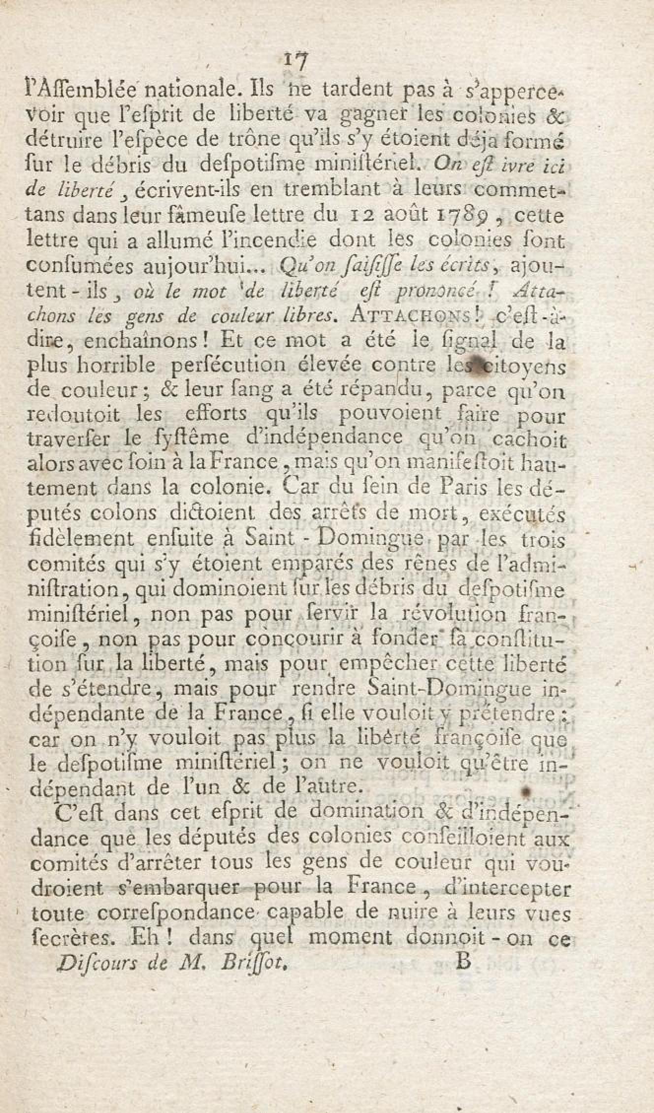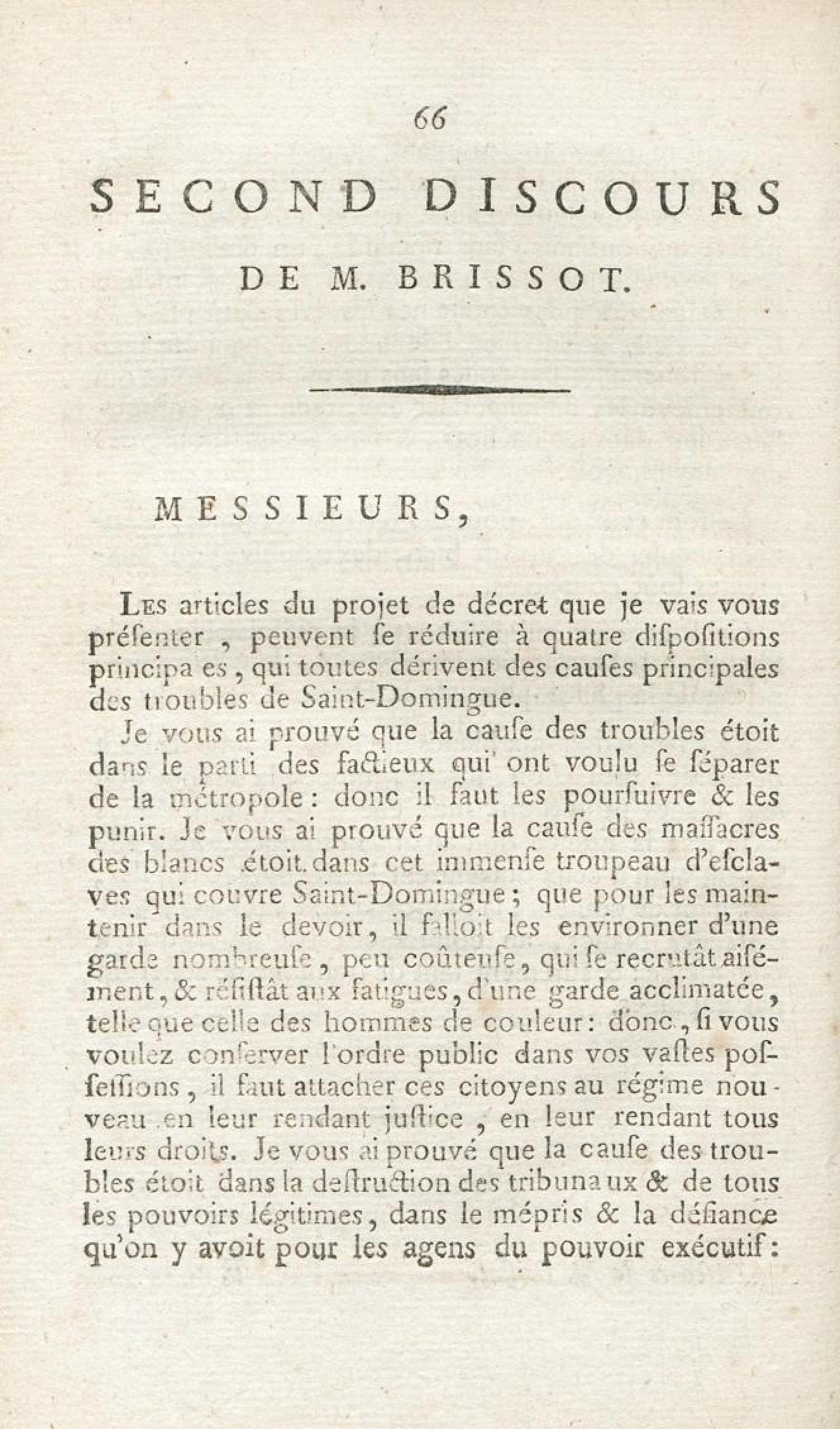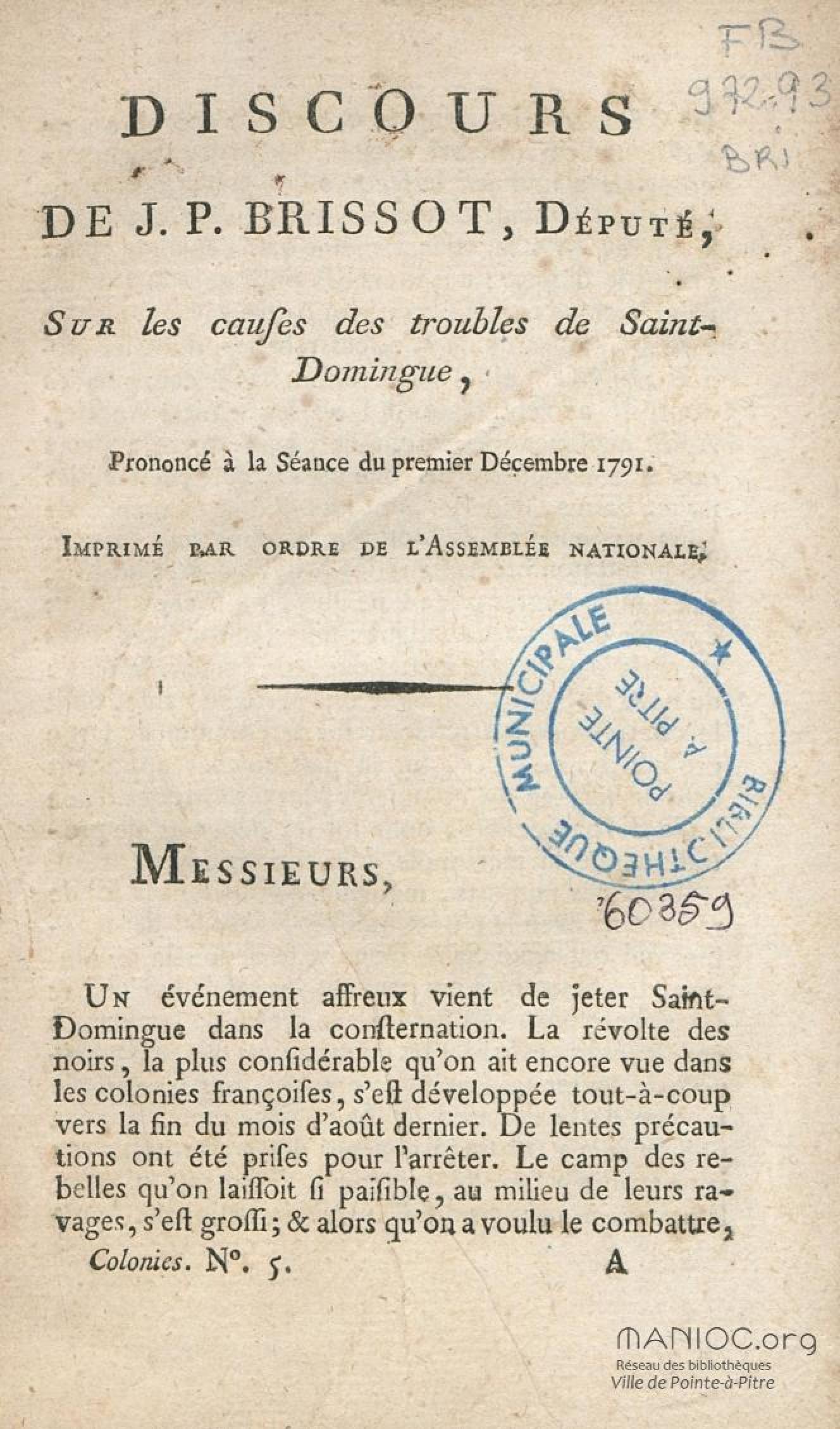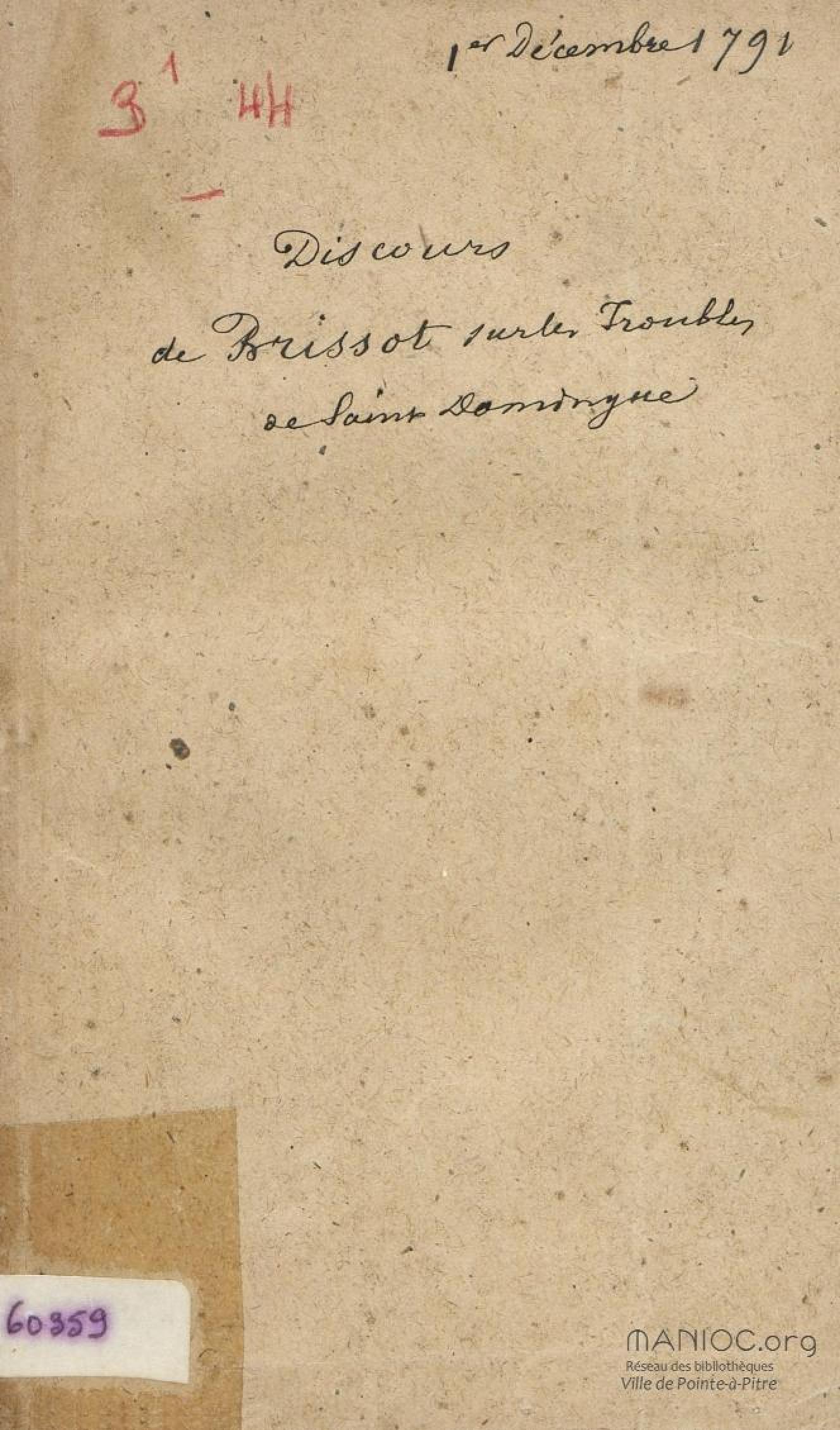 - Discours de J. P. Brissot, député, sur les causes des troubles de Saint-Domingue : prononcé à la séance du premier décembre 1791