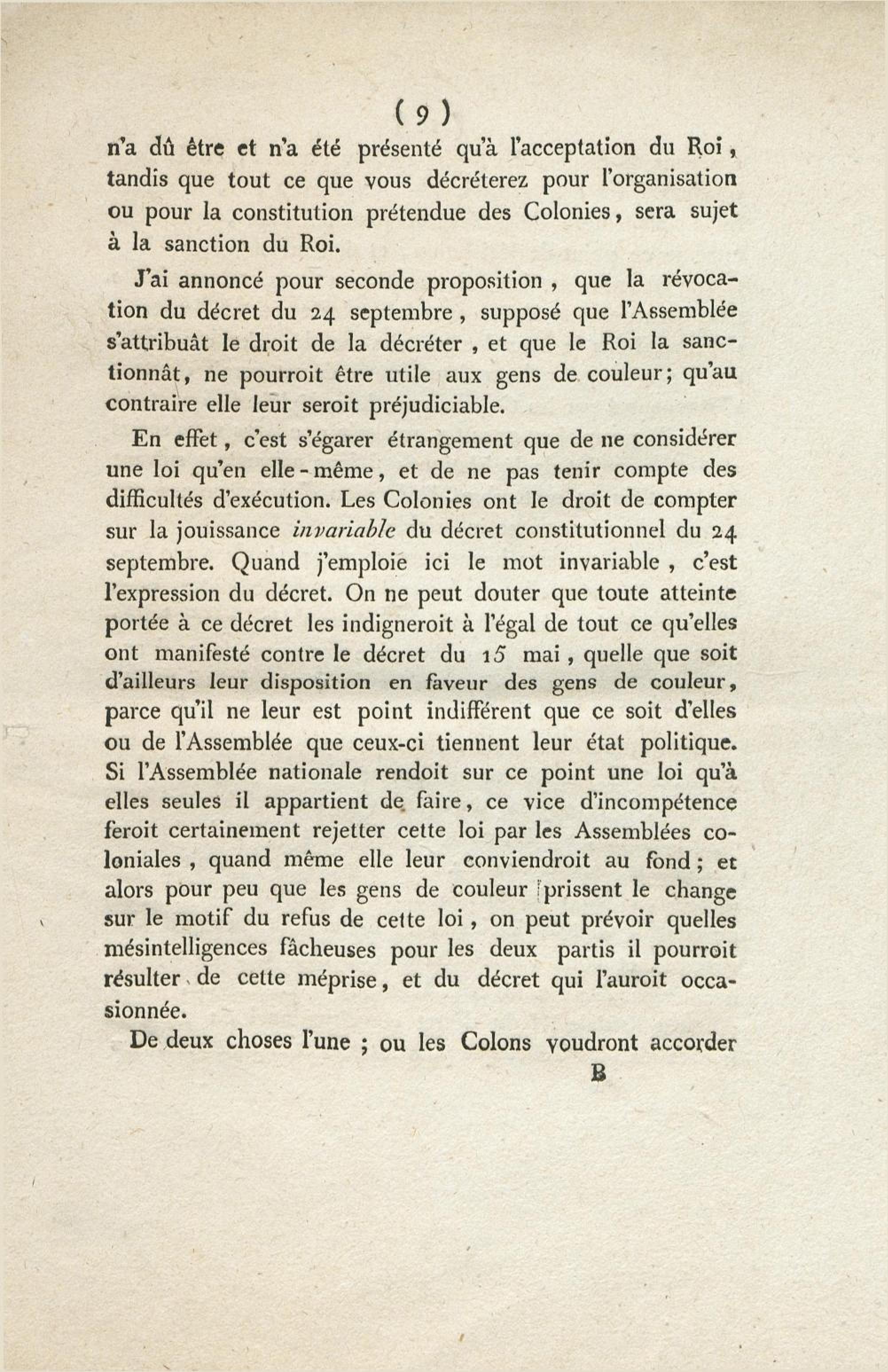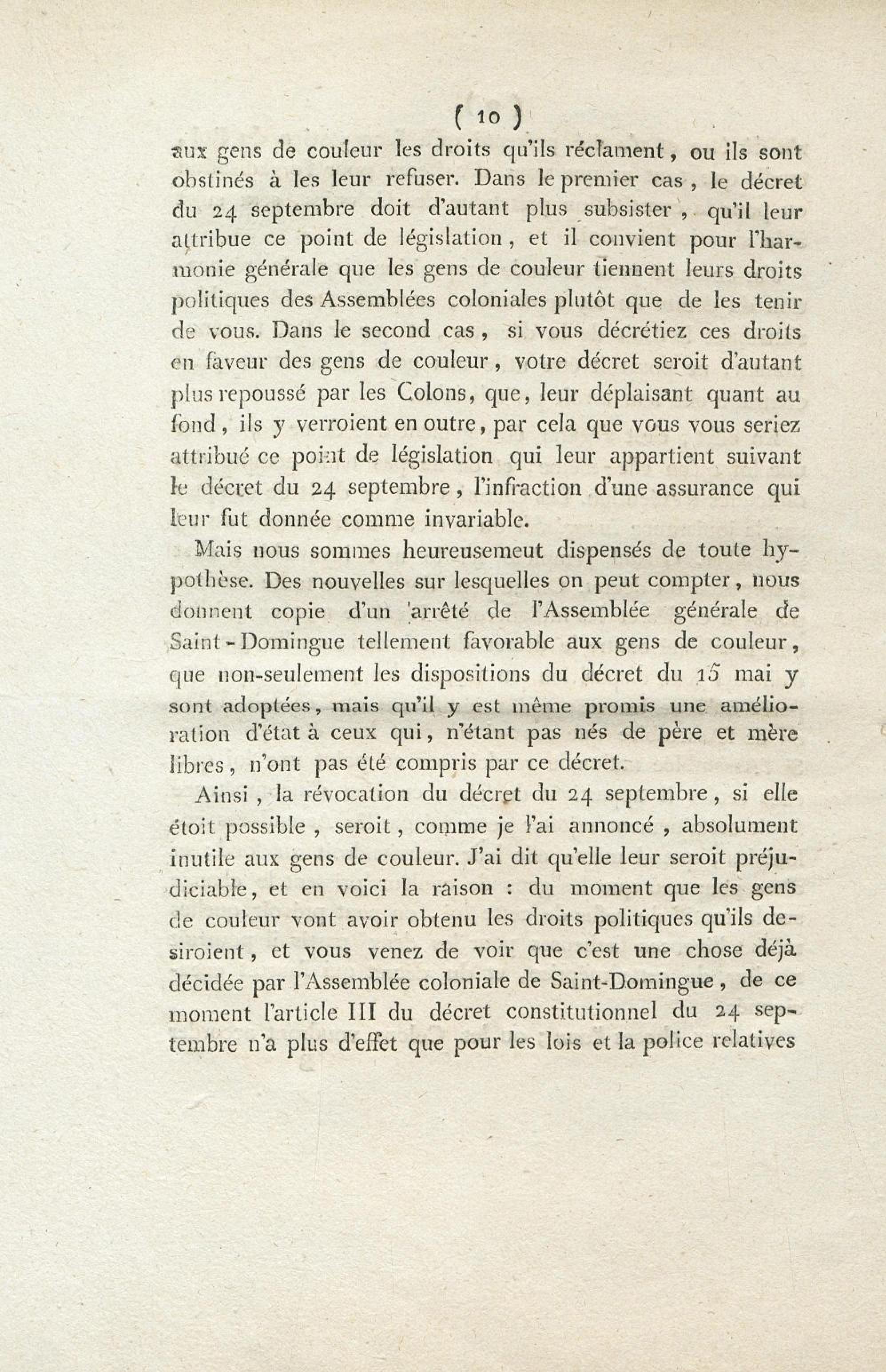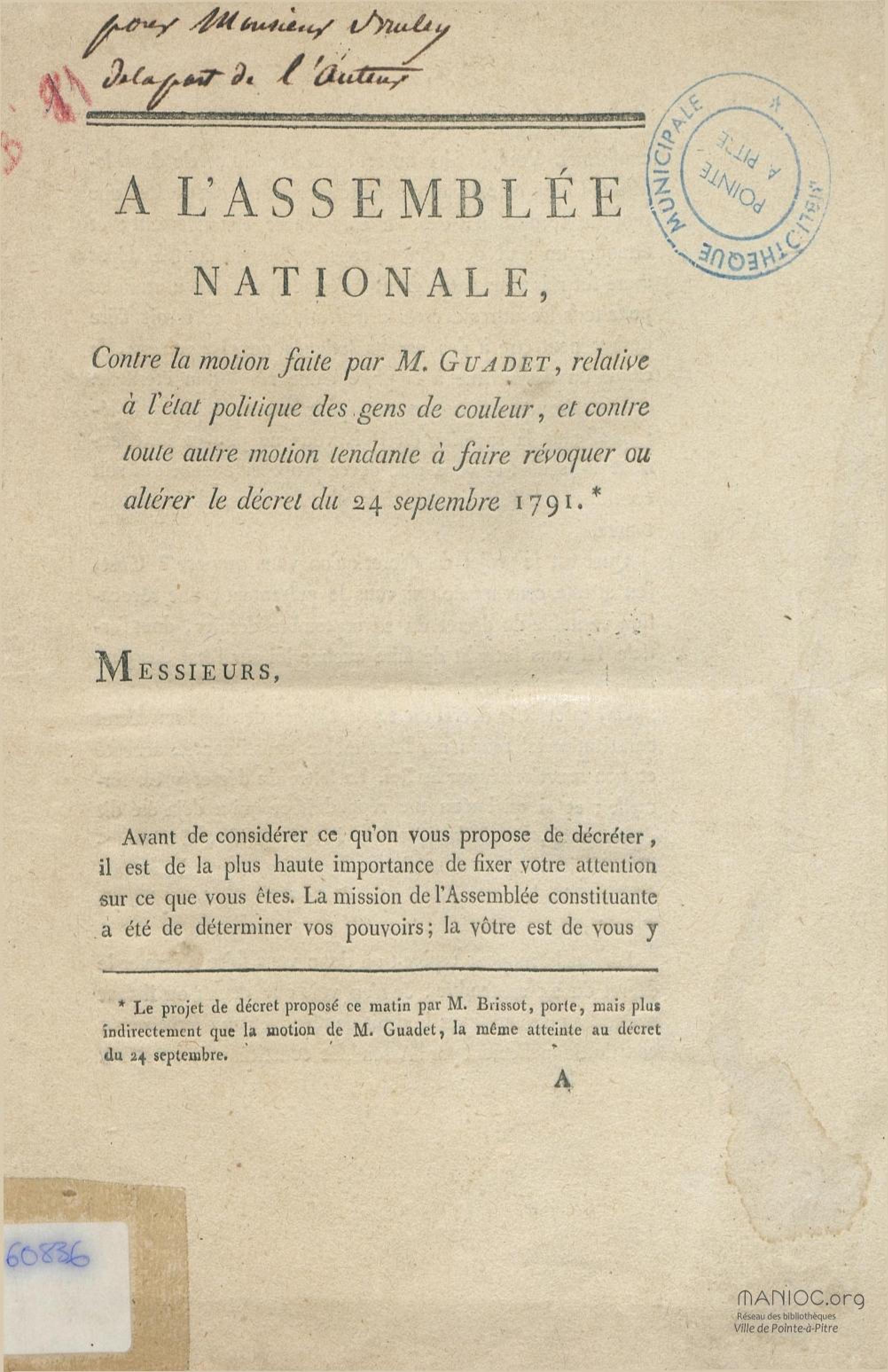A l'Assemblée nationale, contre la motion faite par M. Guadet, relative à l'état politique des gens de couleur, et contre toute autre motion tendante à faire révoquer ou altérer le décret du 24 septembre 1791