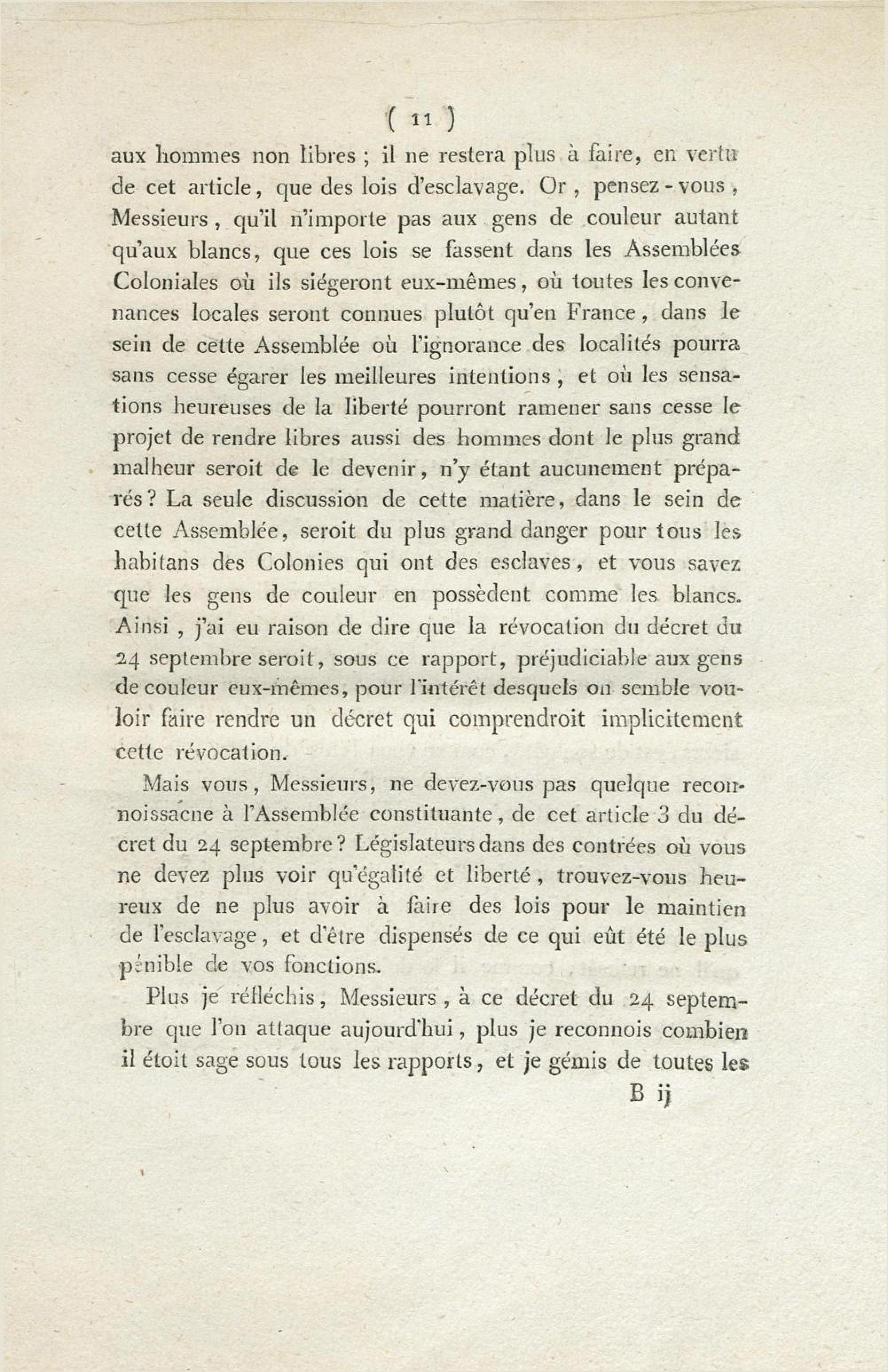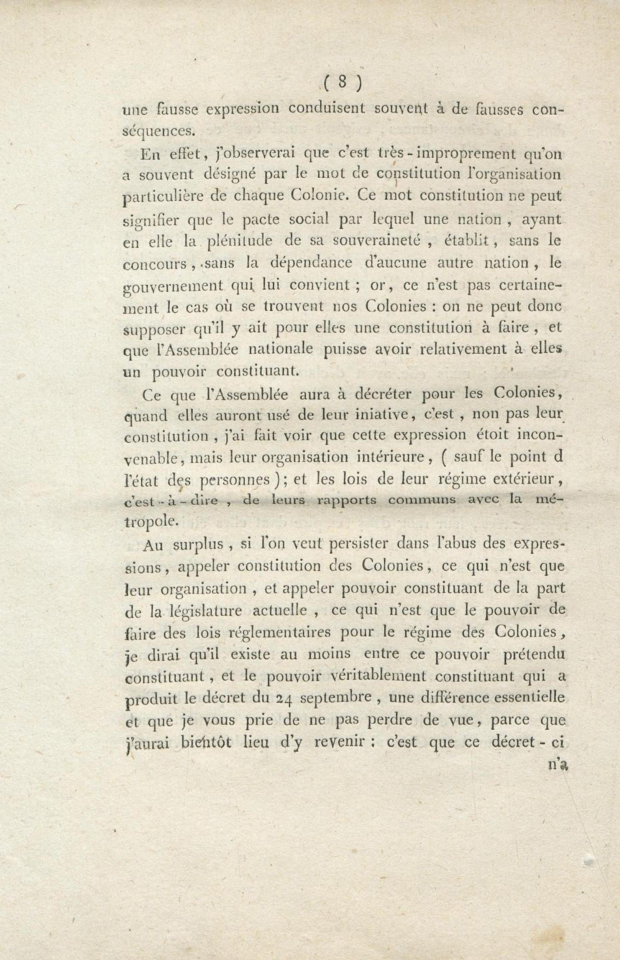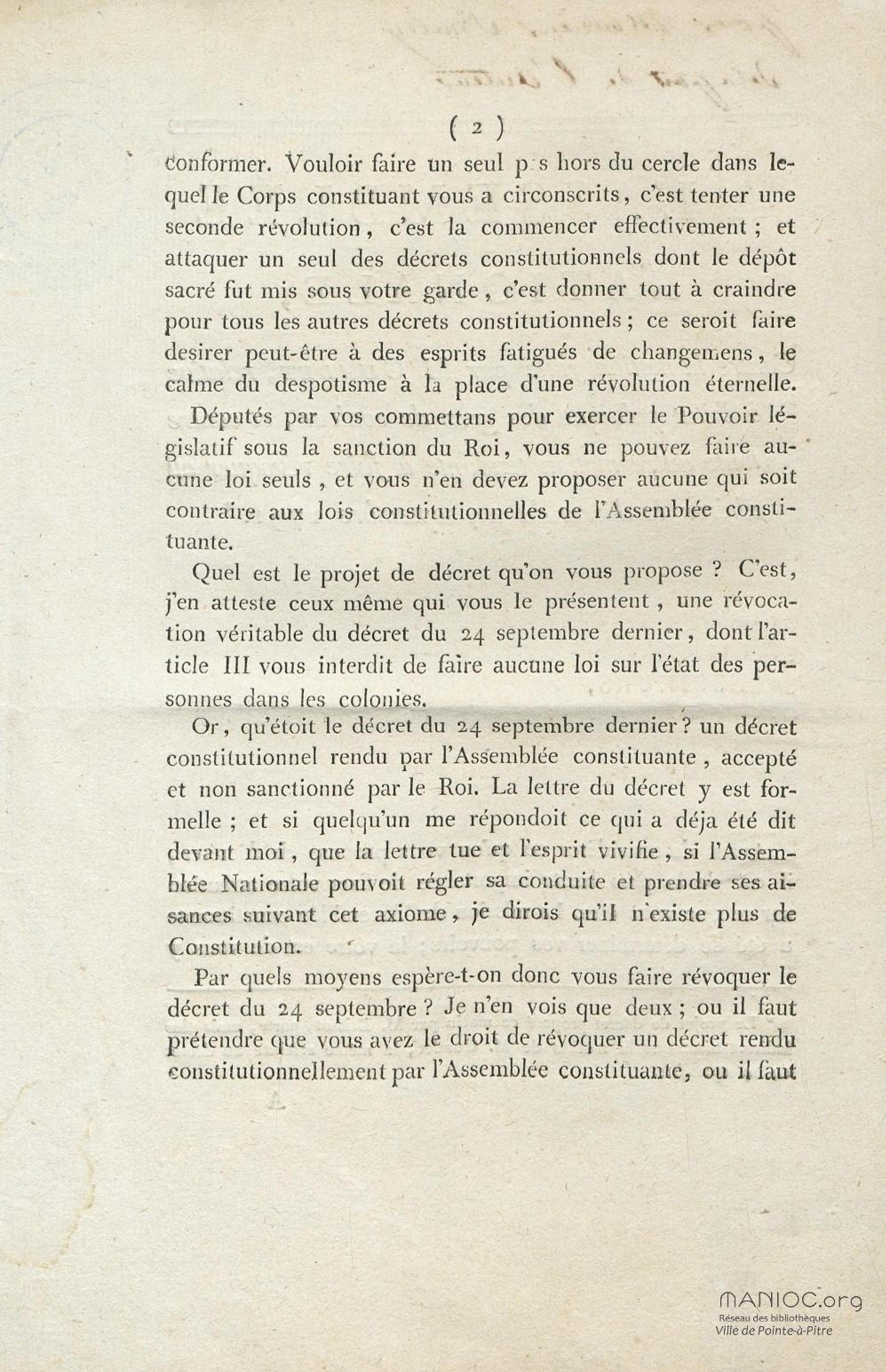 A l'Assemblée nationale, contre la motion faite par M. Guadet, relative à l'état politique des gens de couleur, et contre toute autre motion tendante à faire révoquer ou altérer le décret du 24 septembre 1791