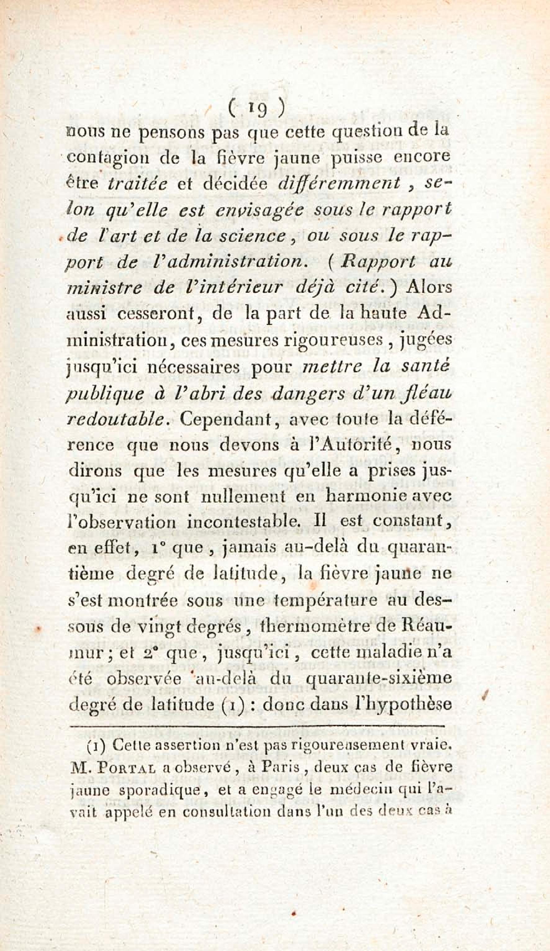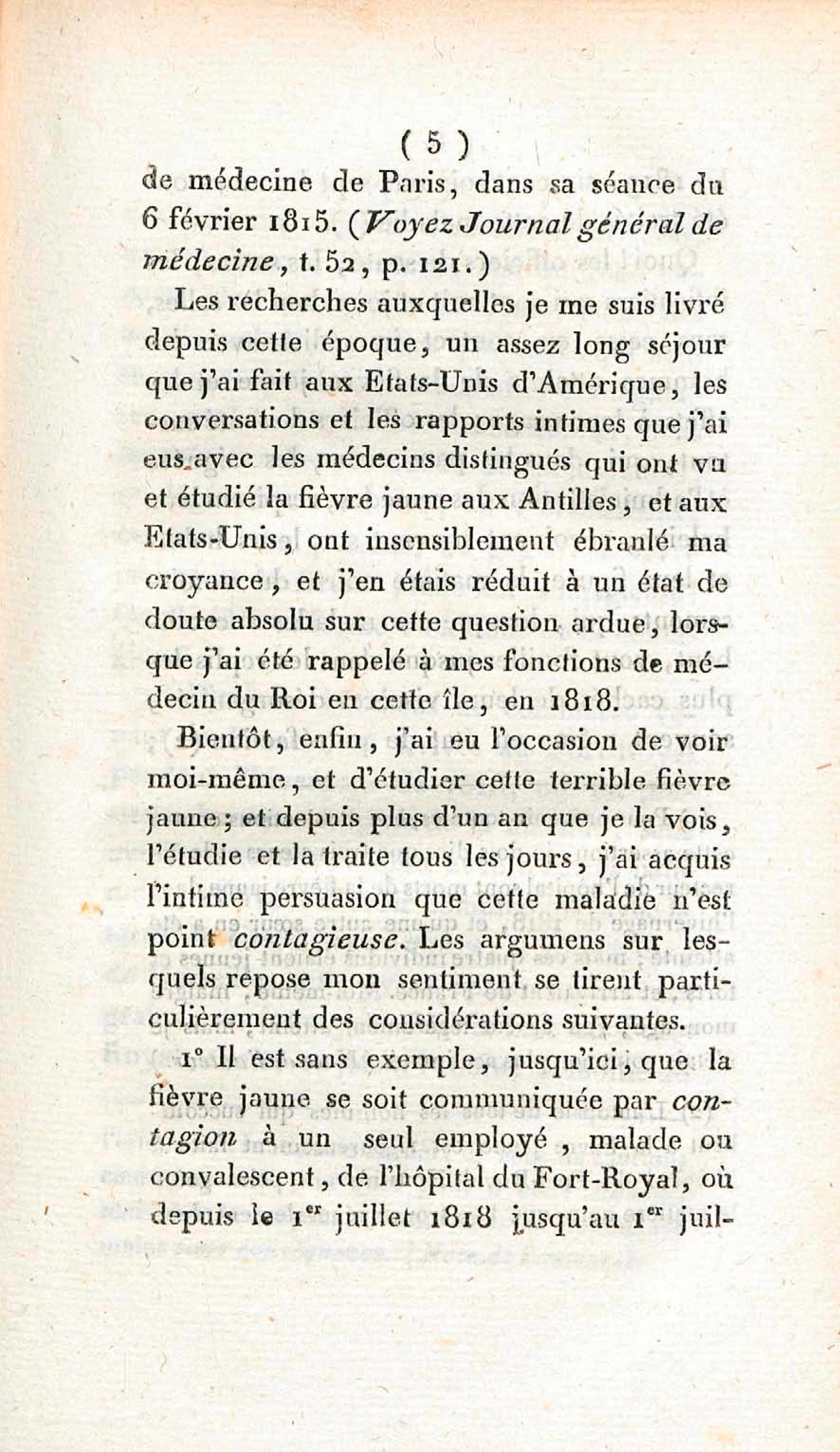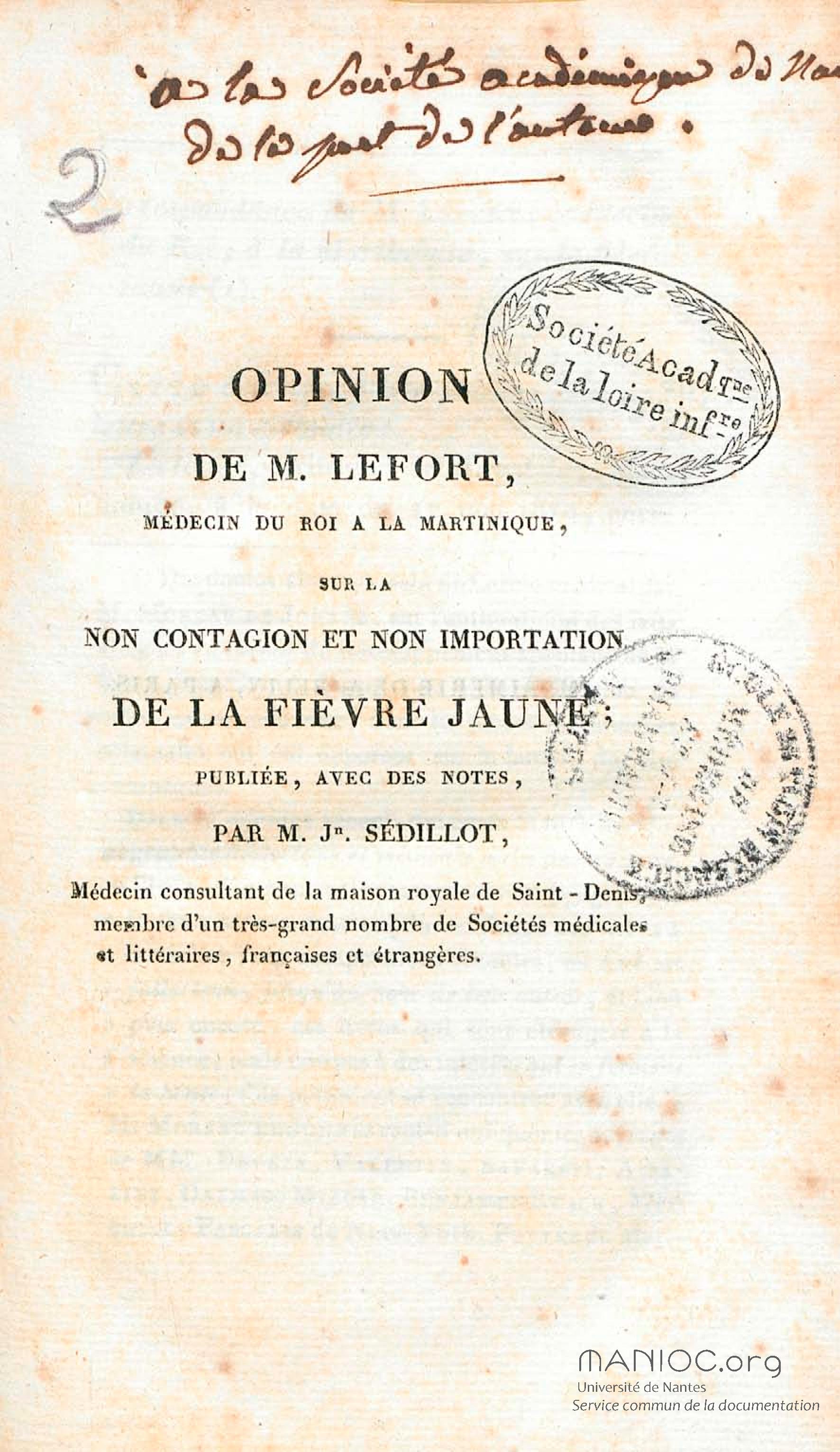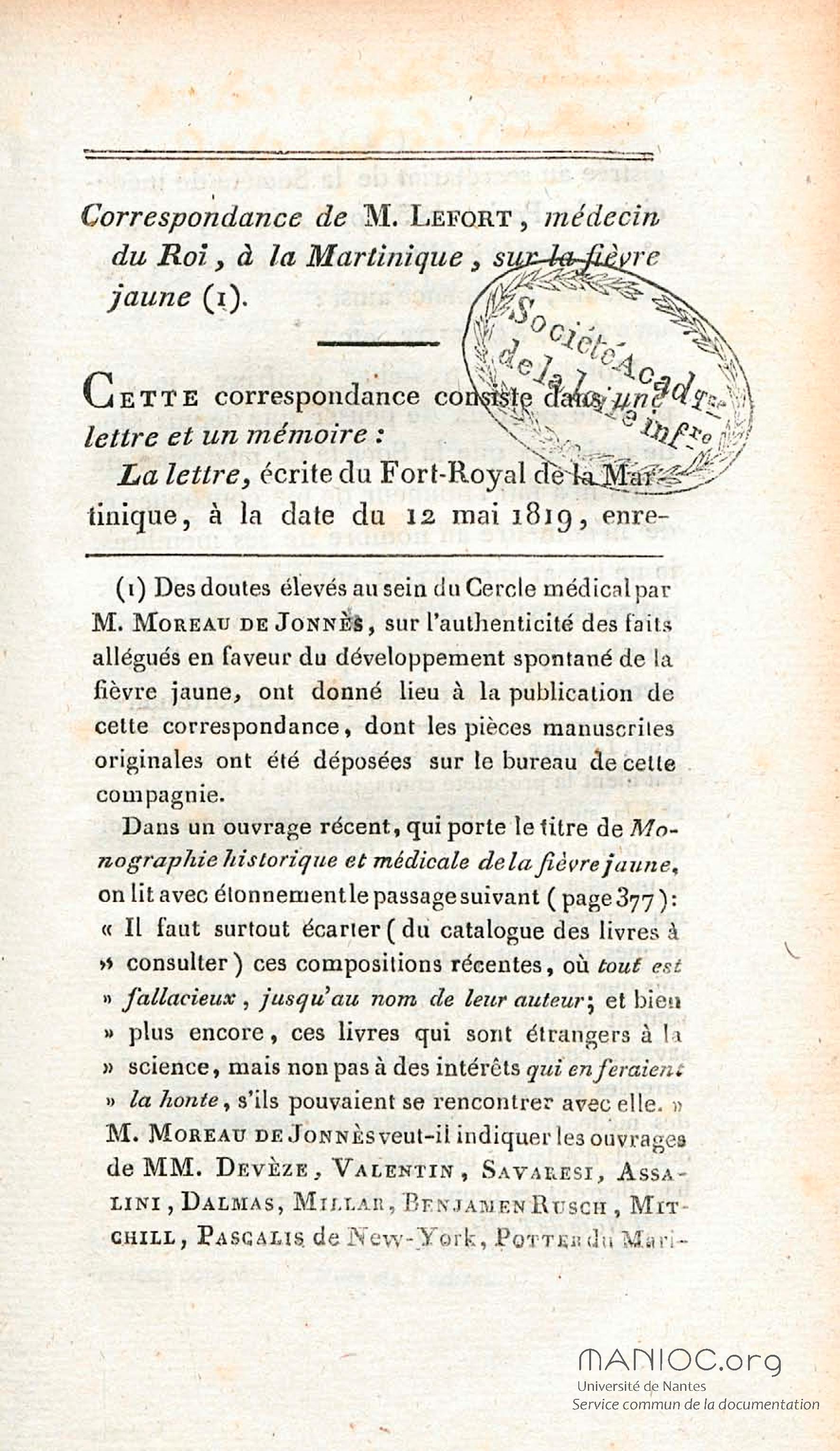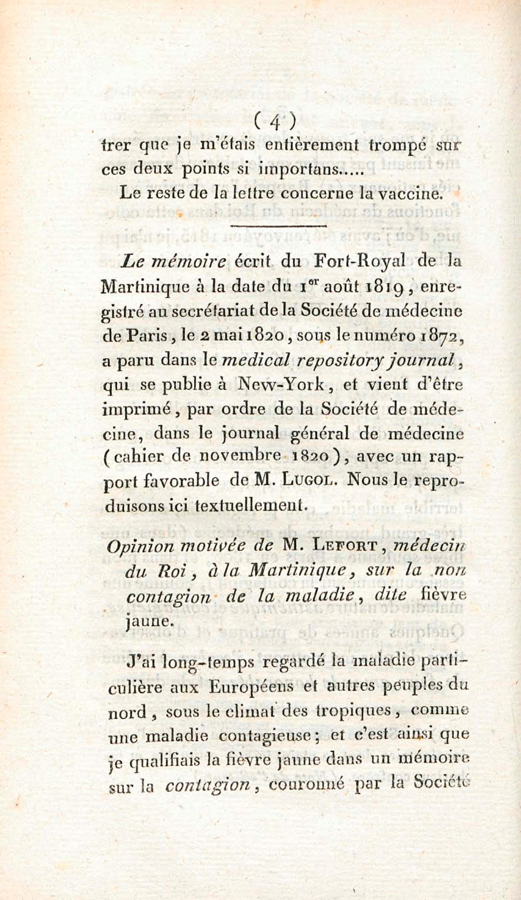 Opinion de M. Lefort, médecin du roi à la Martinique, sur la non contagion et non importation de la fièvre jaune