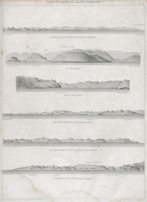 Côte depuis le port du Piment jusqu'à la baie des Gonaïves. Baie des Gonaïves. Baie de Saint-Marc. Côte depuis Saint-Marc jusqu'à la pointe des Vases. Côte depuis la pointe des Vases jusqu'à la Grande-Rivière. Côte depuis Port-au-Prince jusqu'à Léogane.