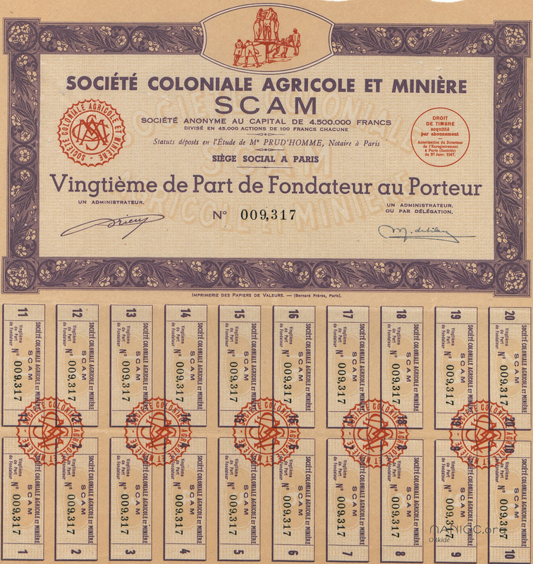 - Société coloniale agricole et minière. Vingtième de part de fondateur