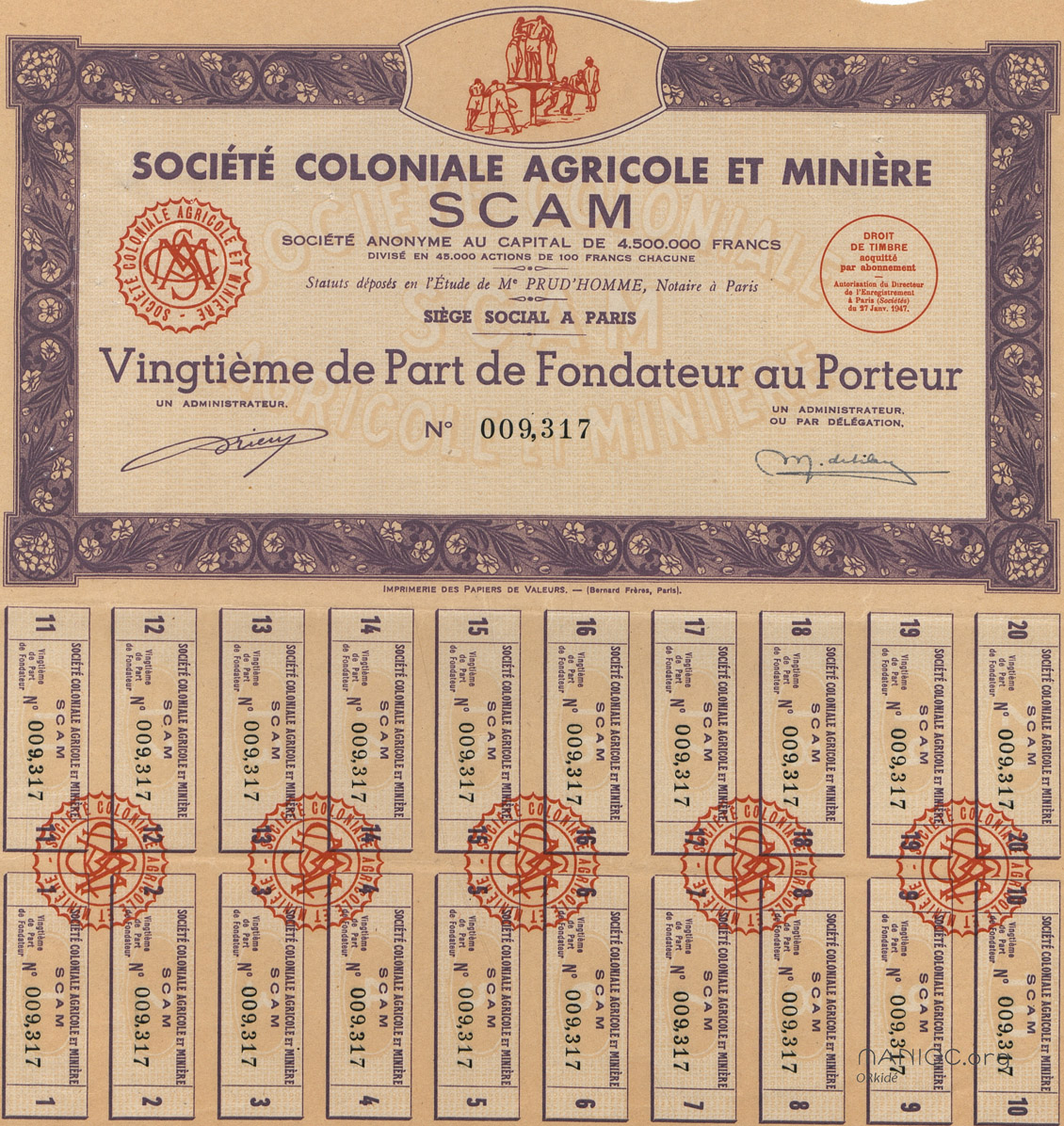 Société coloniale agricole et minière. Vingtième de part de fondateur