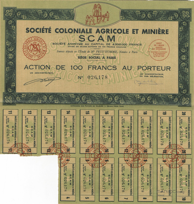 Société coloniale agricole et minière. Action de 100 francs