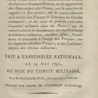 Rapport sur la Conservation et le classement des Places de Guerre et Postes militaires ; sur la suppression des États-majors des Places ; sur la manière de suppléer à leur service ; sur le commandement et le service des Troupes de lignes avec les Gardes nationales, et sur ceux du pouvoir civil avec l'autorité militaire dans les Places ; sur la conservation et la manutention des établissemens et bâtimens militaires, meubles, effets, fournitures et ustensiles à l'usage des Troupes ; sur les logemens desdites Troupes ; et sur l'administration des travaux militaires : fait à l'Assemblée nationale, le 24 mai 1791, au nom du Comité militaire, par M. Bureaux-Pusy, membre de ce comité. Imprimé par ordre de l'Assemblée nationale