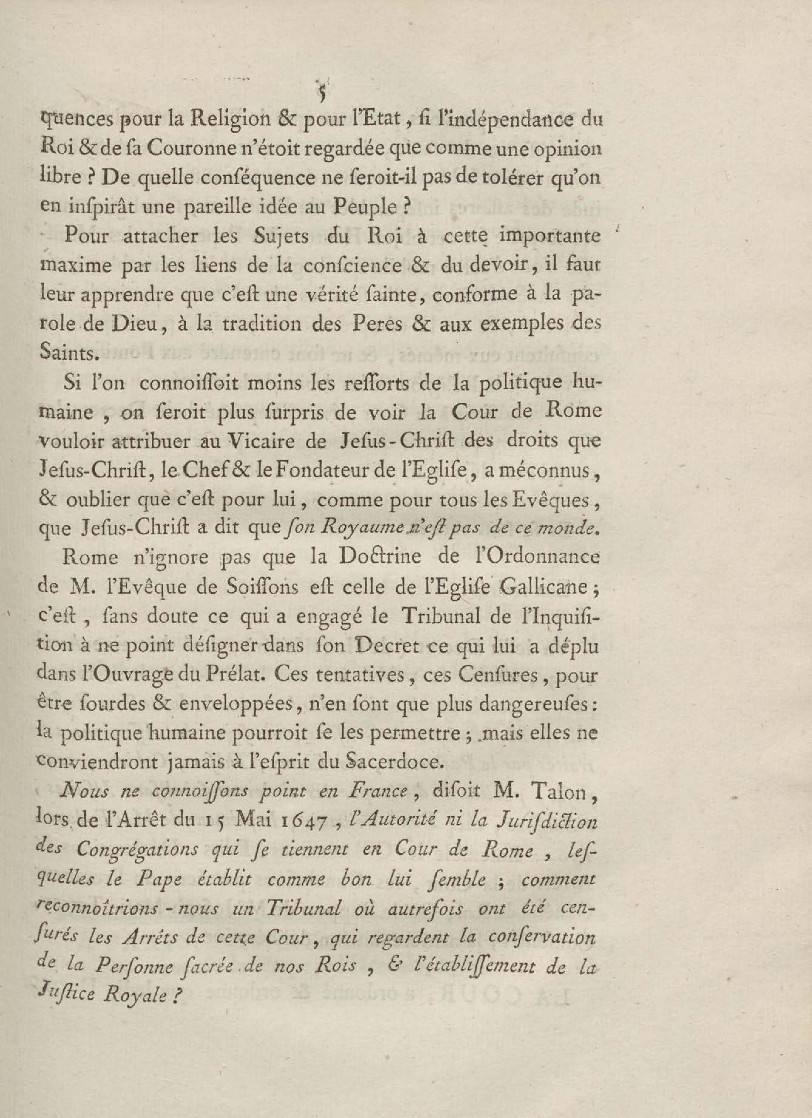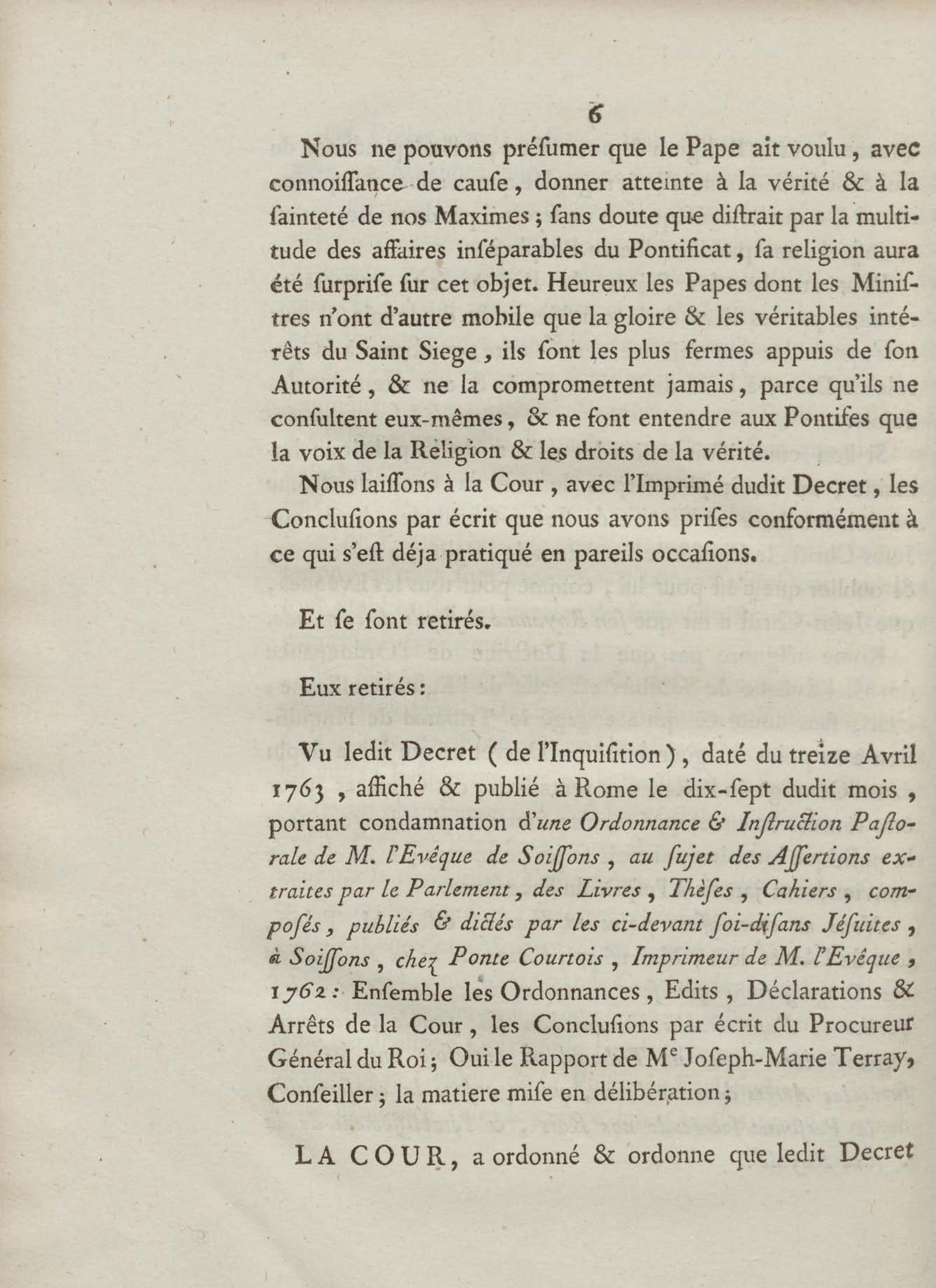 Arrest de la cour du parlement, qui ordonne la Suppression d'un Décret de l'Inquisition de Rome du 13 Avril 1763, portant condamnation d'une Ordonnance & Instruction Pastorale de M. l'Evêque de Soissons