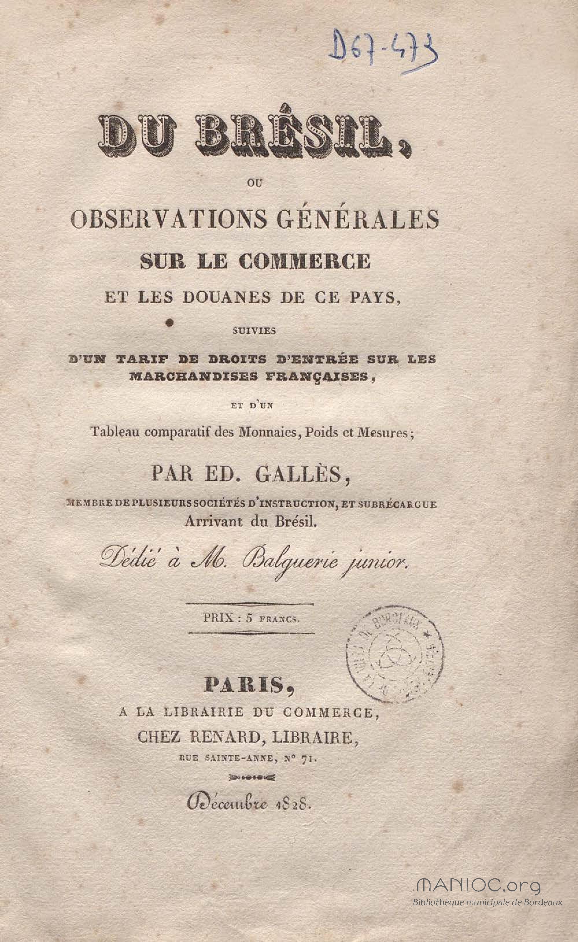 - Du Brésil, ou Observations générales sur le commerce et les douanes de ce pays