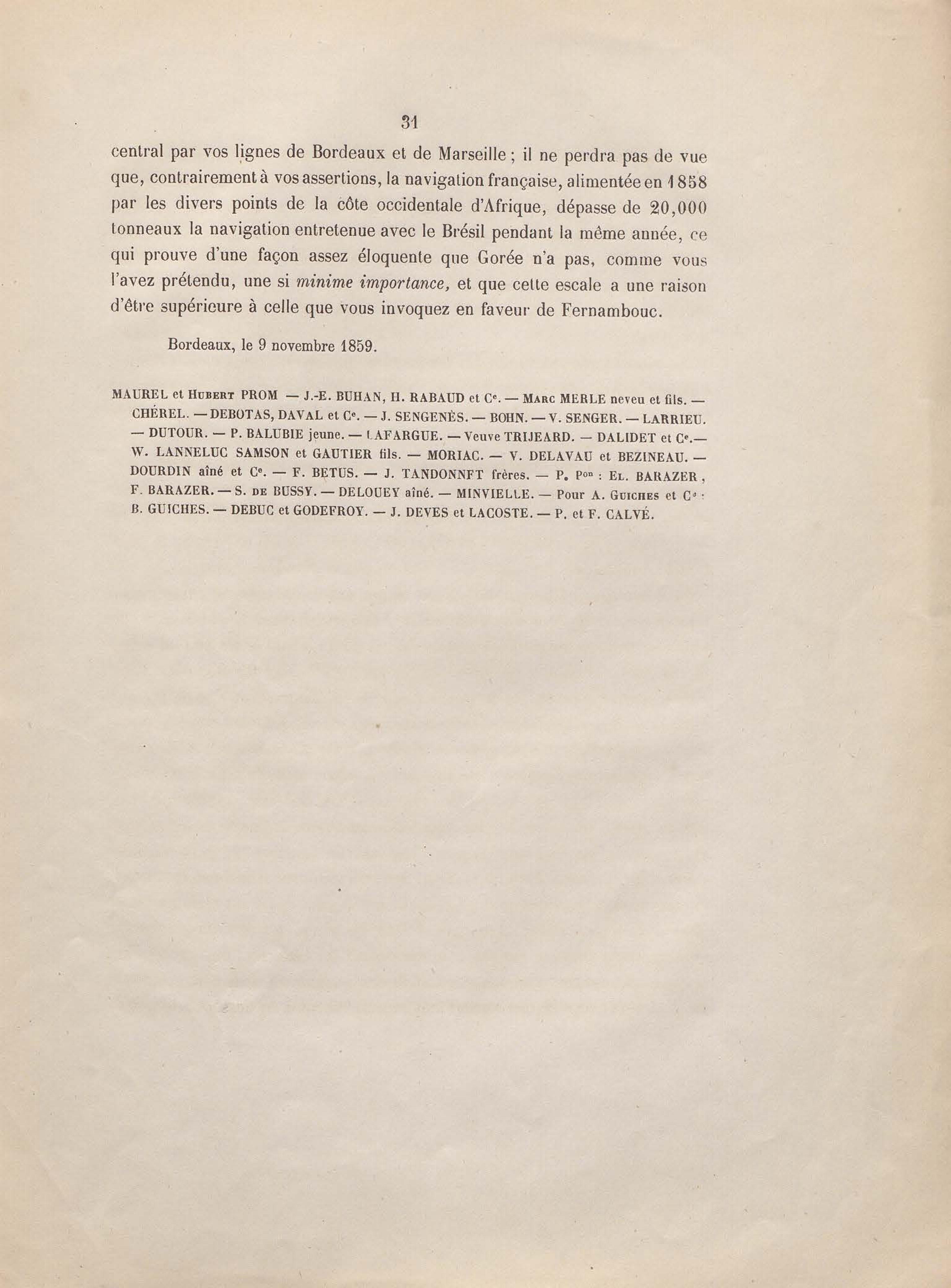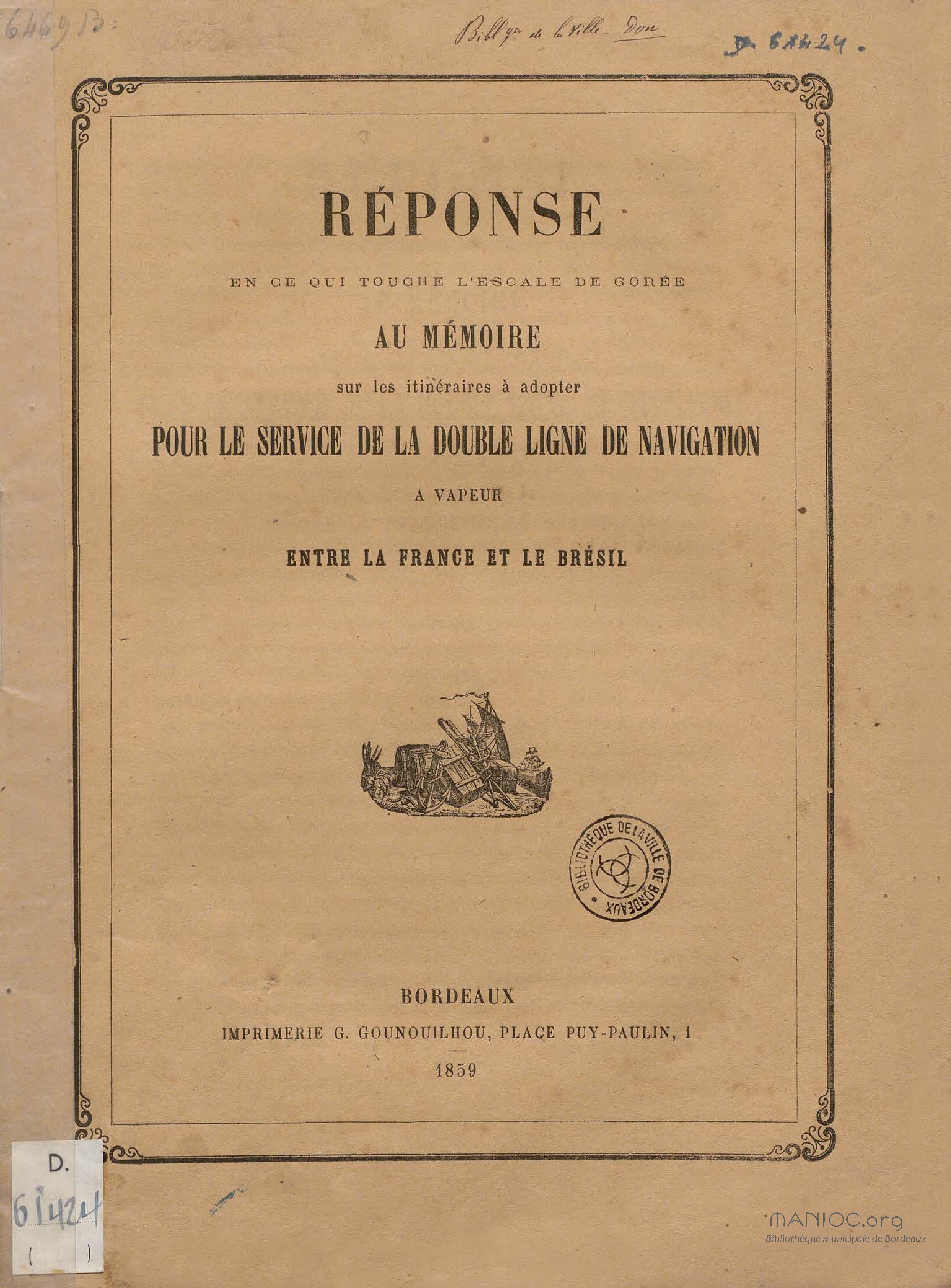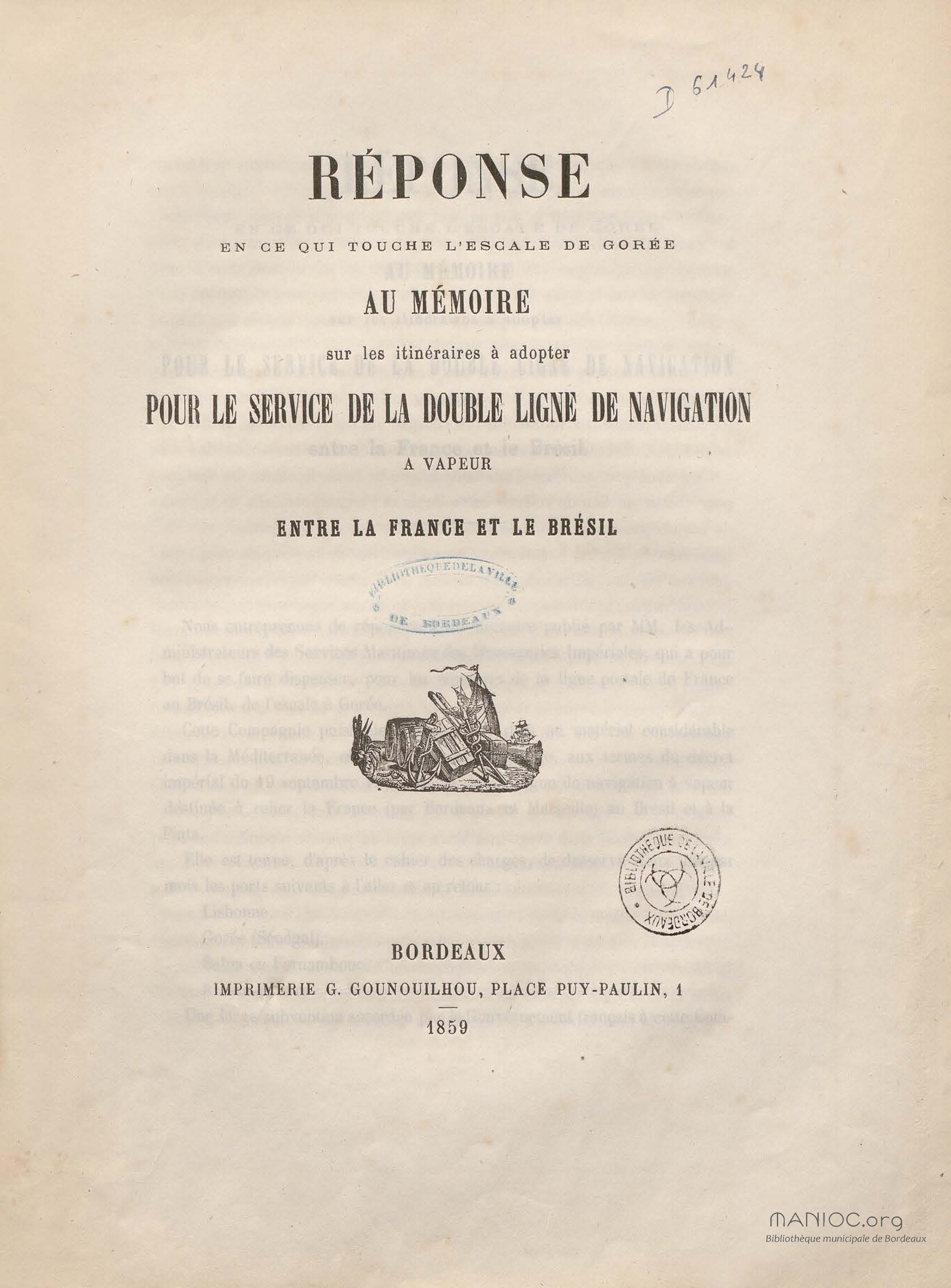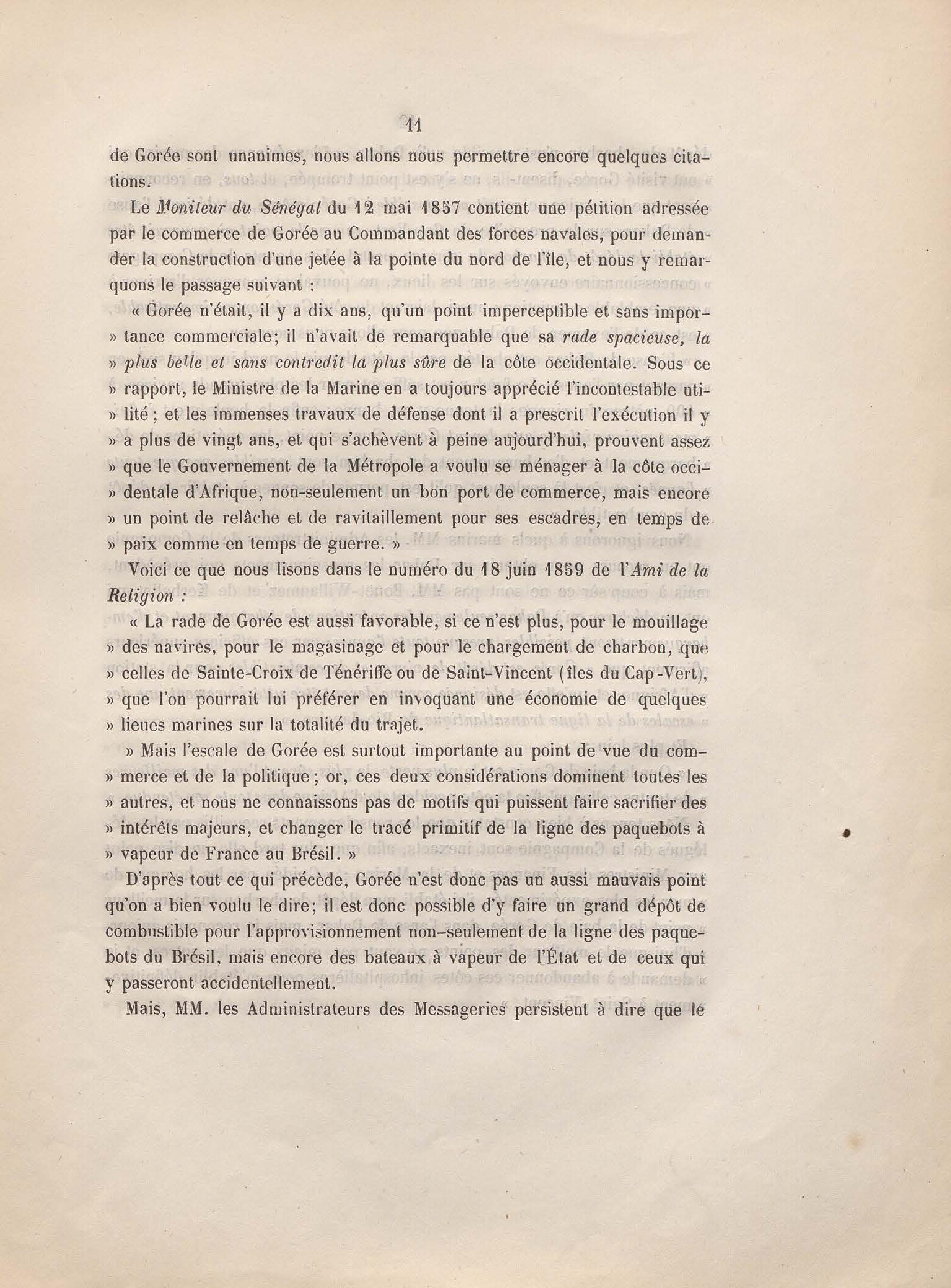 - Réponse en ce qui touche l'escale de Gorée au mémoire sur les itinéraires à adopter pour le service de la double ligne de navigation à vapeur entre la France et le Brésil