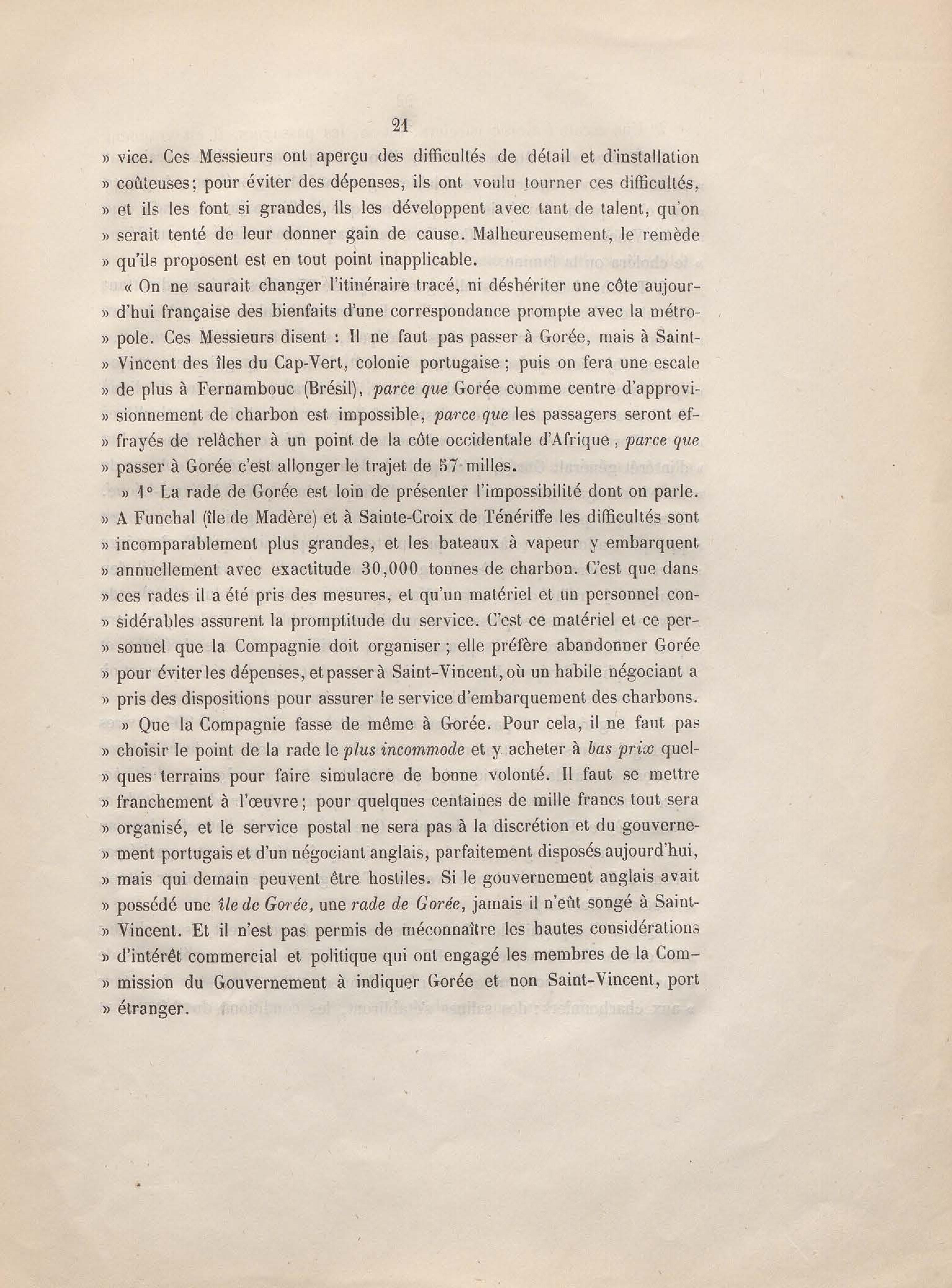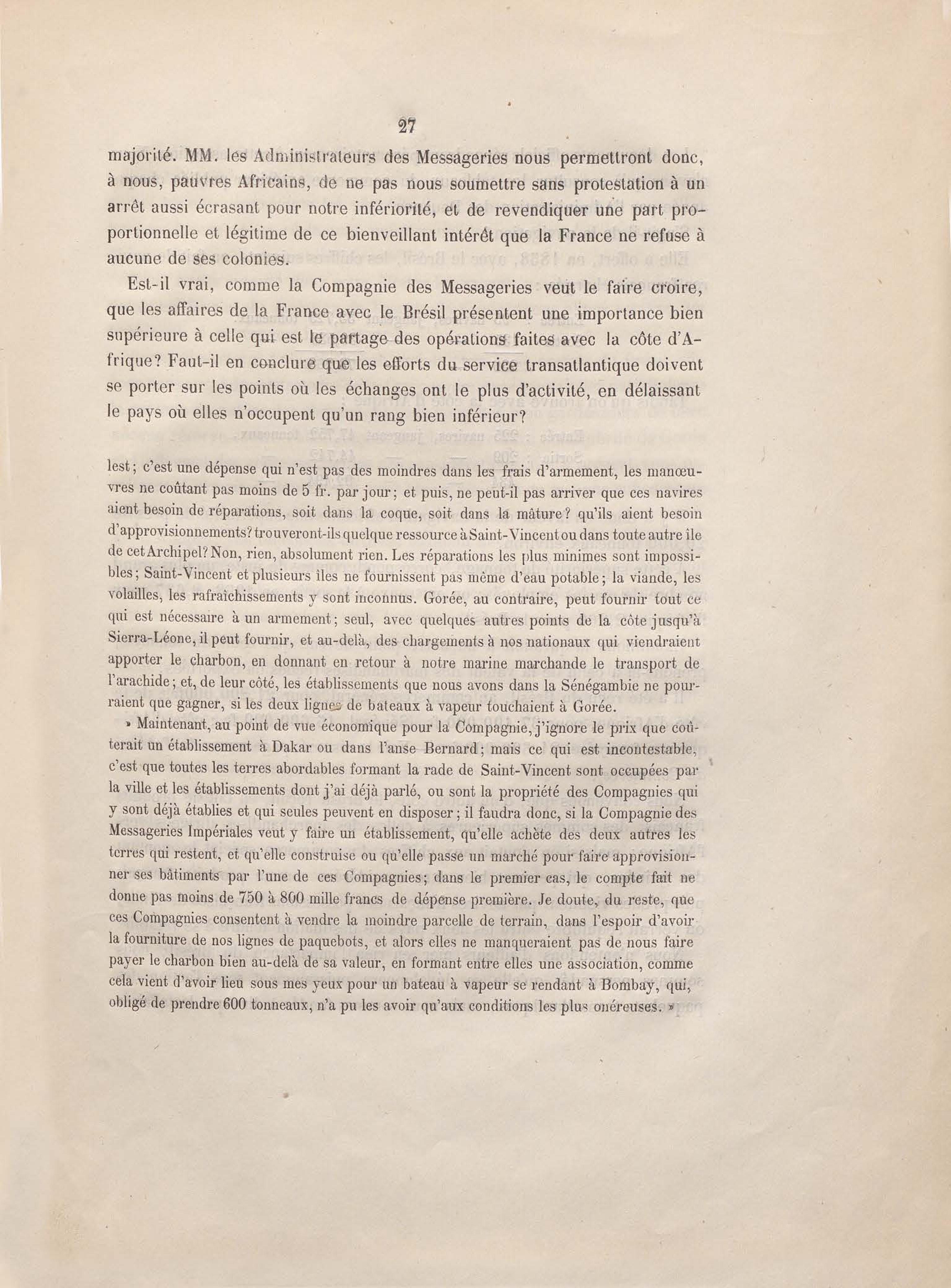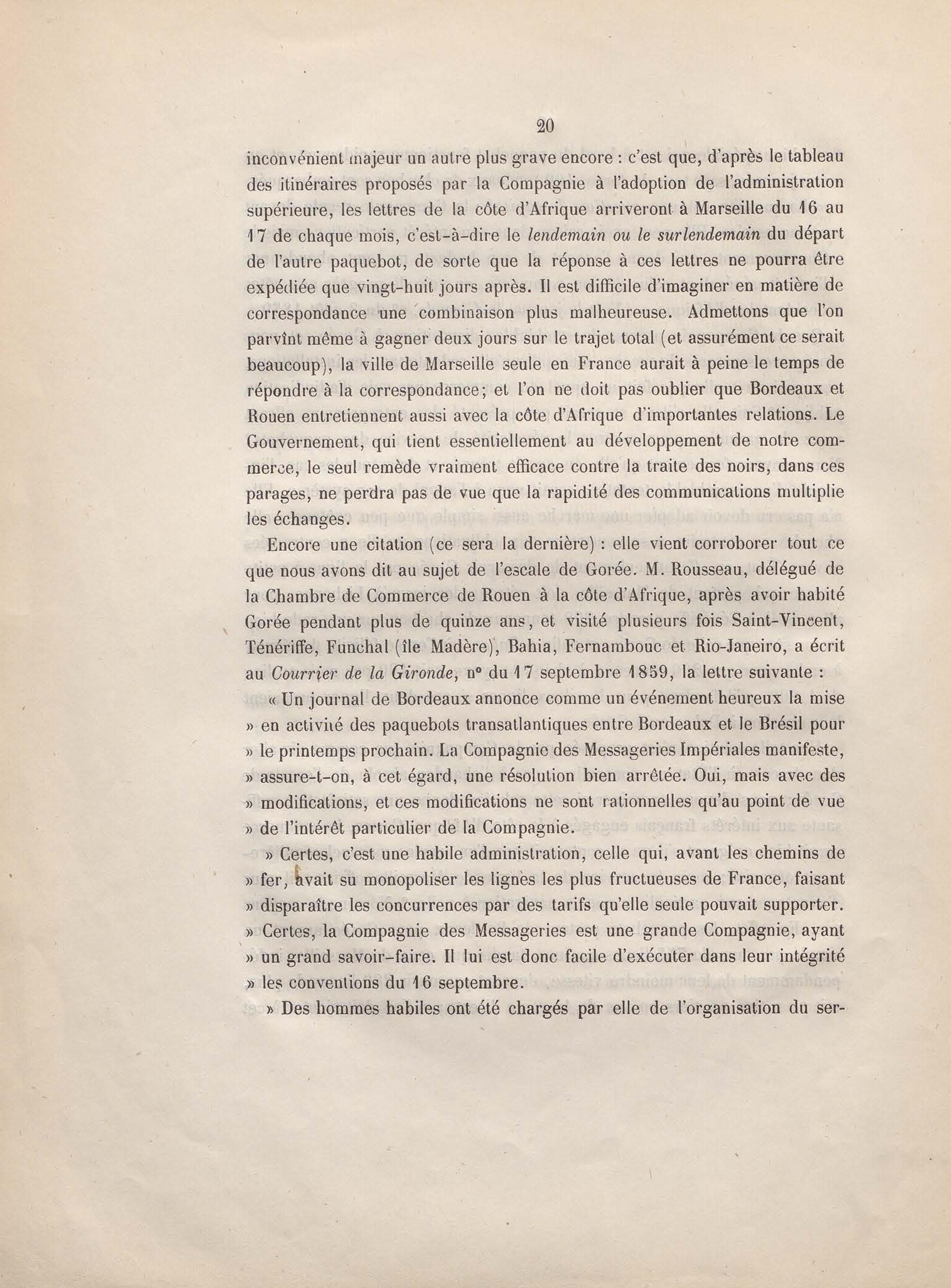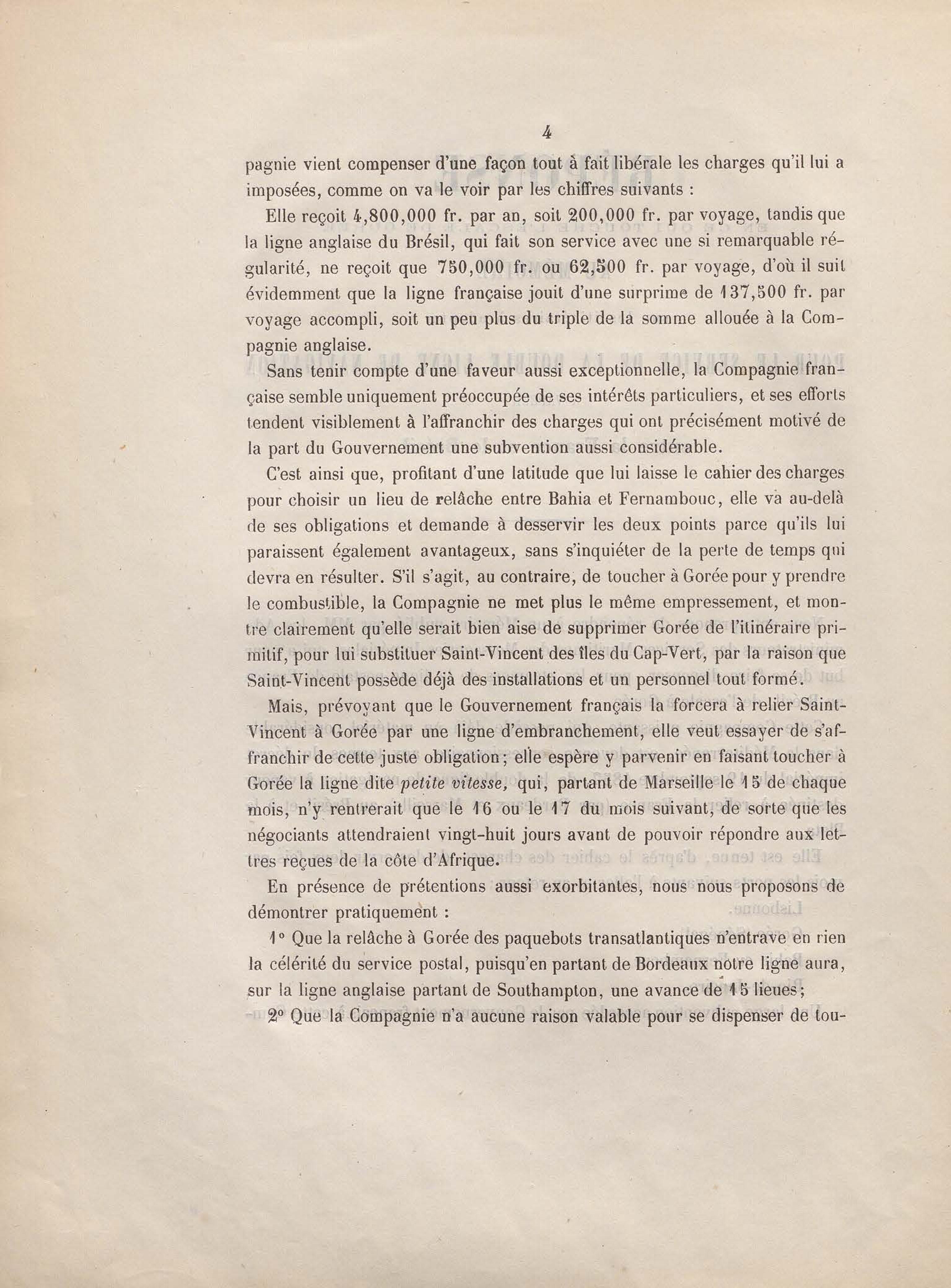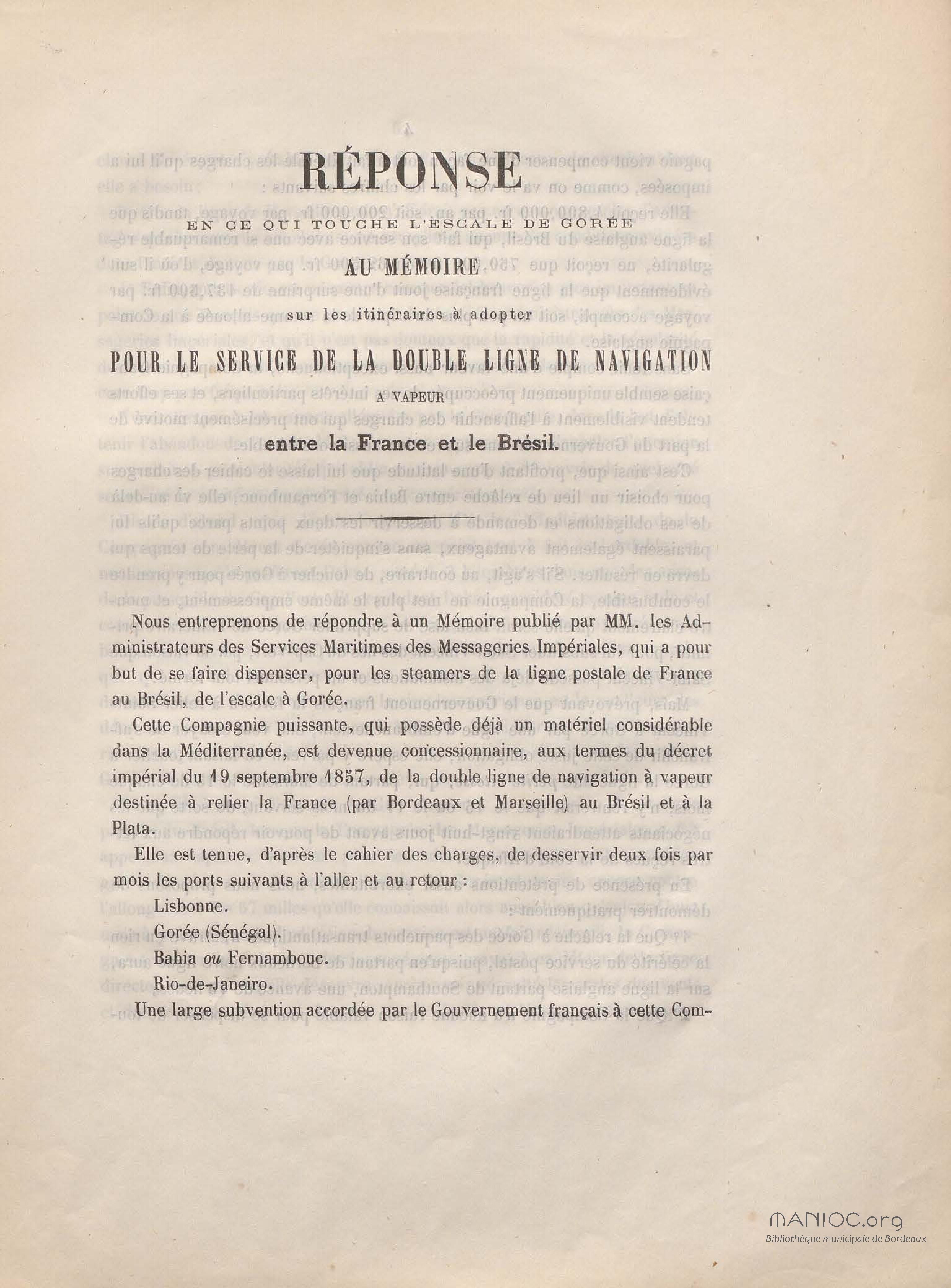 Réponse en ce qui touche l'escale de Gorée au mémoire sur les itinéraires à adopter pour le service de la double ligne de navigation à vapeur entre la France et le Brésil