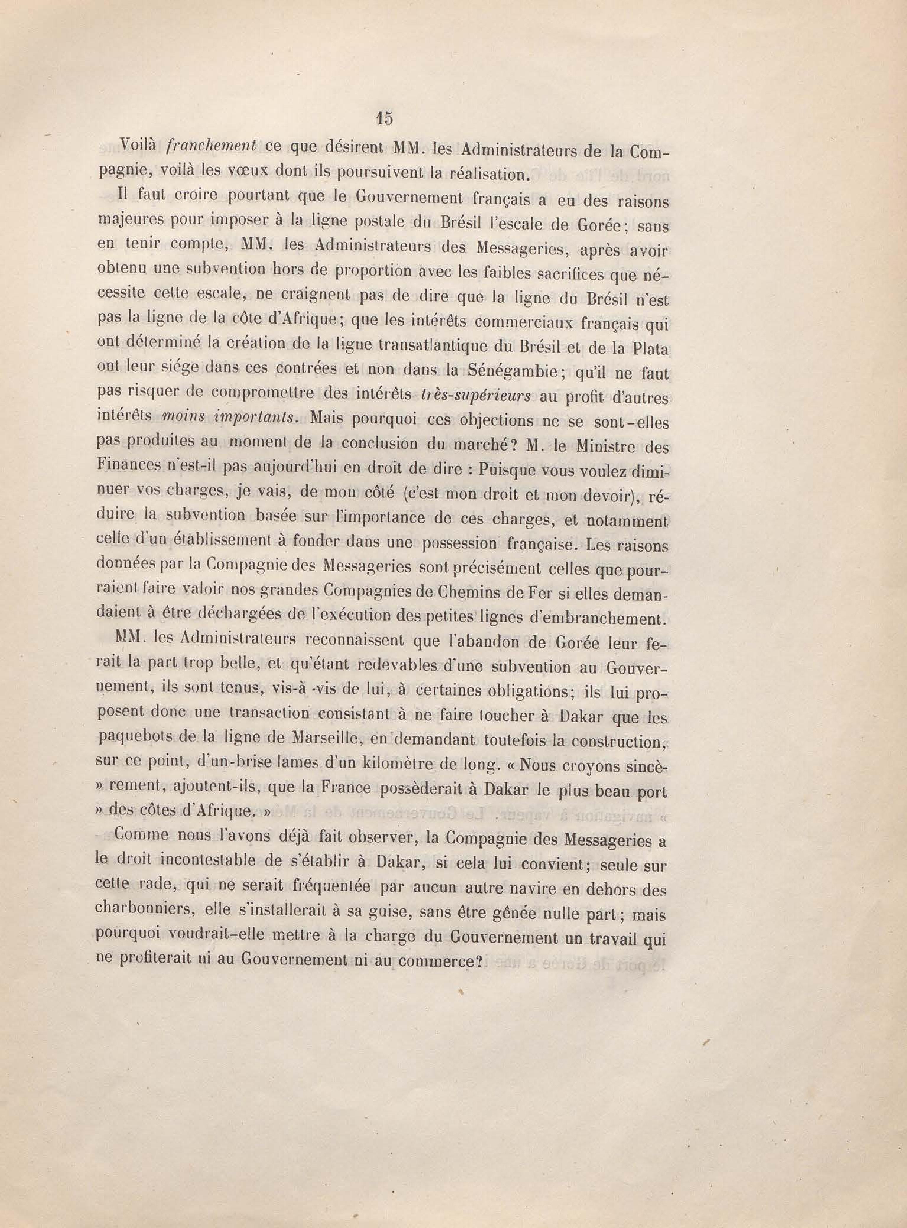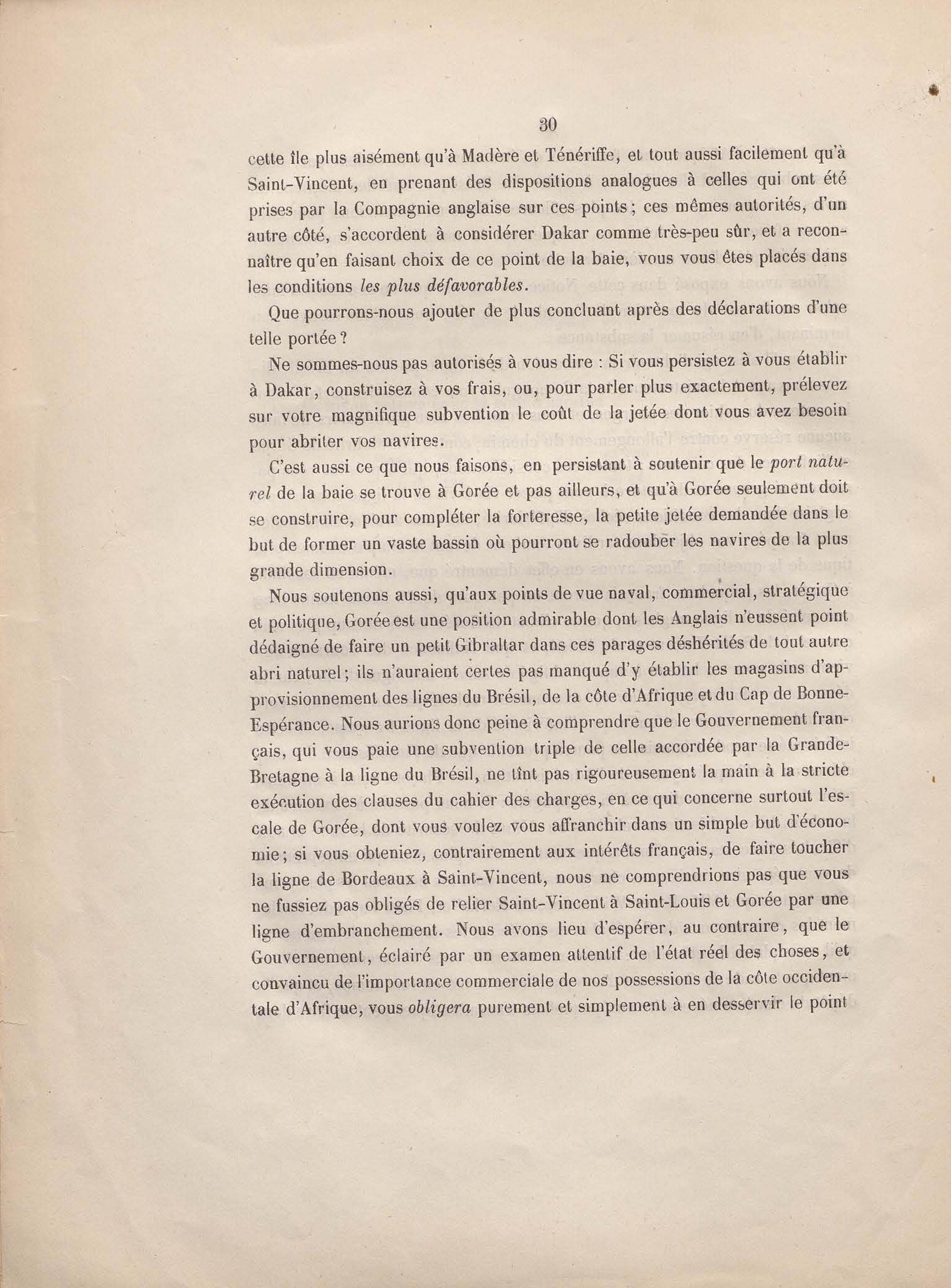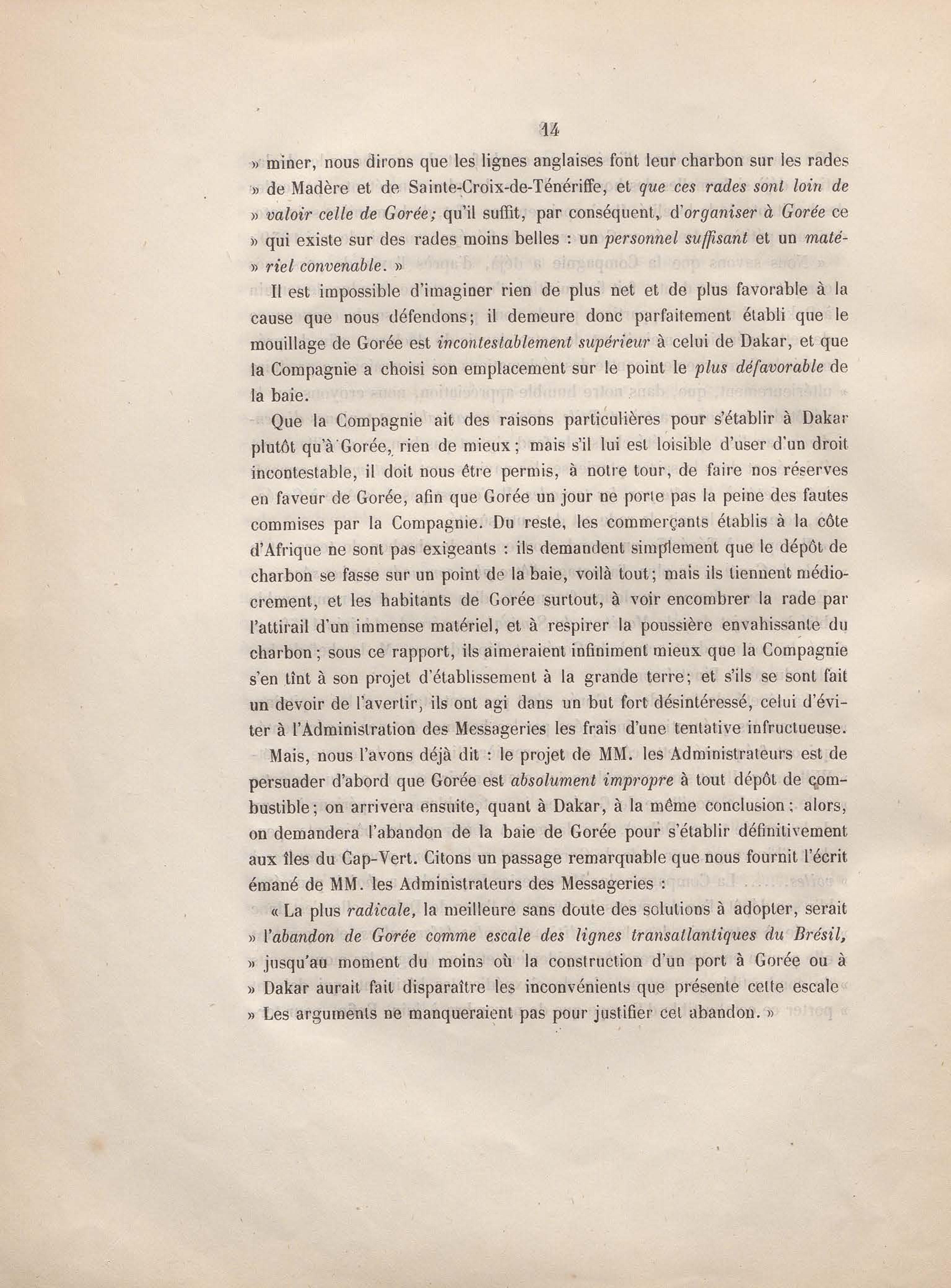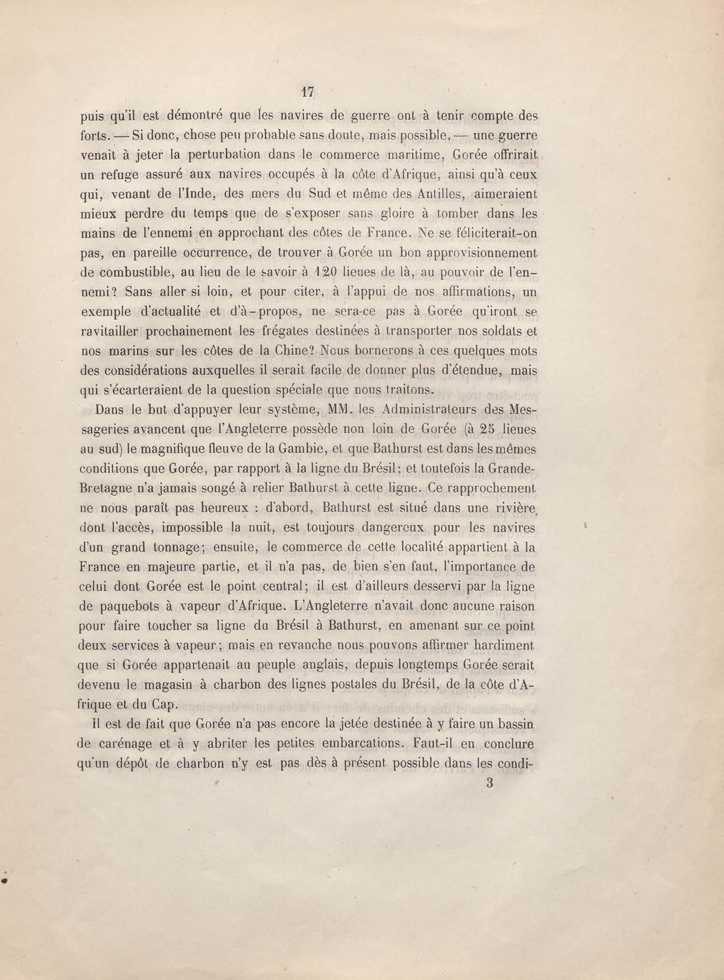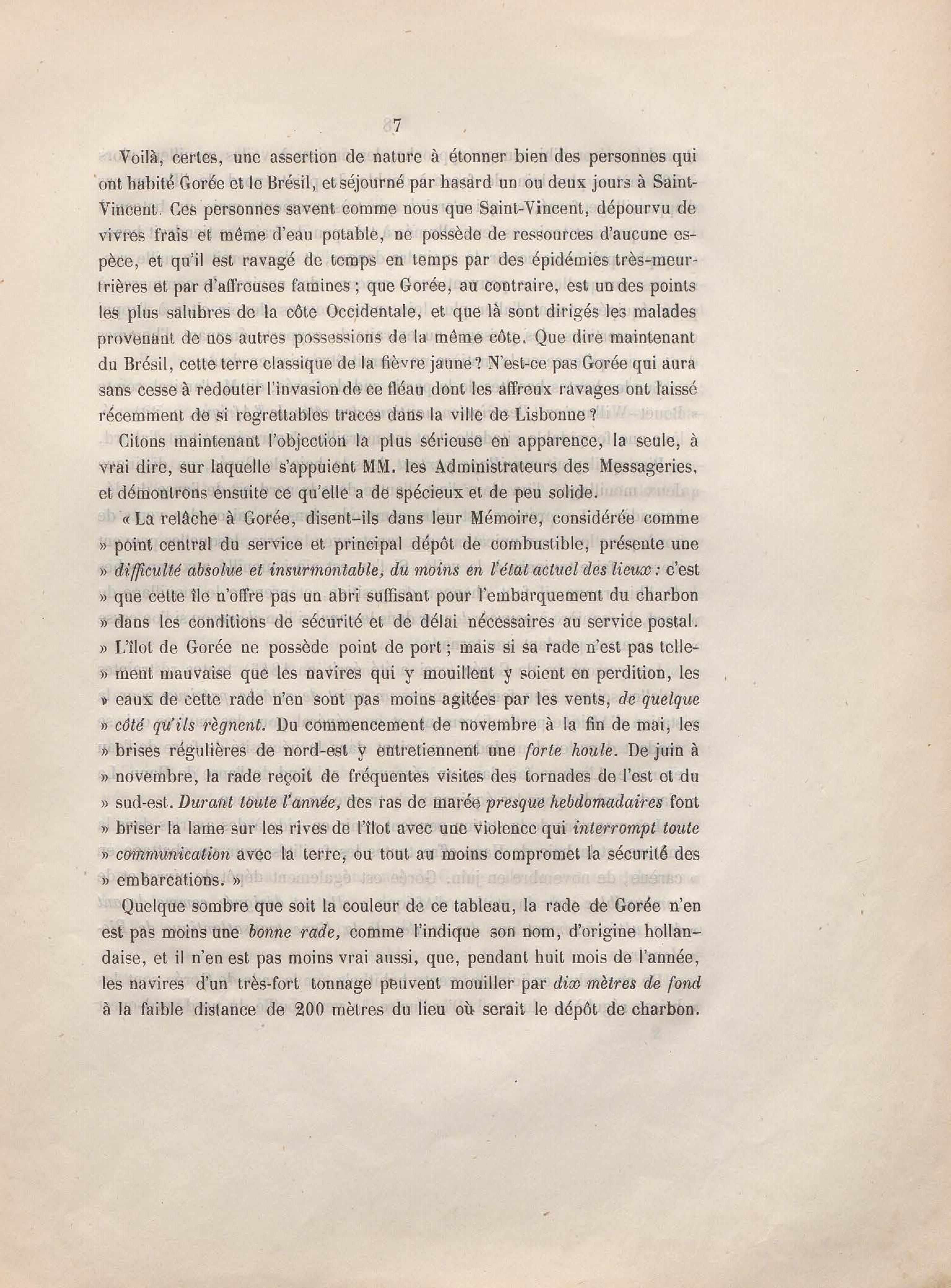 Réponse en ce qui touche l'escale de Gorée au mémoire sur les itinéraires à adopter pour le service de la double ligne de navigation à vapeur entre la France et le Brésil