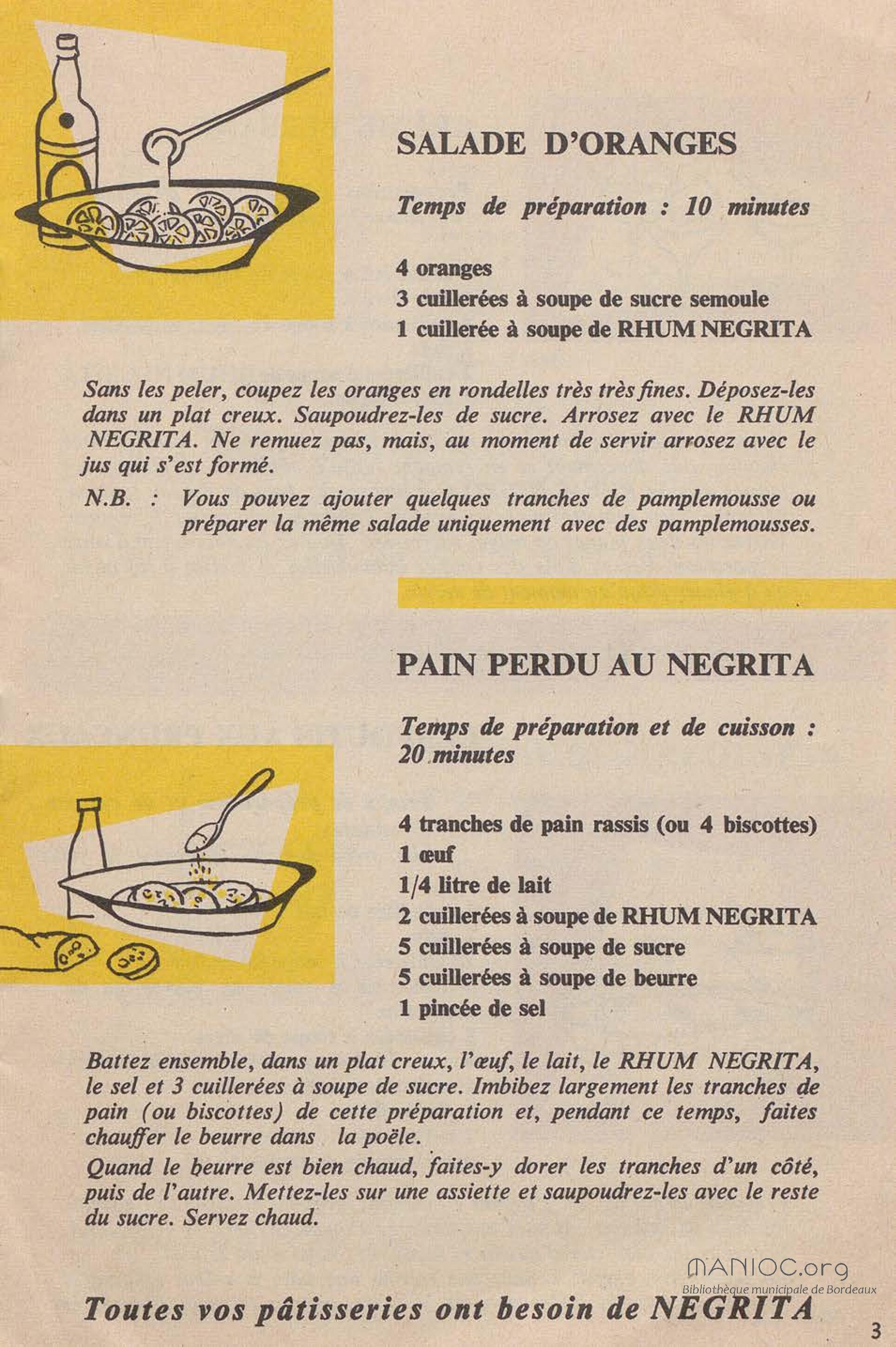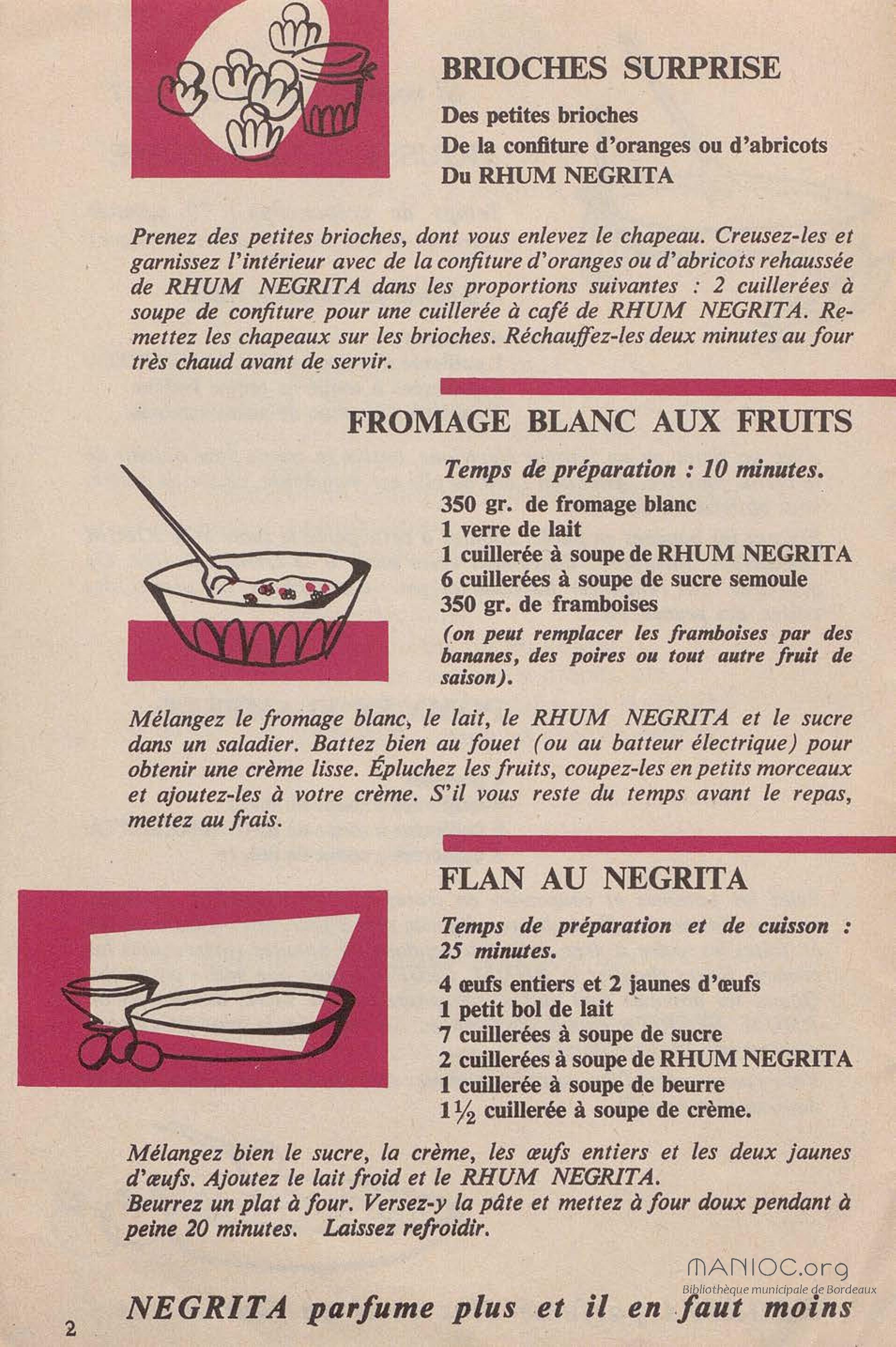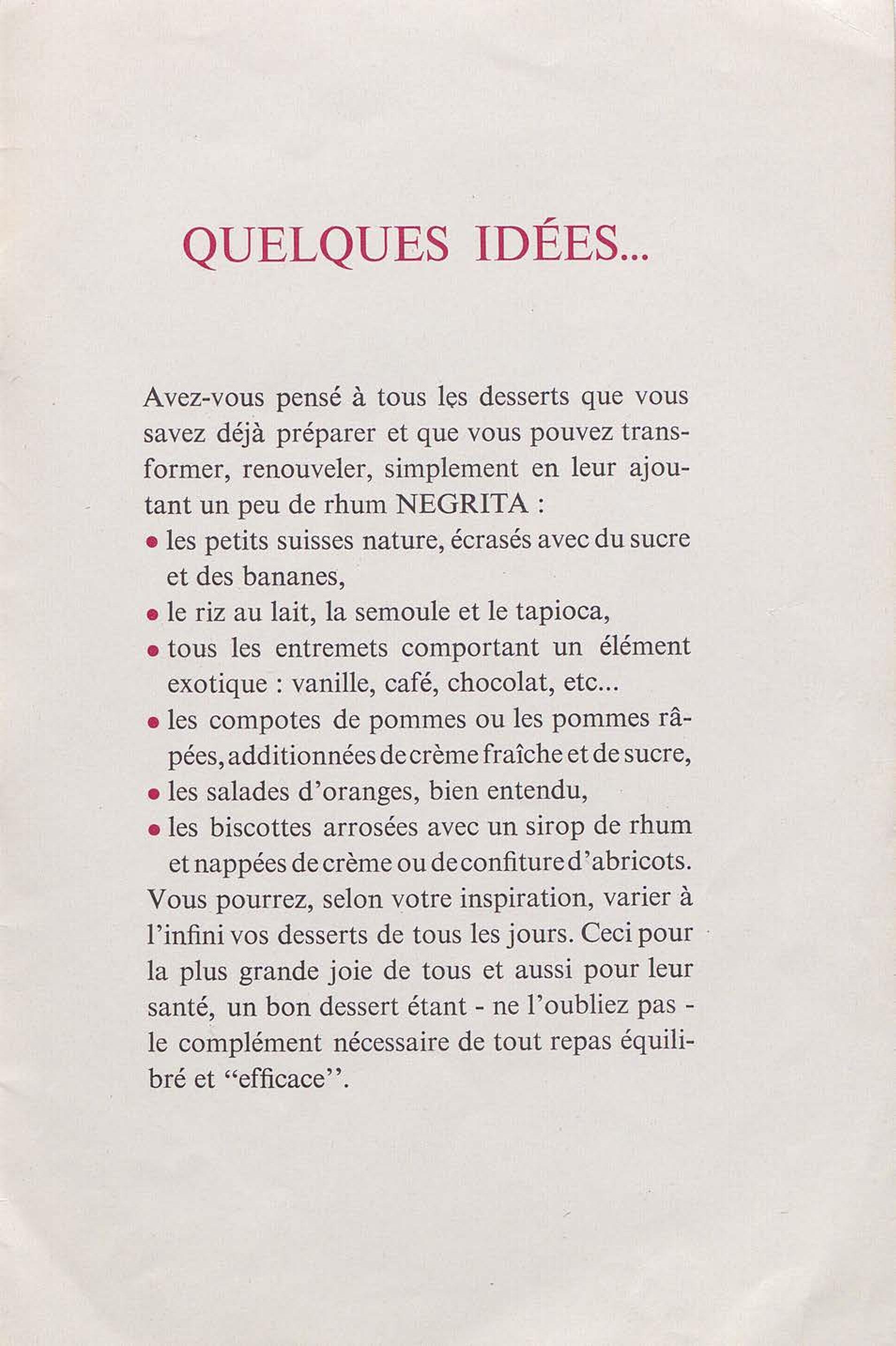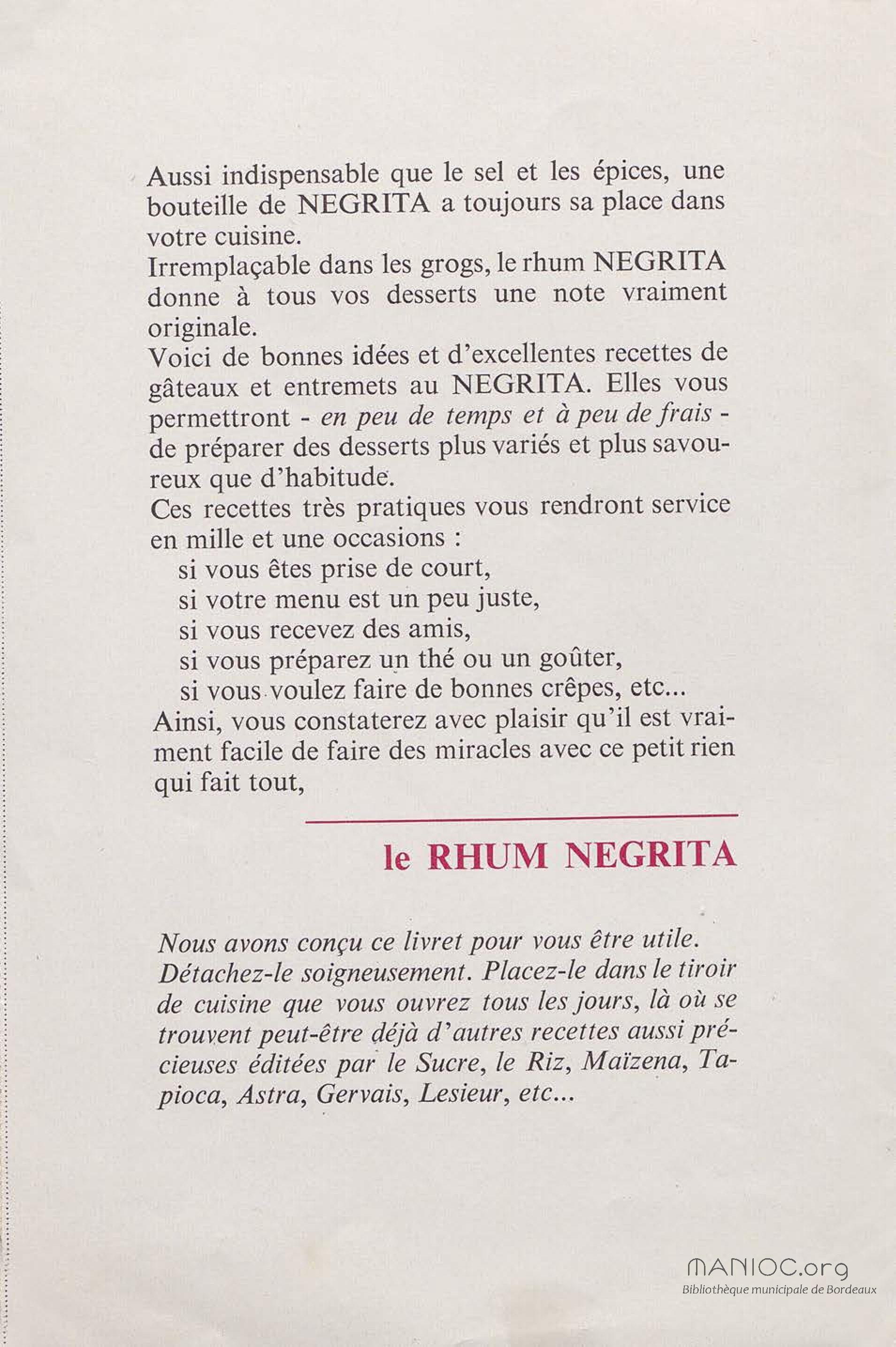 Contient des recettes de desserts à base du Rhum Negrita. La société a été créée à Limoges en 1886, puis s'est installée à Bordeaux en 1895 pour finalement s'implanter à Blanquefort depuis 1974.