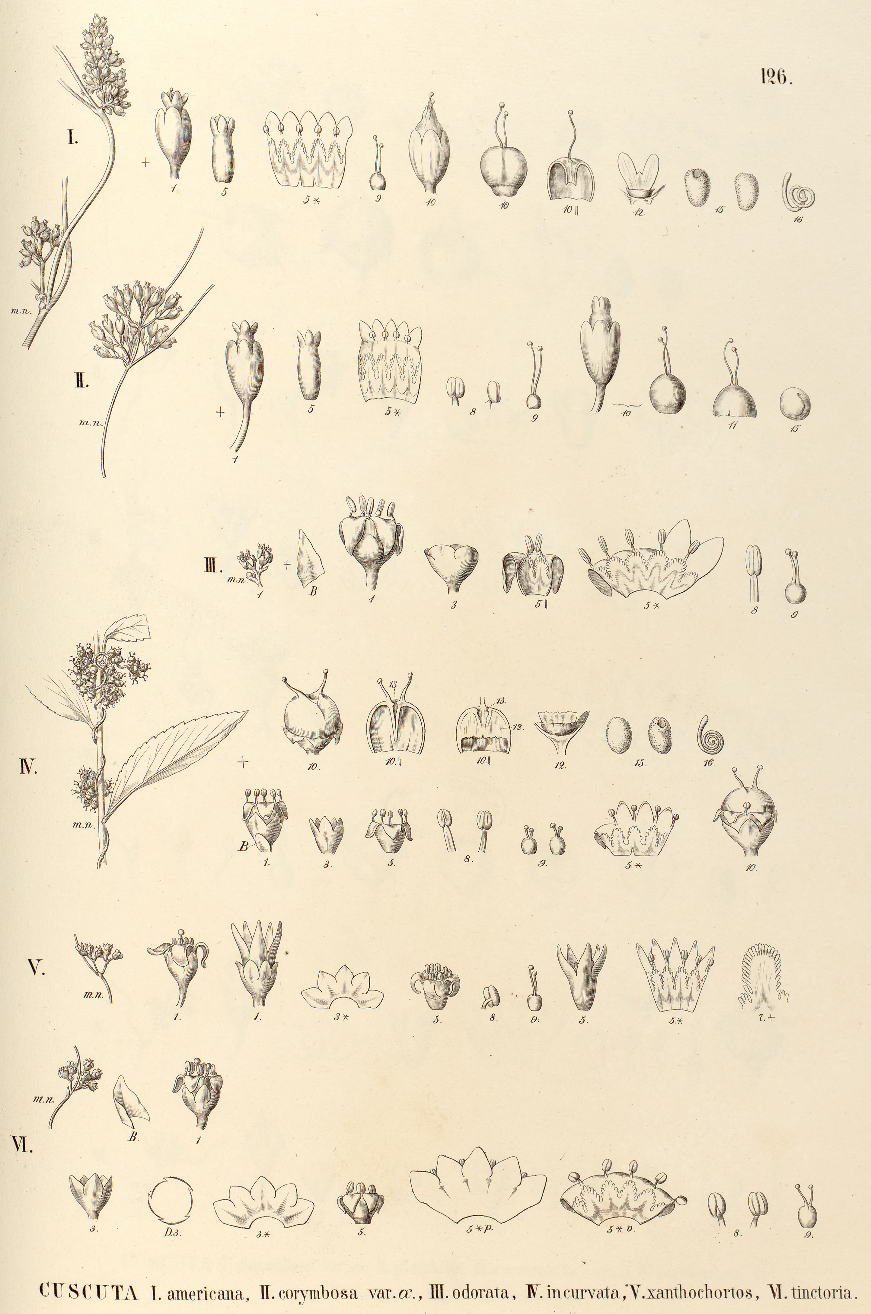 126. CUSCUTA I. americana, II. corymbosa var. ?, III. odorata, IV. incurvata, V. xanthochortos, VI. tinctoria.