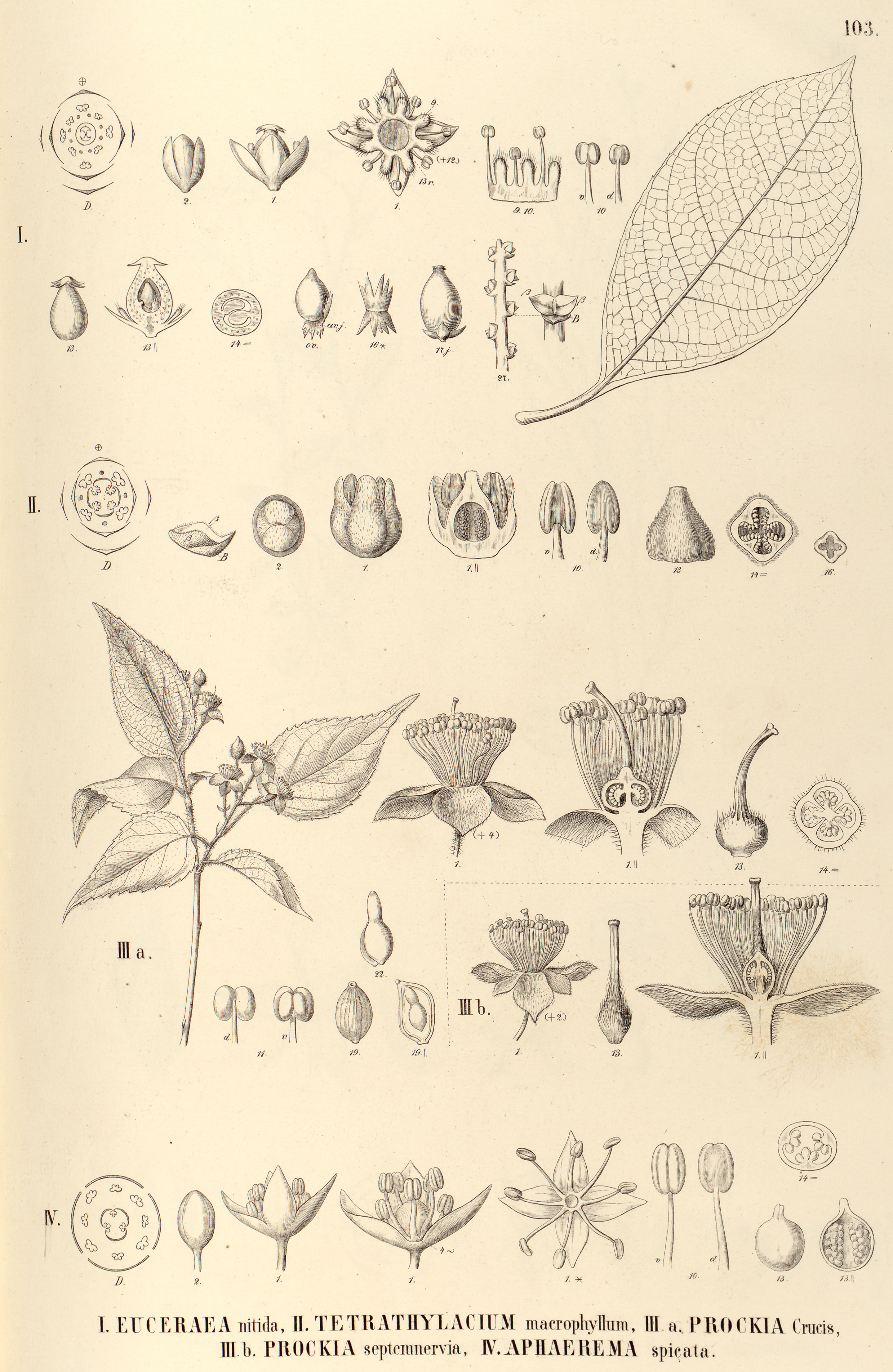 103. I. EUCERAEA nitida, II. TETRATHYLACIUM macrophyllum, III a. PROCKIA Crucis, III. b. PROCKIA septemnervia, IV. APHAEREMA spicata.