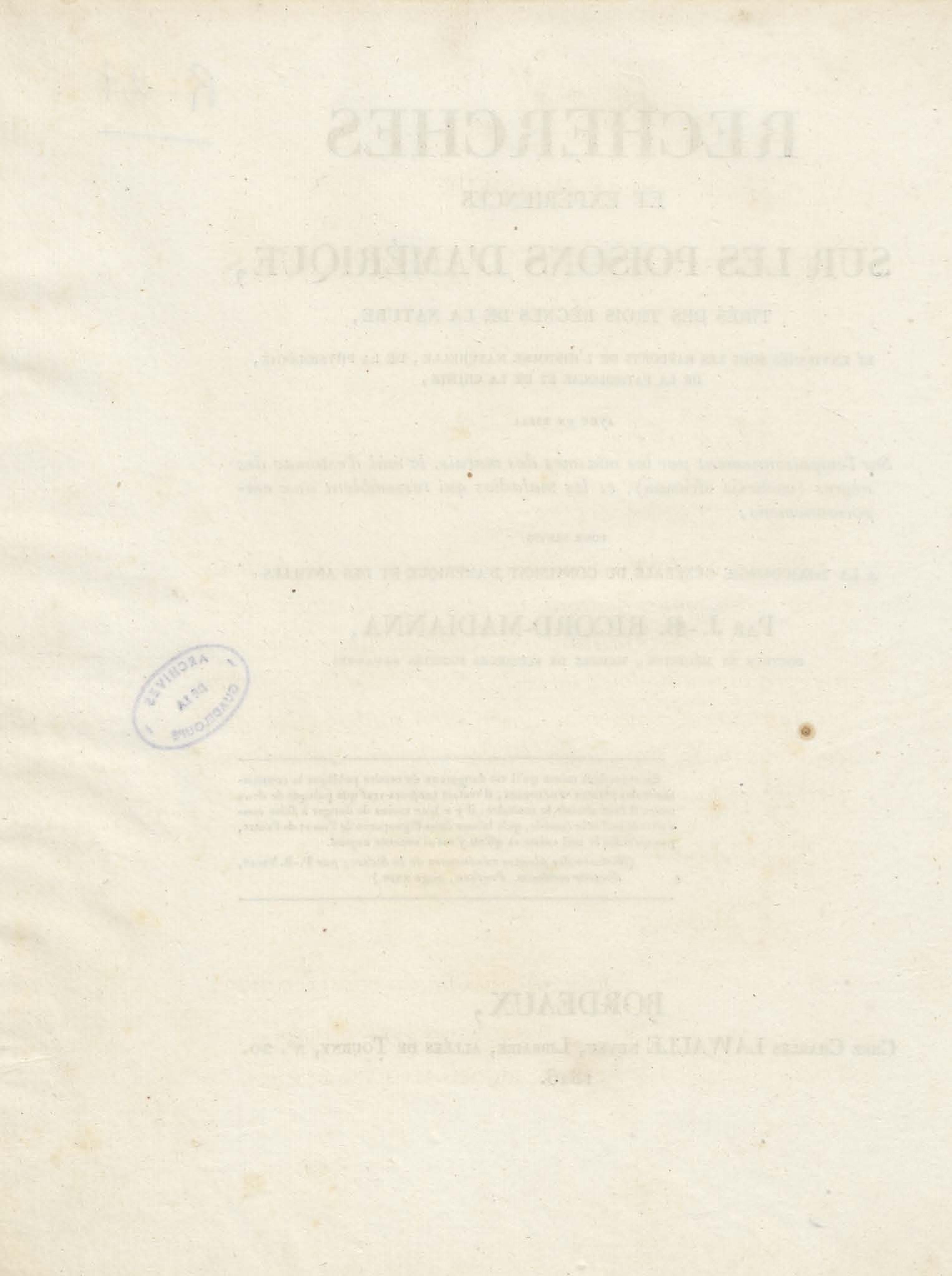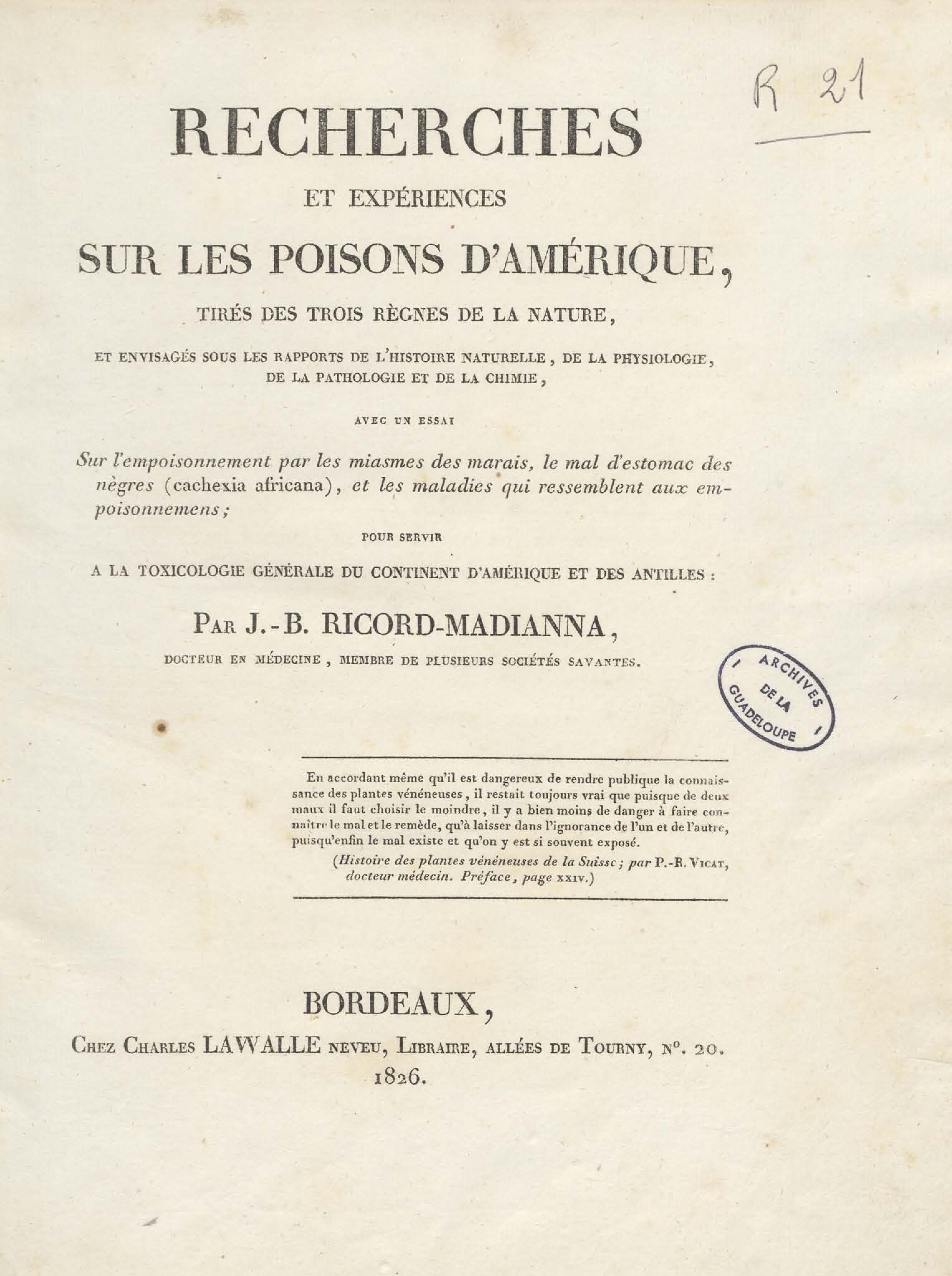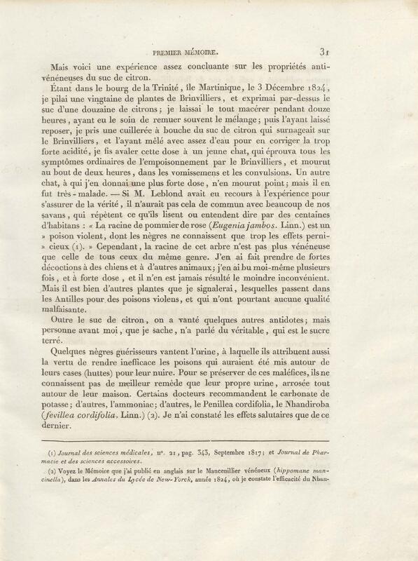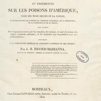 Recherches et expériences sur les poisons d'Amérique, tirés des trois règnes de la nature, et envisagés sous les rapports de l'histoire naturelle, de la physiologie, de la pathologie et de la chimie