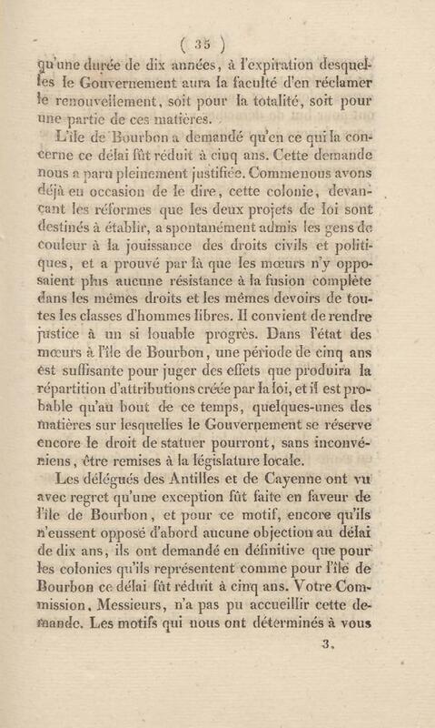 - Chambres des pairs. Séance du 13 février 1833. Rapport fait à la Chambre par M. Gautier, au nom d'une commission spéciale chargée de l'examen des projets de lois relatifs à l'état des hommes de couleur et au régime legislatif des colonies
