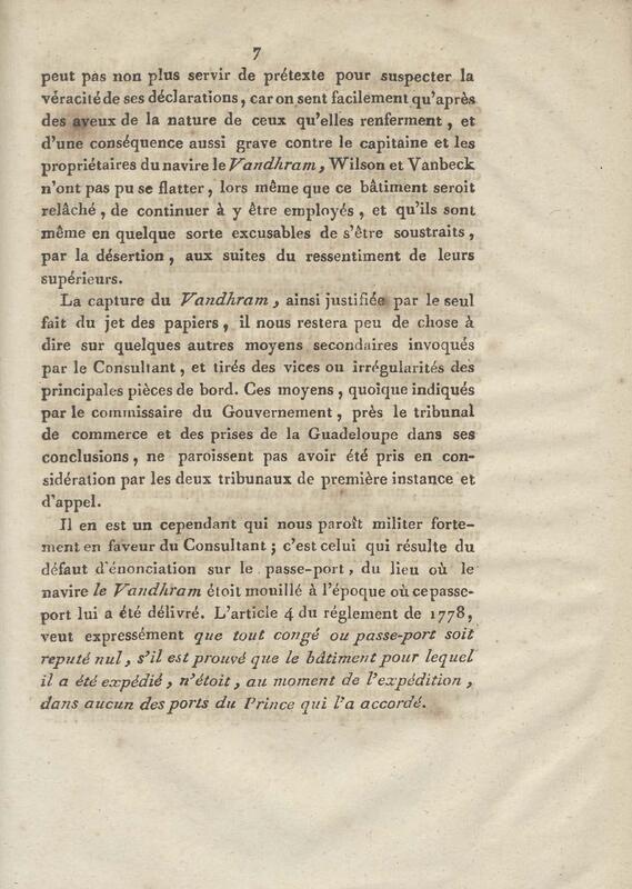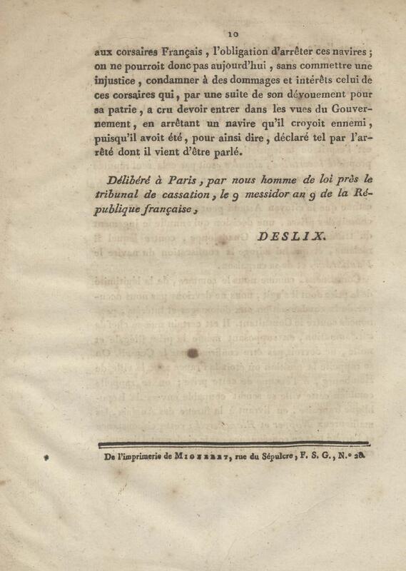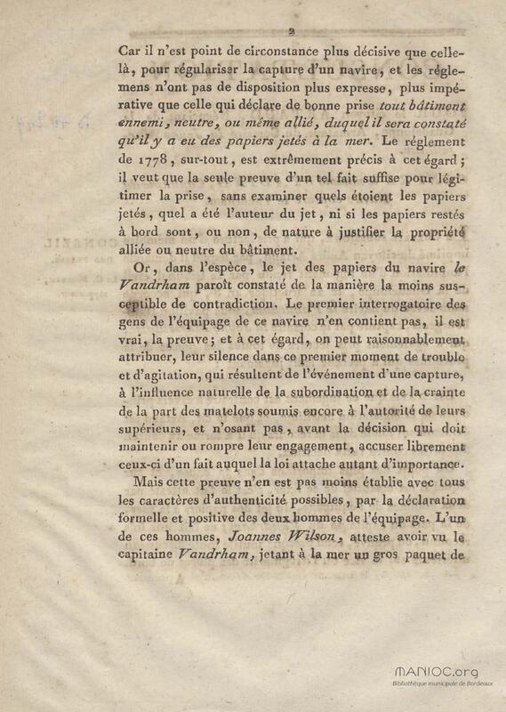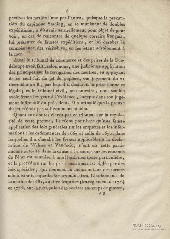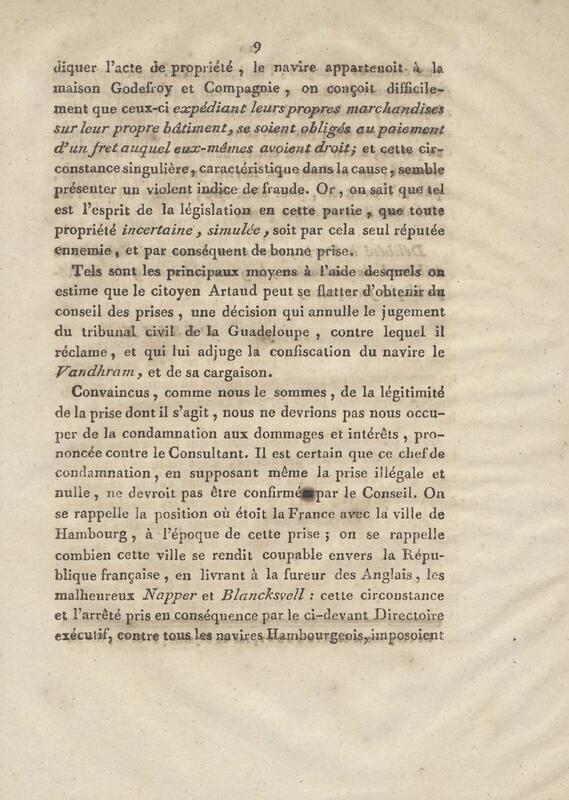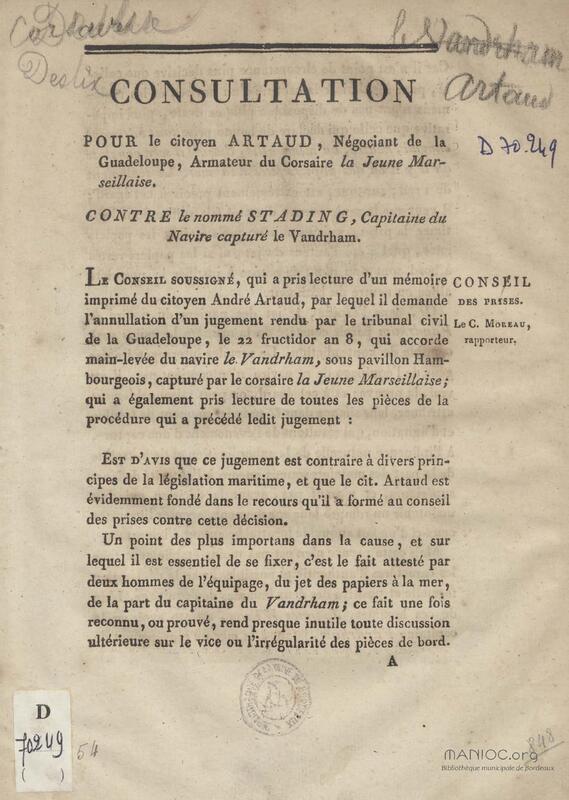 Consultation pour le citoyen Artaud, négociant de la Guadeloupe, armateur du corsaire la Jeune Marseillaise. contre le nommé Stading, capitaine du navire capturé le Vandrham