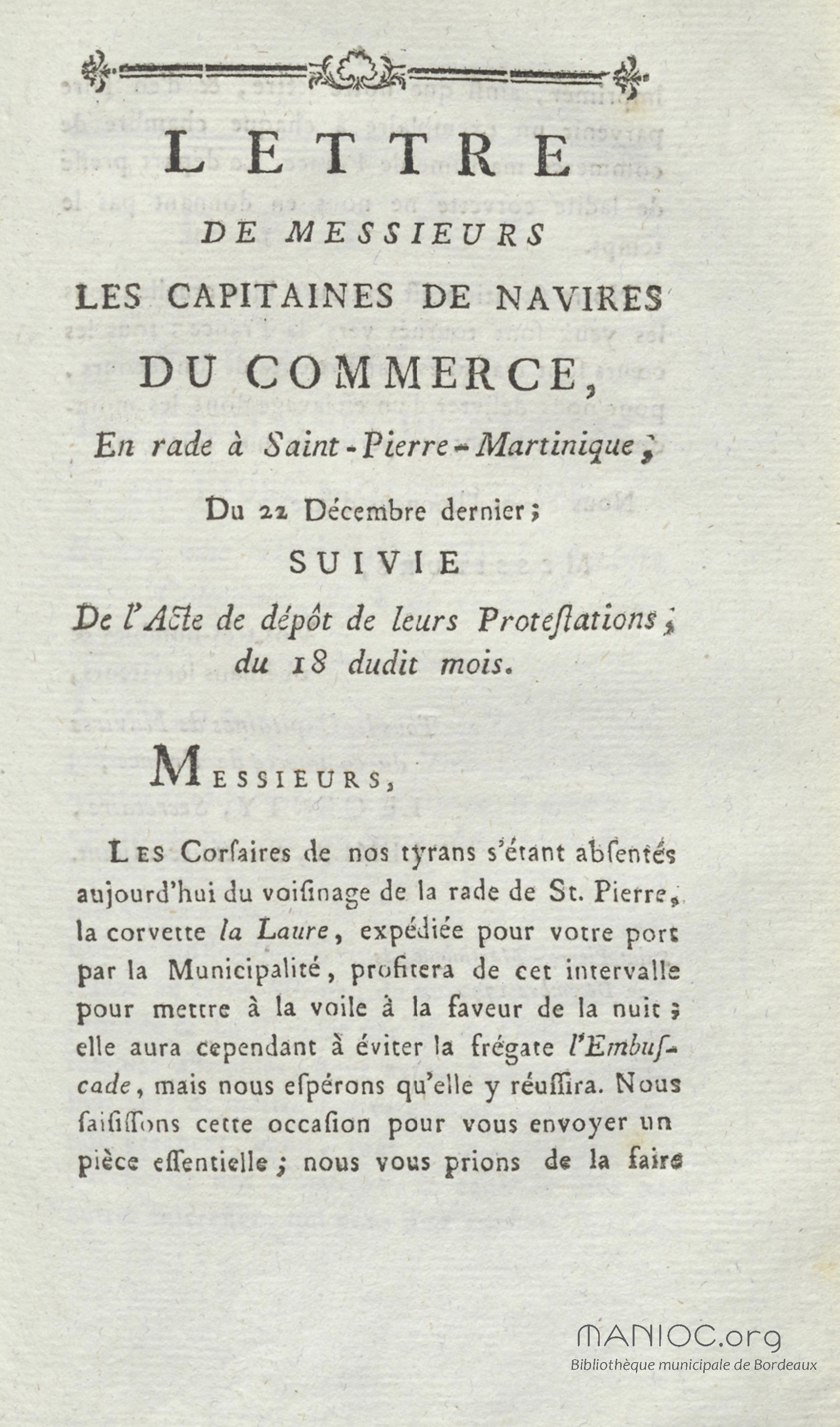 Lettre de messieurs les capitaines de navires du commerce, en rade à Saint-Pierre-Martinique, du 22 décembre dernier, suivie de l'acte de dépôt de leurs protestations, du 18 dudit mois